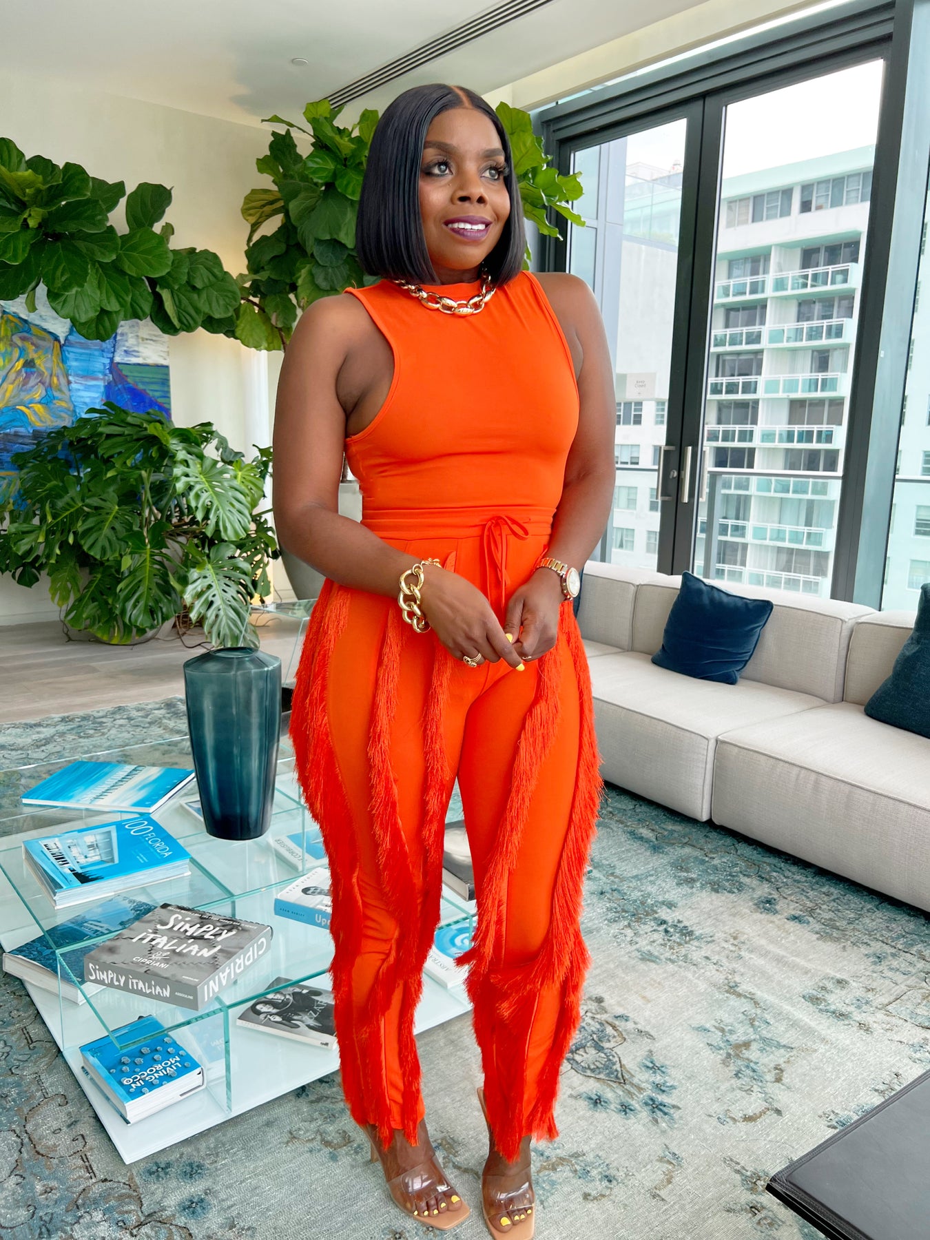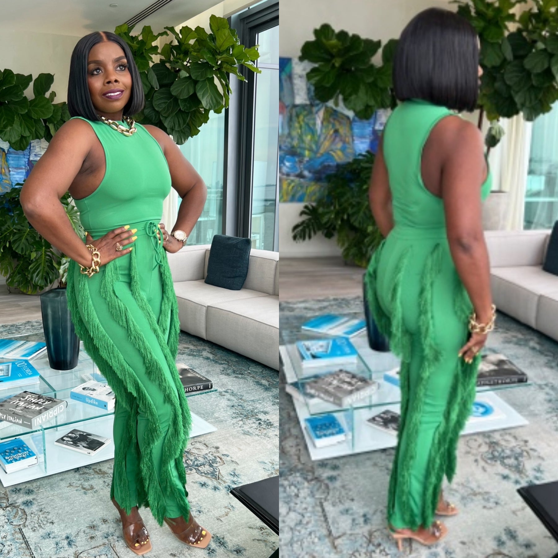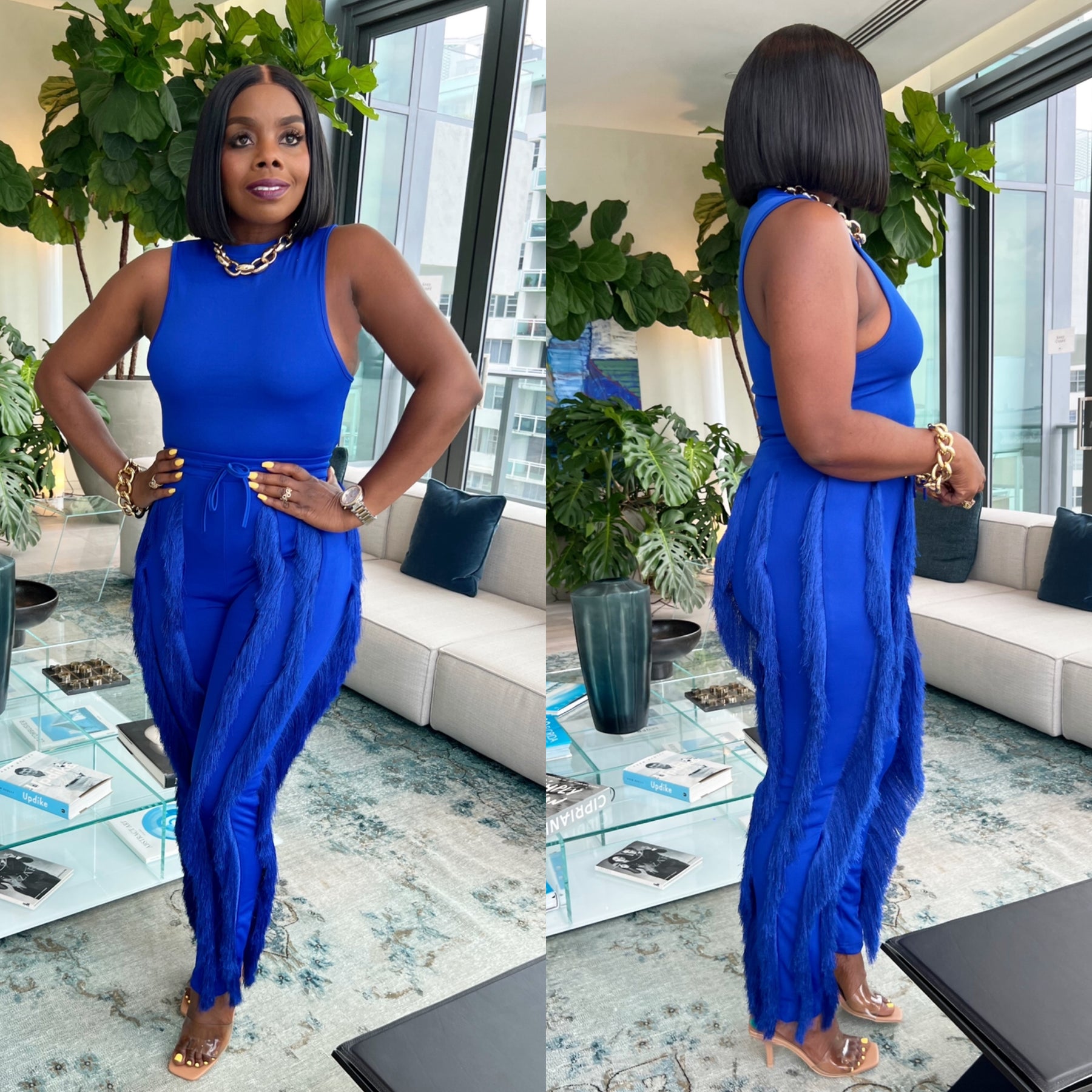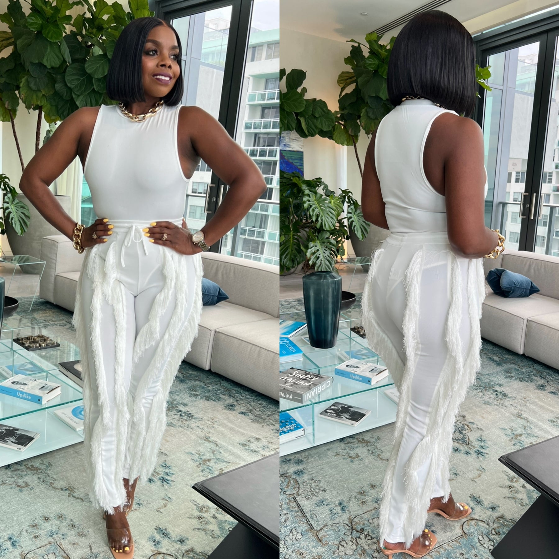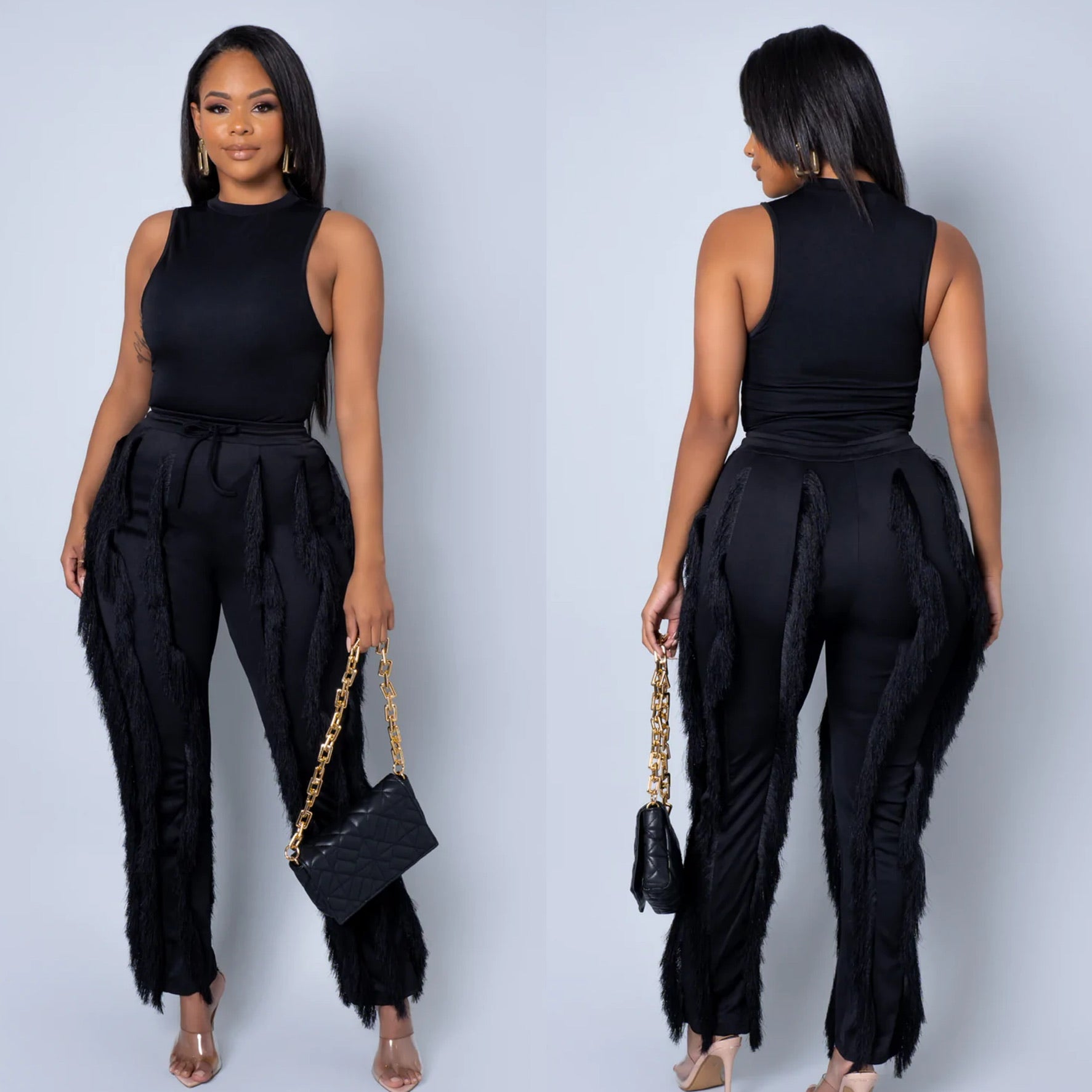 Gorgeous Two Piece Pants Set With Body Suit And Fringe Derailed Pants.