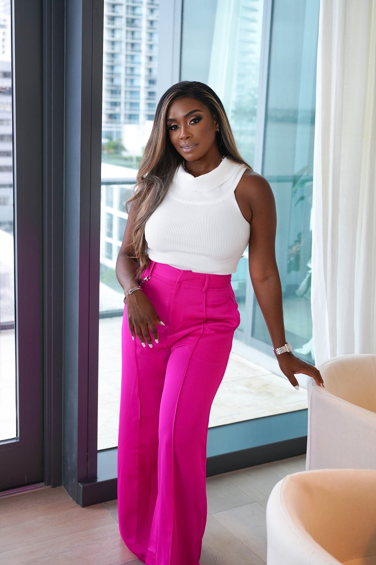 These bright pink silk-inspired fabric pants are a luxurious and fashion-forward piece that will make a statement wherever you go. The vibrant pink color exudes boldness and confidence, while the silk-inspired fabric adds a touch of elegance and sophistication. The wide waistband creates a flattering and comfortable fit, accentuating the waist and adding a stylish detail to the pants. The hook-style closure adds a sleek and modern touch, giving the pants a polished and refined look.