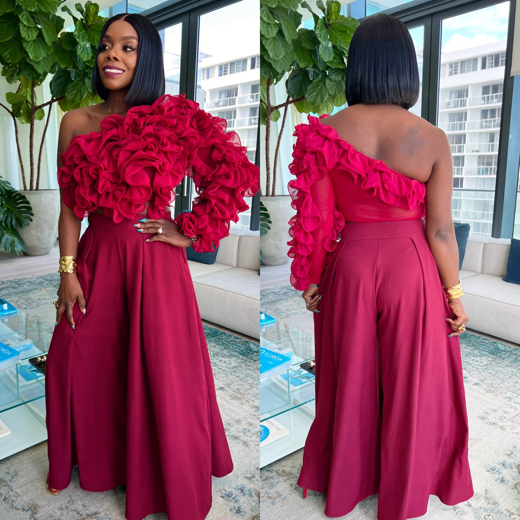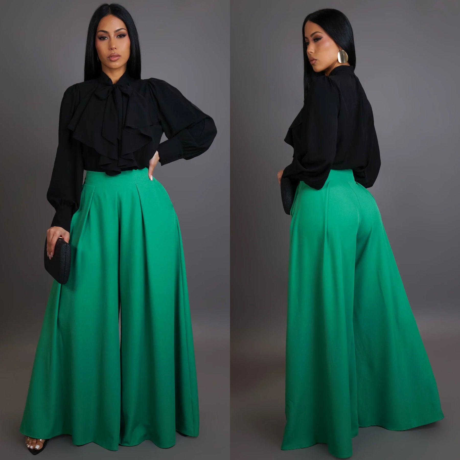 Gorgeous high-waisted, wide-leg trousers that offer a bold and elegant silhouette. Crafted from a flowing fabric, they have a structured waistband and soft pleating, providing both comfort and style. .They are versatile enough to be paired with a range of tops, from fitted blouses to statement shirts, and can be dressed up with heels or kept casual with flats.