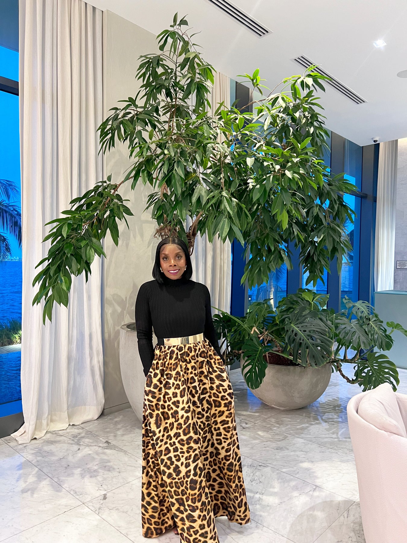 This dress speaks bold and elegance! The beautiful ensemble is composed of two distinct parts. The top is a fitted black long-sleeve, likely made of a ribbed or knit material that gives it a sleek and streamlined look. This fitted top contrasts beautifully with the dramatic, voluminous leopard-print skirt. The skirt features pockets and a full, A-line silhouette that flares outward, creating a striking, attention-grabbing presence. It has deep pockets, which adds both function and style.