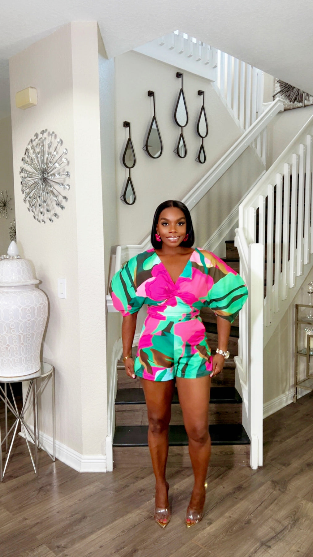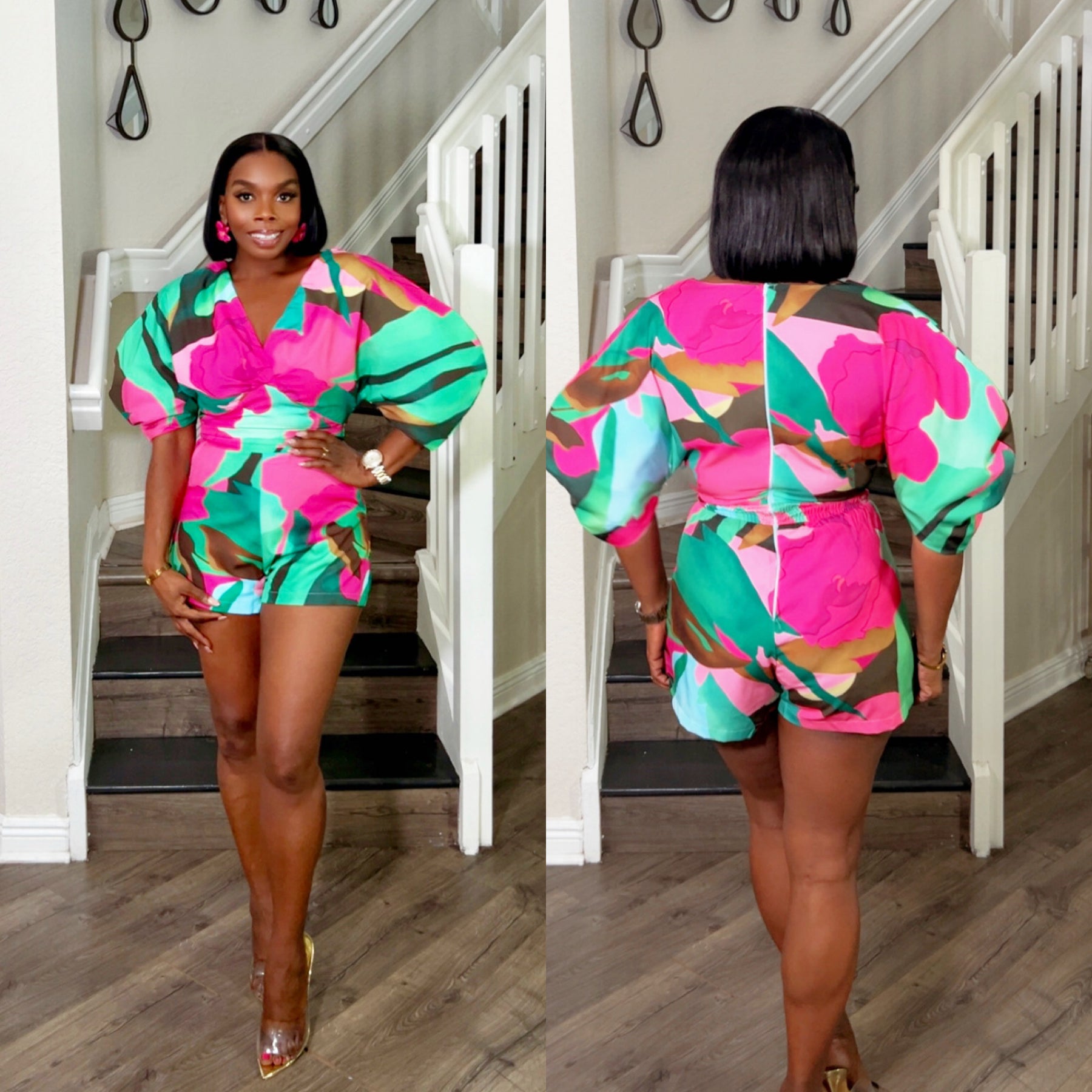 Bold, bright, and unapologetically fabulous — the Aubri Romper brings all the drama with its oversized puff sleeves in two colors. Vibrant pink, green, and second color featuresstriking shades of blue, orange, and yellow for a head-turning effect. Designed with a flattering wrap-style neckline and cinched waist, this romper hugs your curves in all the right places while keeping it playful and chic. Perfect for brunch dates, girls’ nights, or your next vacation slay.