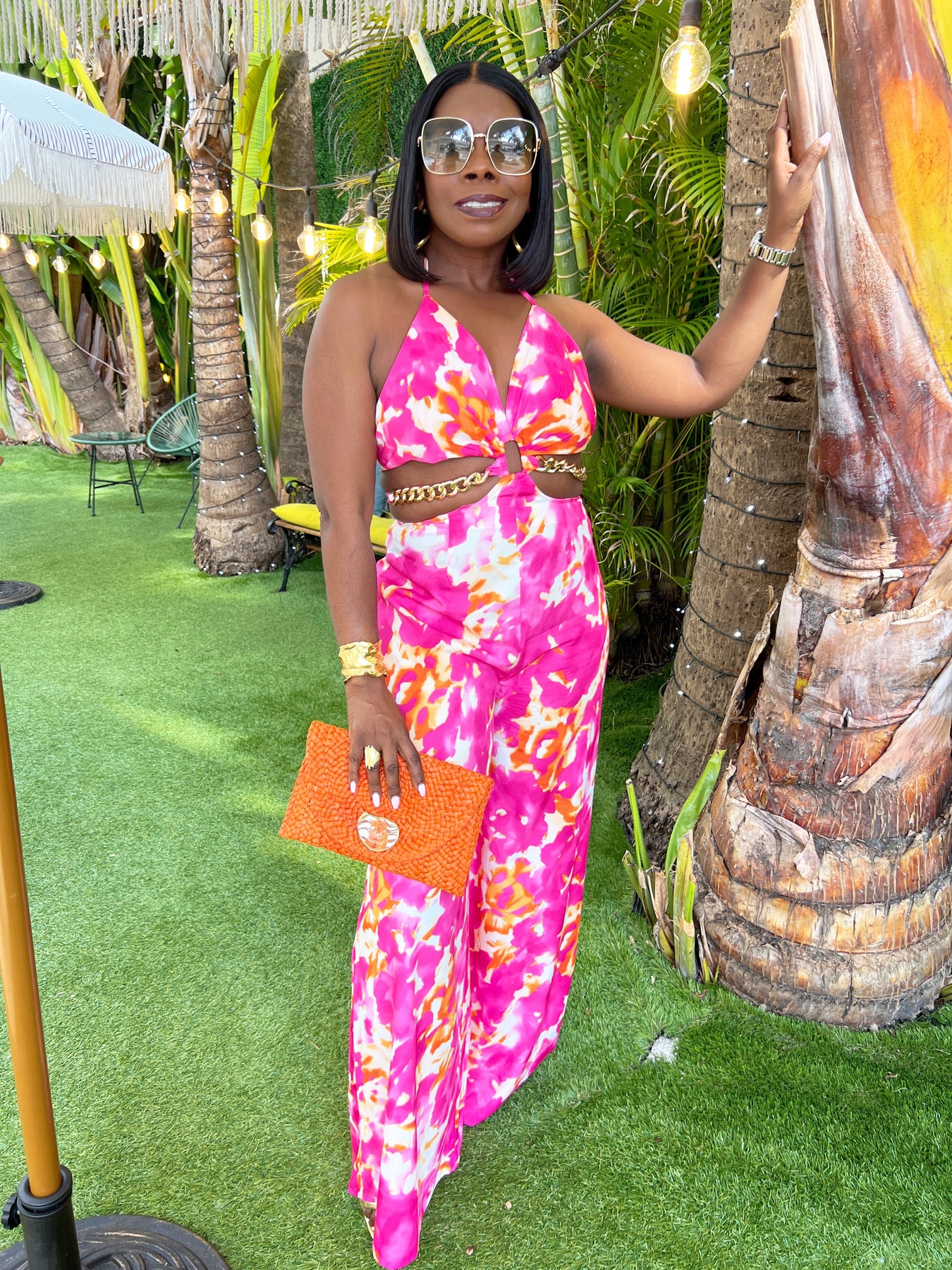 Cutesy And Vibrant Halter Style Jumpsuit With Gold Chain Details.