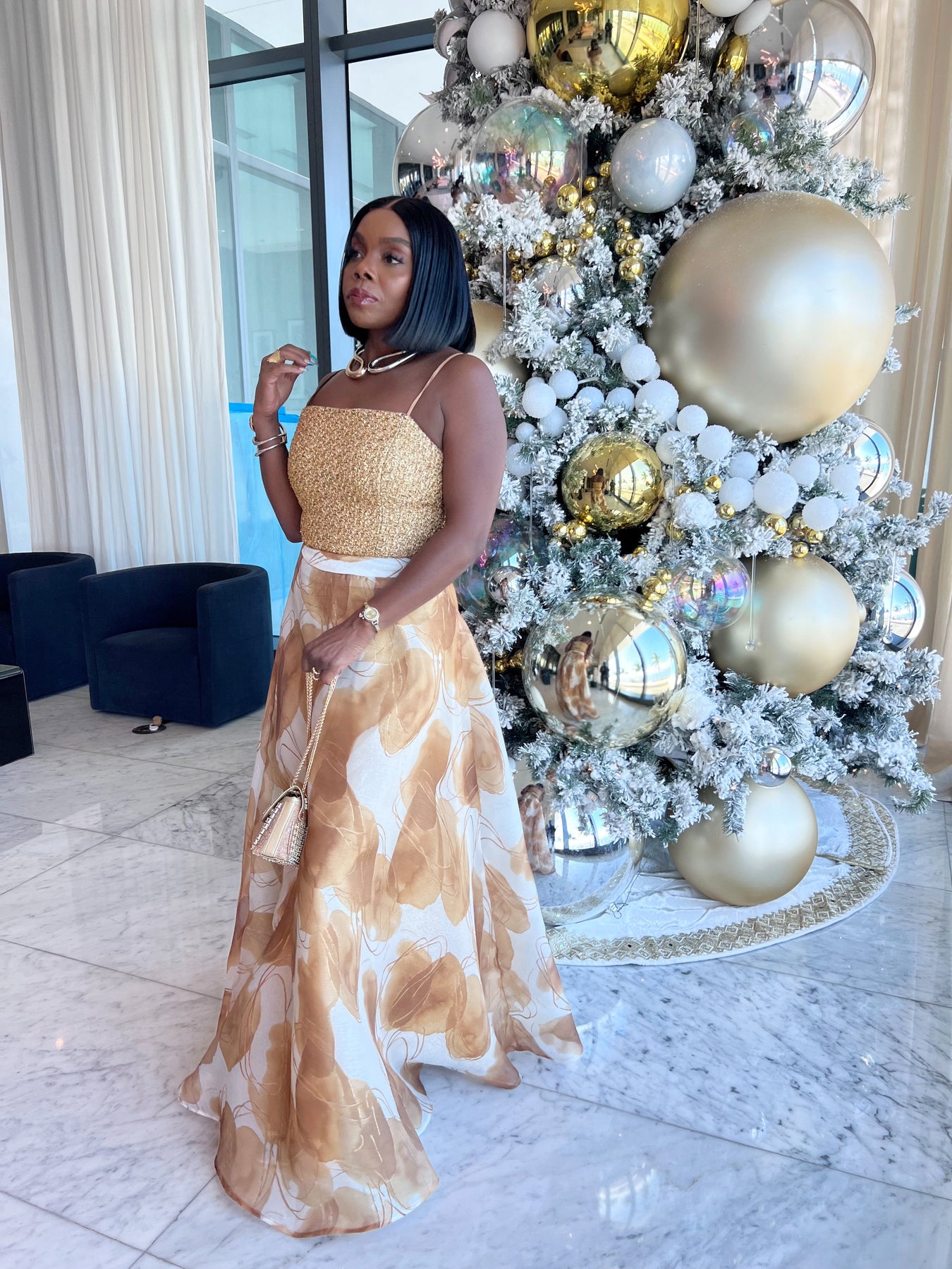Beautiful and elegant skirt set combining a shimmering gold corset-style top and a flowing, high-waisted maxi skirt. The top is form-fitting and adorned with a subtle gold sparkle, giving it a sophisticated and glamorous look. The skirt is designed with a white base featuring a soft brown abstract floral or watercolor-like print, creating a beautiful contrast with the gold top.
