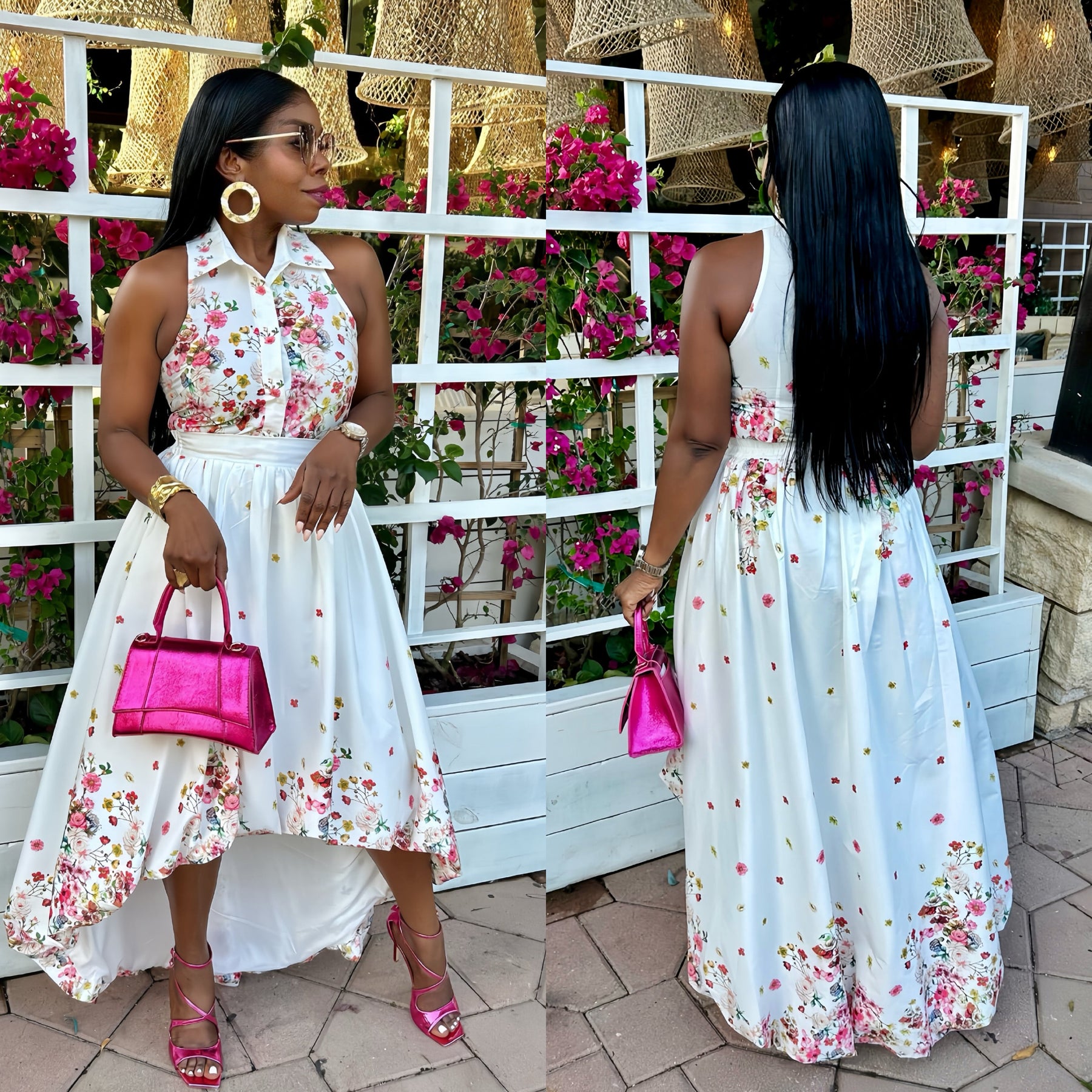 Elegant  floral high-low skirt set exudes sophistication and femininity, featuring a sleeveless collared button-up blouse with a delicate floral print and a flowy, asymmetrical skirt that cinches at the waist for a flattering silhouette. The crisp white fabric is adorned with scattered floral patterns, with a more concentrated design along the hemline, adding movement and charm. Styled with a bold hot pink metallic handbag and matching strappy heels, this ensemble strikes the perfect balance between classic grace and modern vibrancy, making it ideal for brunch, garden parties, summer events, or a chic vacation look.