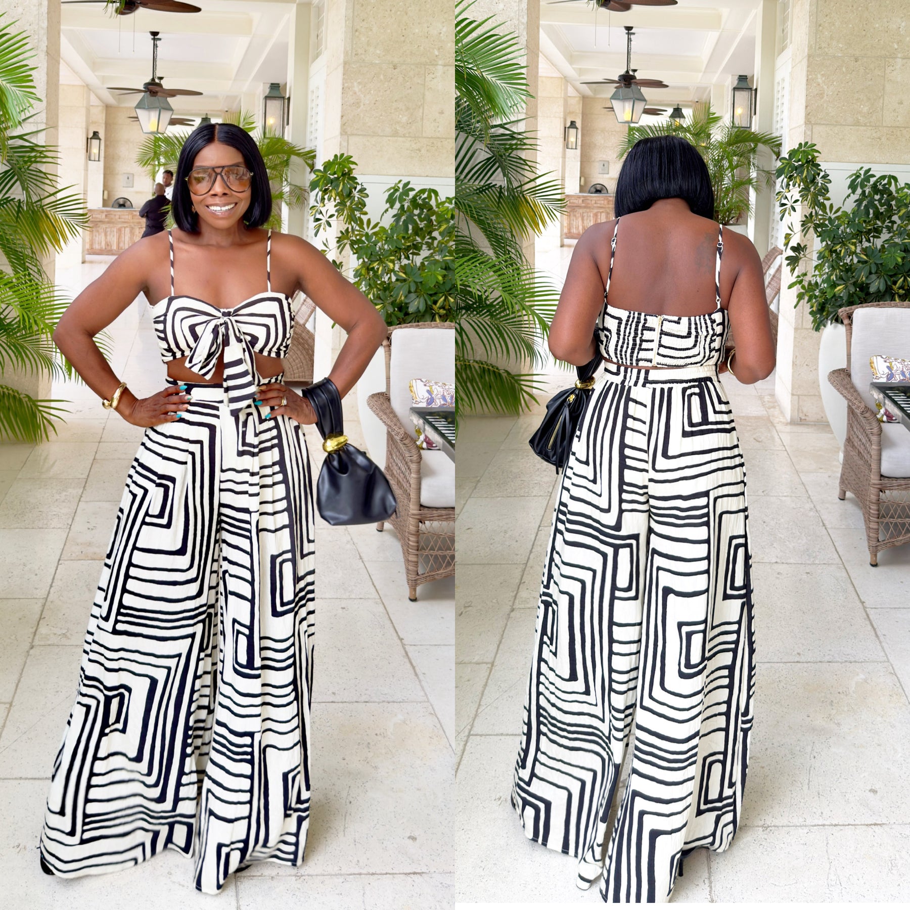 Turn heads in the effortlessly chic Monaco Set – a bold two-piece ensemble that blends modern flair with timeless style. This eye-catching black-and-white wide-leg pants set features a geometric maze print that commands attention. The top is a cropped, tie-front bandeau with adjustable spaghetti straps, designed for a flattering, feminine silhouette. Paired with flowy high-waisted palazzo pants that cinch at the waist and create graceful movement with every step, this look is perfect for resort escapes, brunch dates, or summer events.