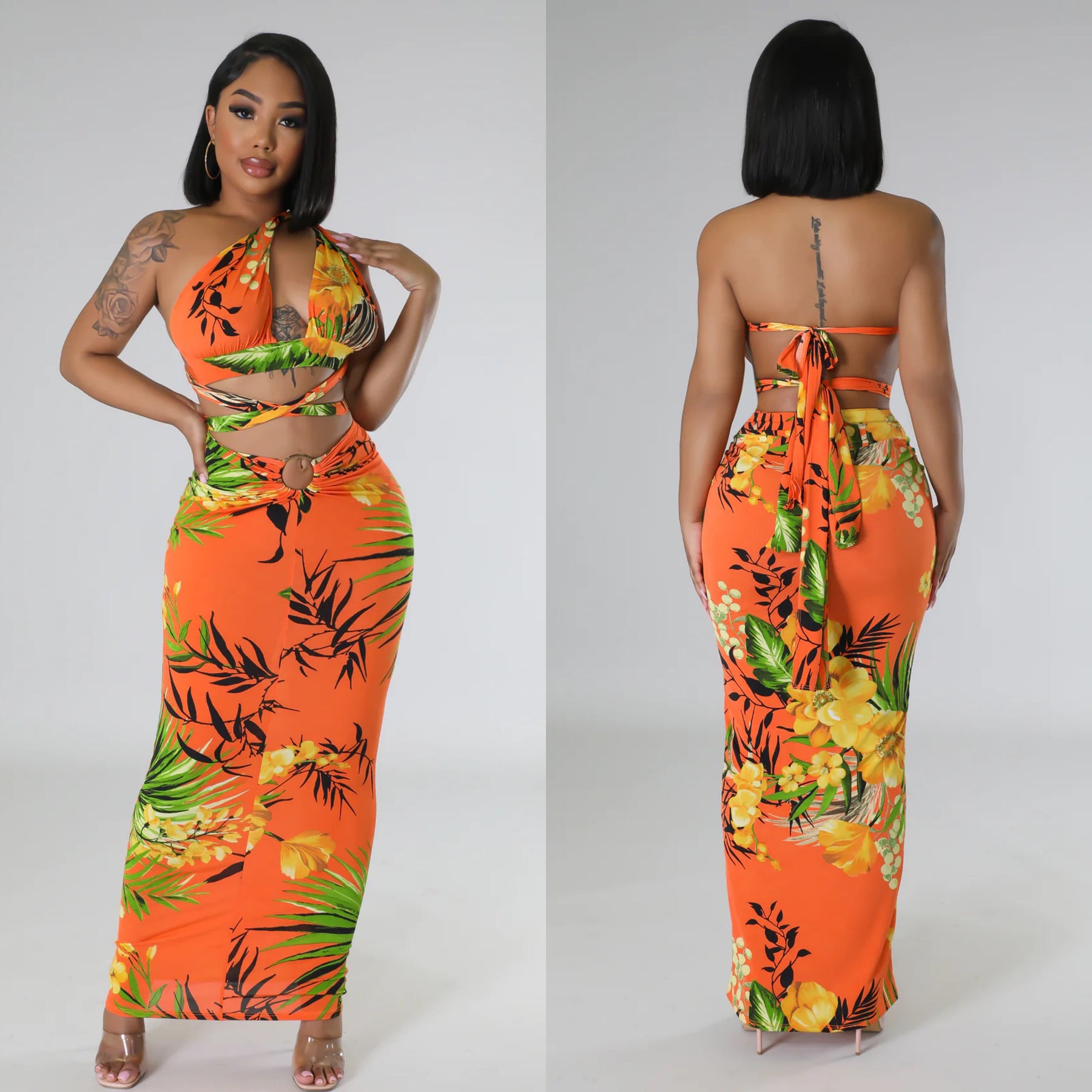 Gorgeous Tropical Print Two Piece Skirt Set. Top Can Be Worn Multiple Ways.