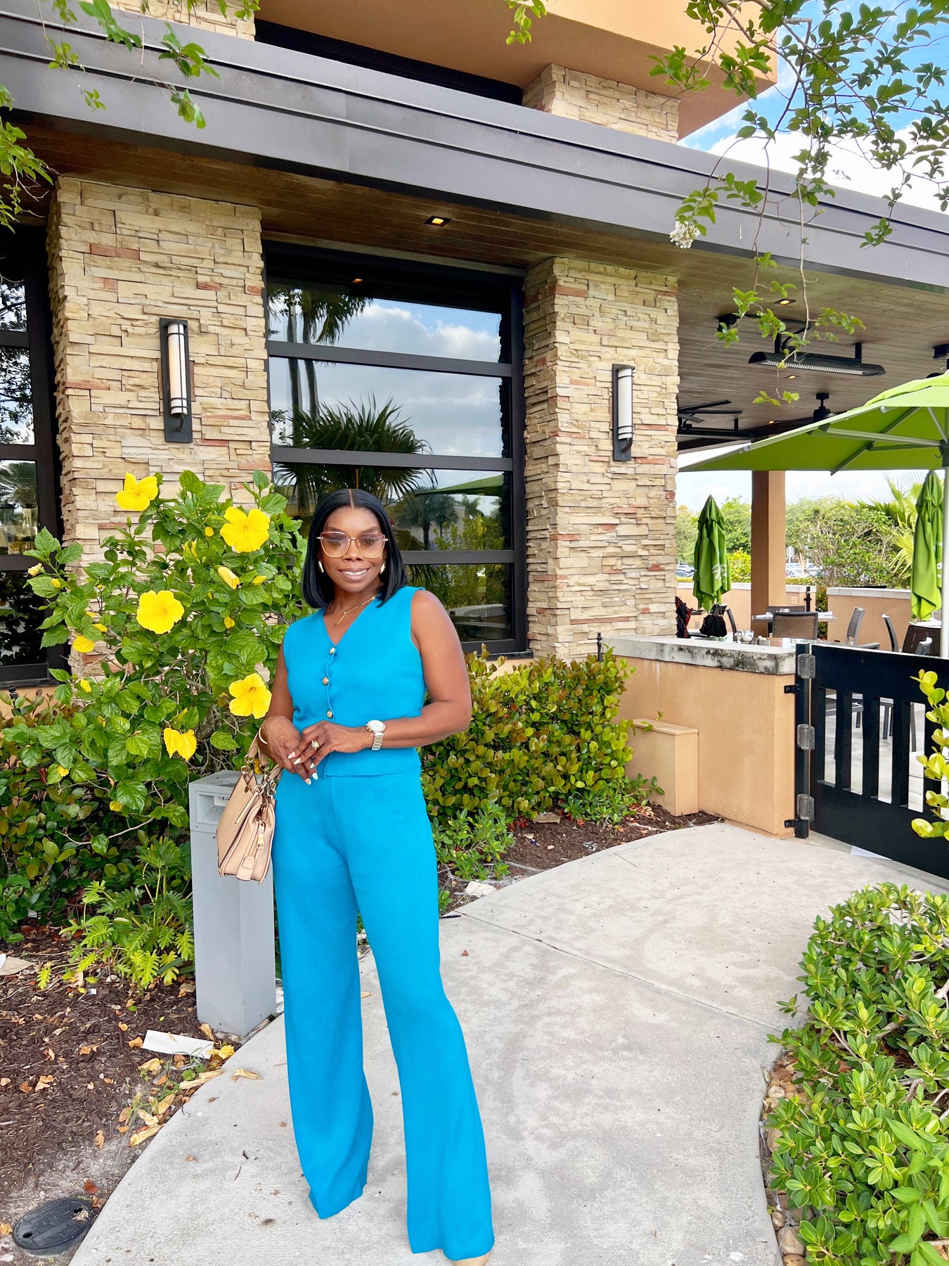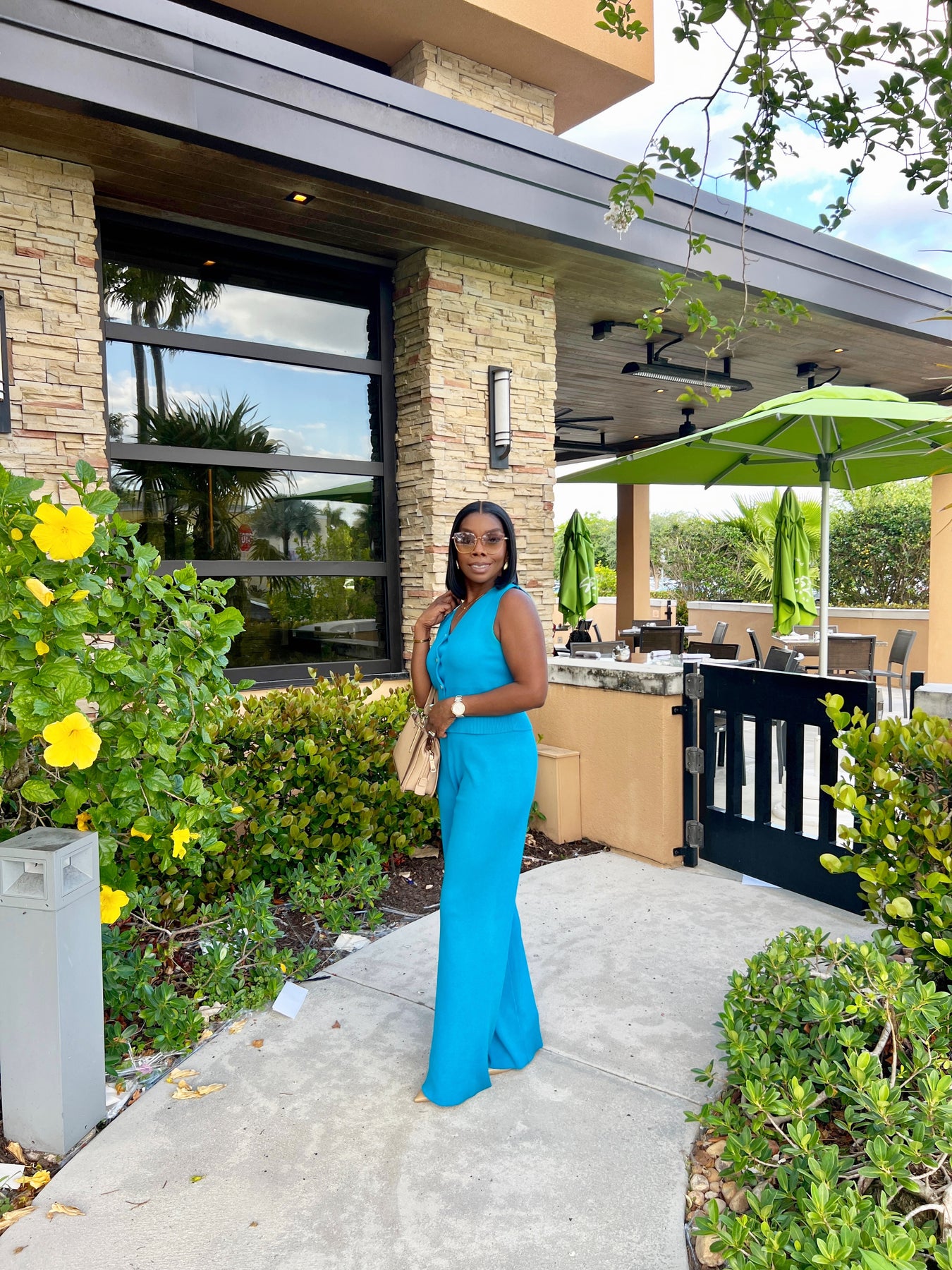 Upgrade your wardrobe with this bold turquoise two-piece set. The set includes a sleeveless V-neck top detailed with stylish gold buttons and high-waisted, wide-leg pants designed for a flattering, elongated silhouette. Crafted from a soft, stretch knit fabric, this outfit offers both style and all-day comfort. Perfect for brunch, vacations, casual business meetings, and spring/summer events. Pair it with nude heels and a neutral handbag for a sophisticated finish.