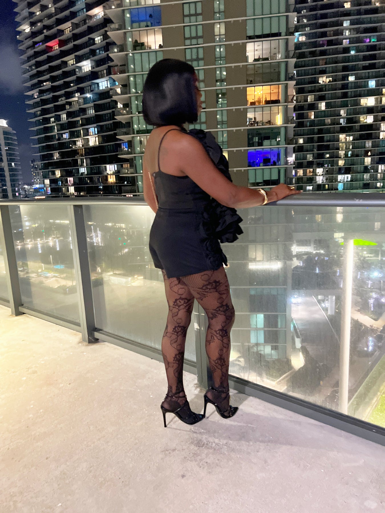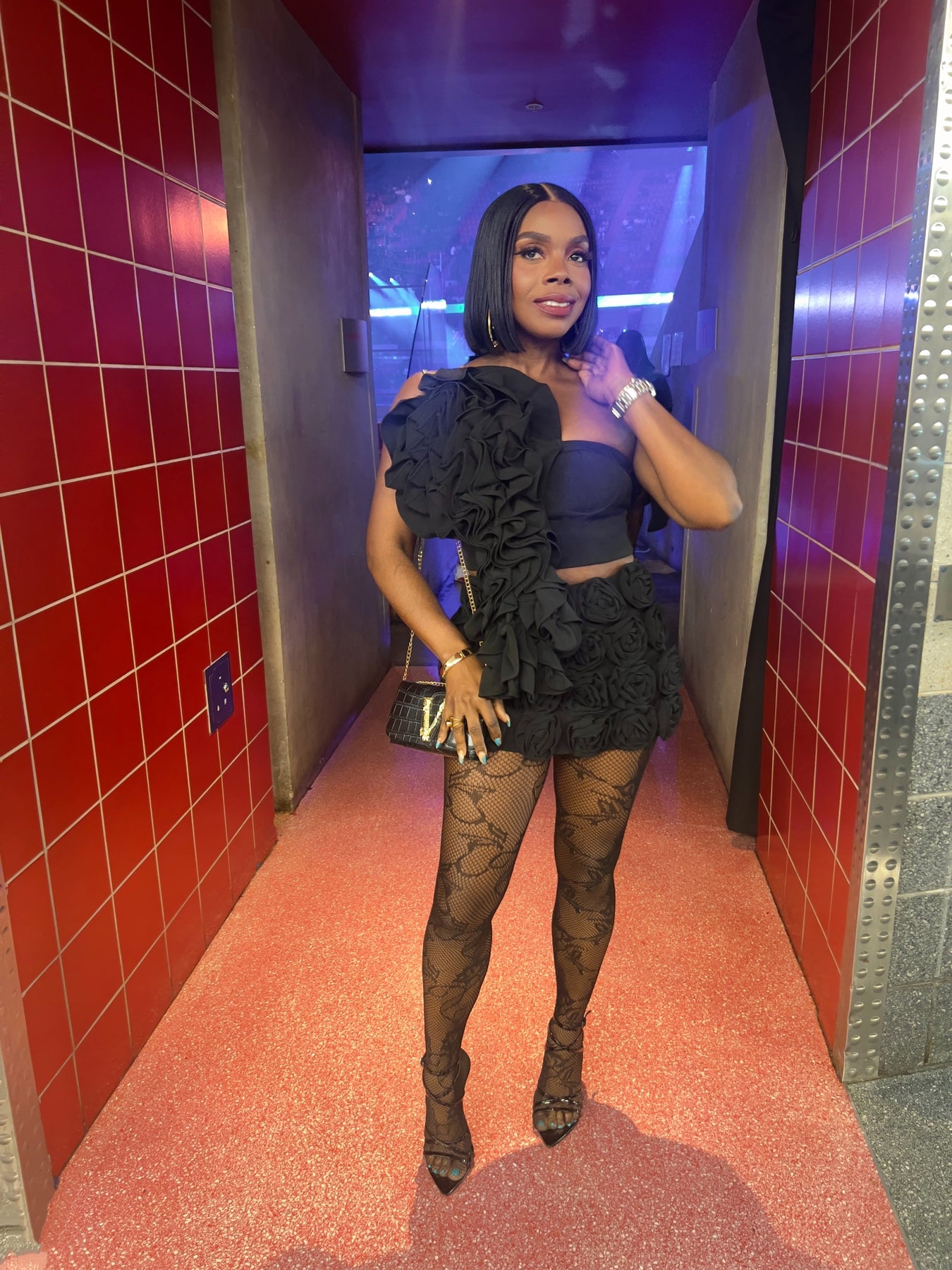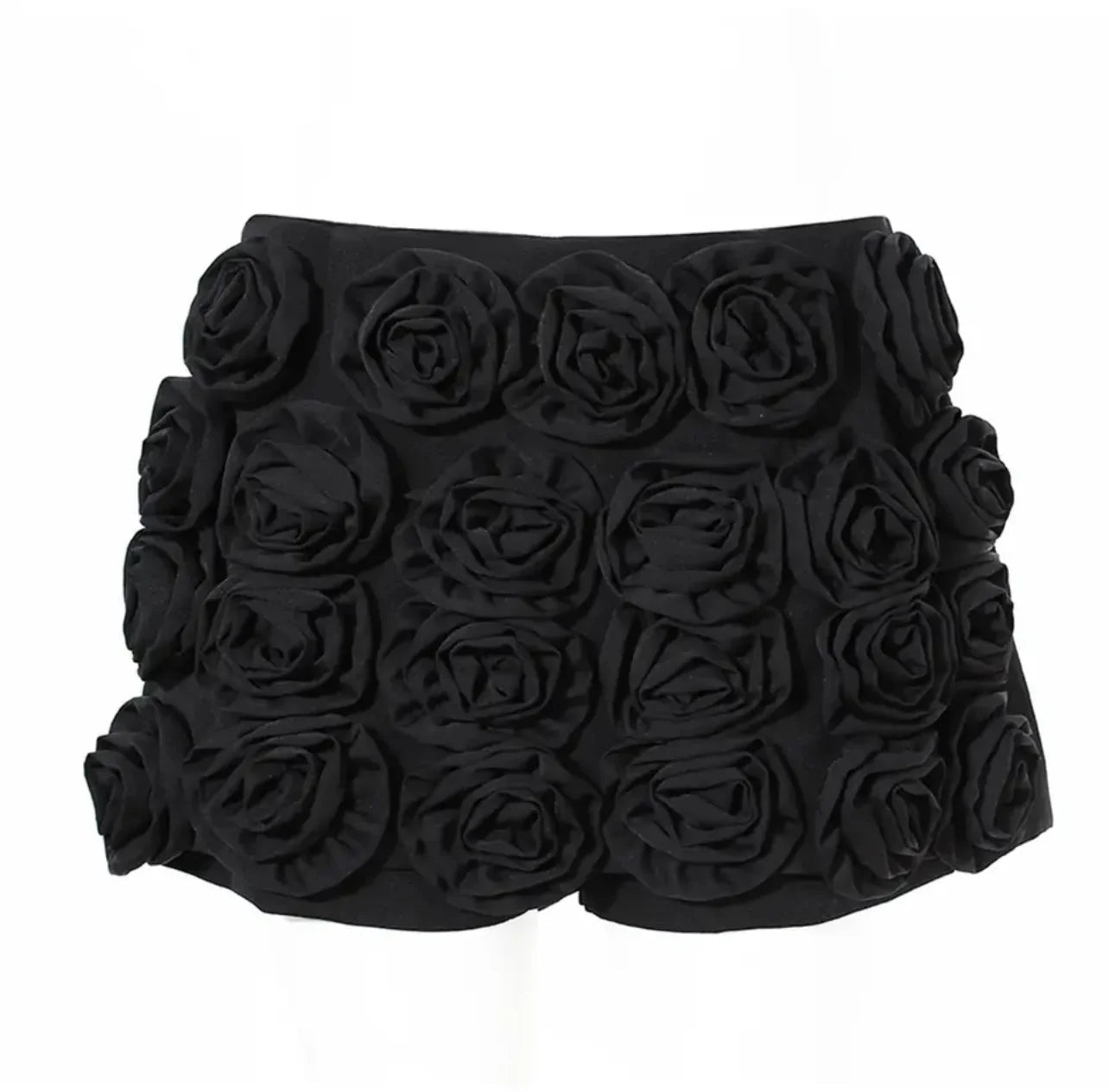 Fabulous skort featuring a unique and dramatic 3 D design with a black fabric base. The front showcases voluminous, sculpted fabric roses covering the entire skort, creating a textured and eye-catching appearance. The back view reveals a sleek, tailored silhouette with fitted high-waisted shorts.