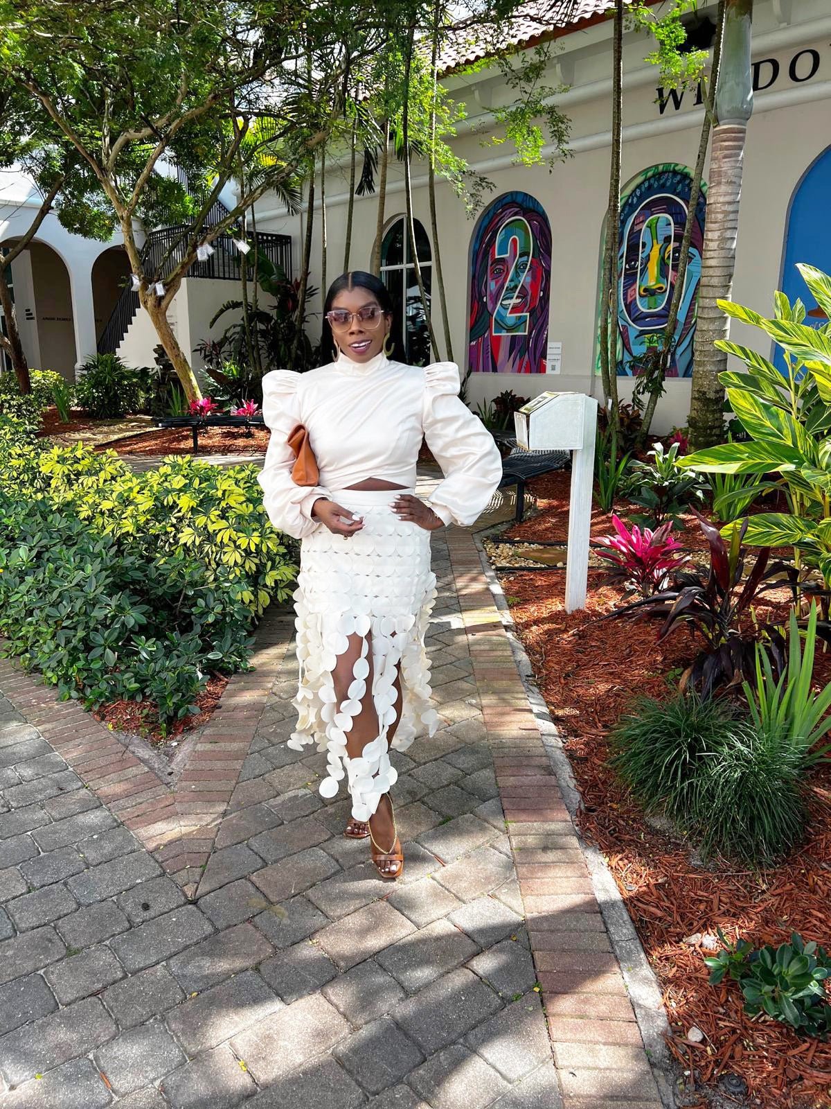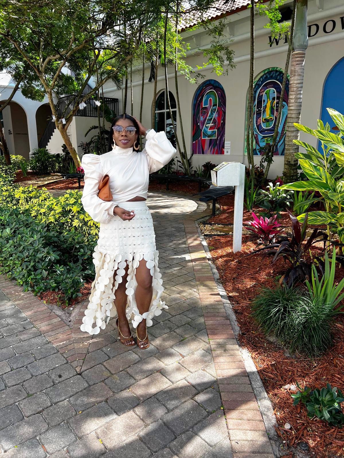 This exquisite skirt is a masterpiece of contemporary fashion, blending structural elegance with a bold, artistic design. It is a high-waisted, tailored piece that hugs the waist before cascading into a striking, layered silhouette. The standout feature of the skirt is its intricate arrangement of circular fabric cutouts, meticulously placed to create a three-dimensional, airy effect. This design allows for movement, giving the skirt a dynamic, fluid quality while maintaining a semi-sheer, modern aesthetic.