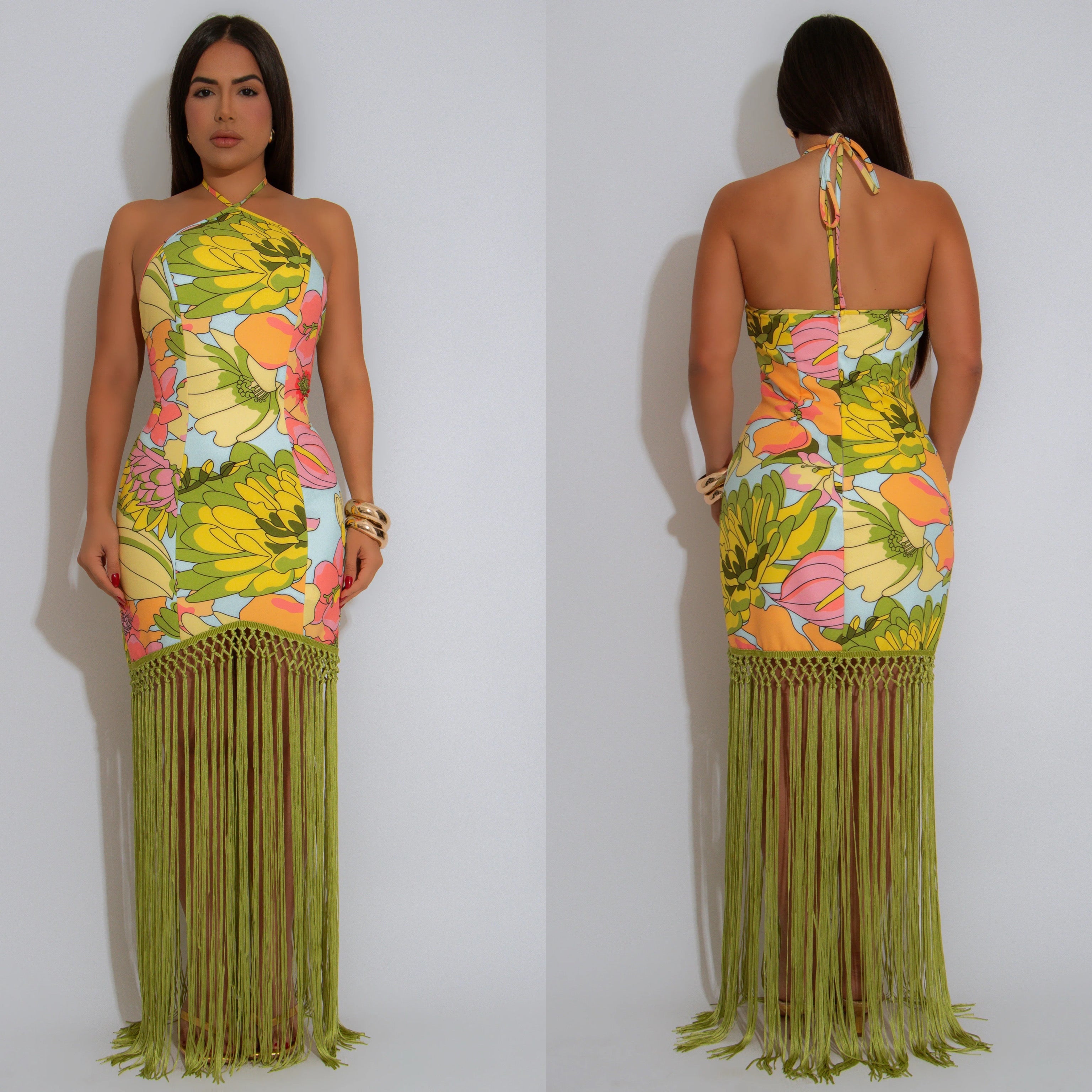 Turn heads in this vibrant halter maxi dress, designed with a bold floral print that radiates tropical chic. The fitted silhouette hugs your curves, while the halter neckline ties at the back for an adjustable fit. Finished with a striking olive-green crochet waistband that flows into long fringe detailing, this piece blends playful movement with sophisticated style.