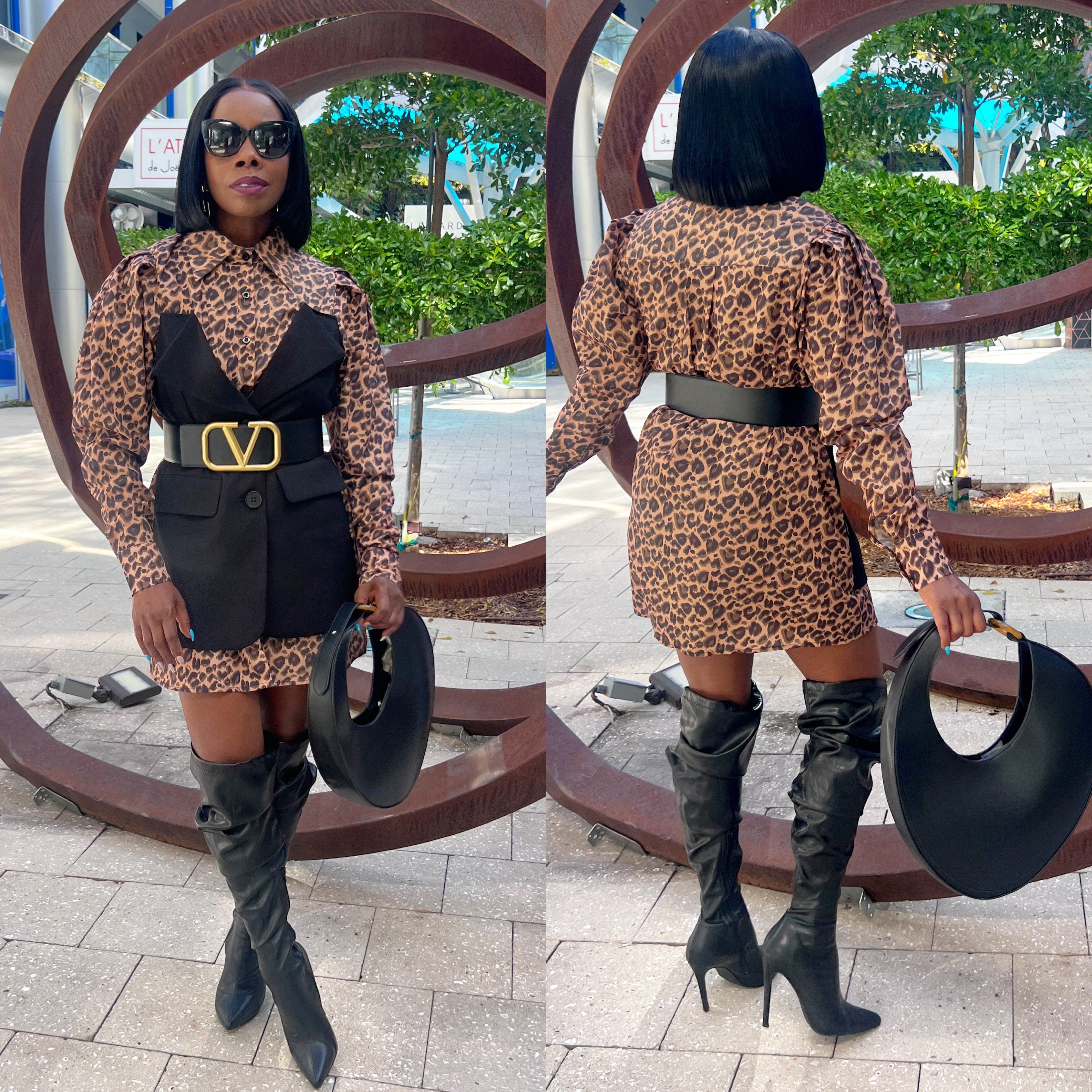 Gorgeous Puff Sleeve Leopard Print Shirt Dress With Matching Attached Button Overlay And Matching Black Belt.