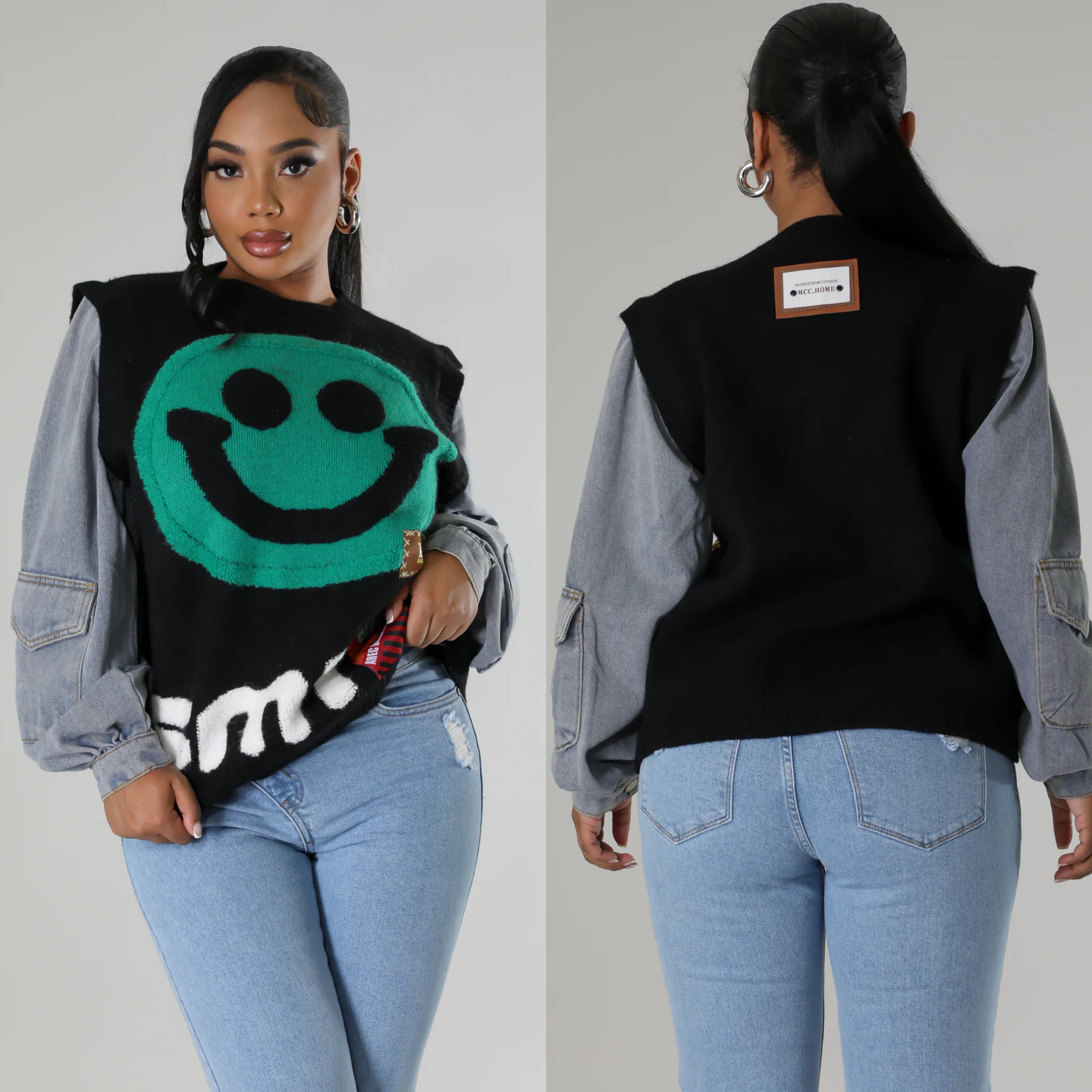 Cute  Stretch sweater One Size Fits Up To Size Large Round neckline Long sleeve Denim Knitted Verbiage 100%...