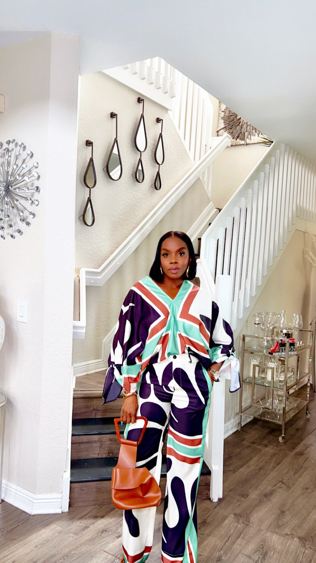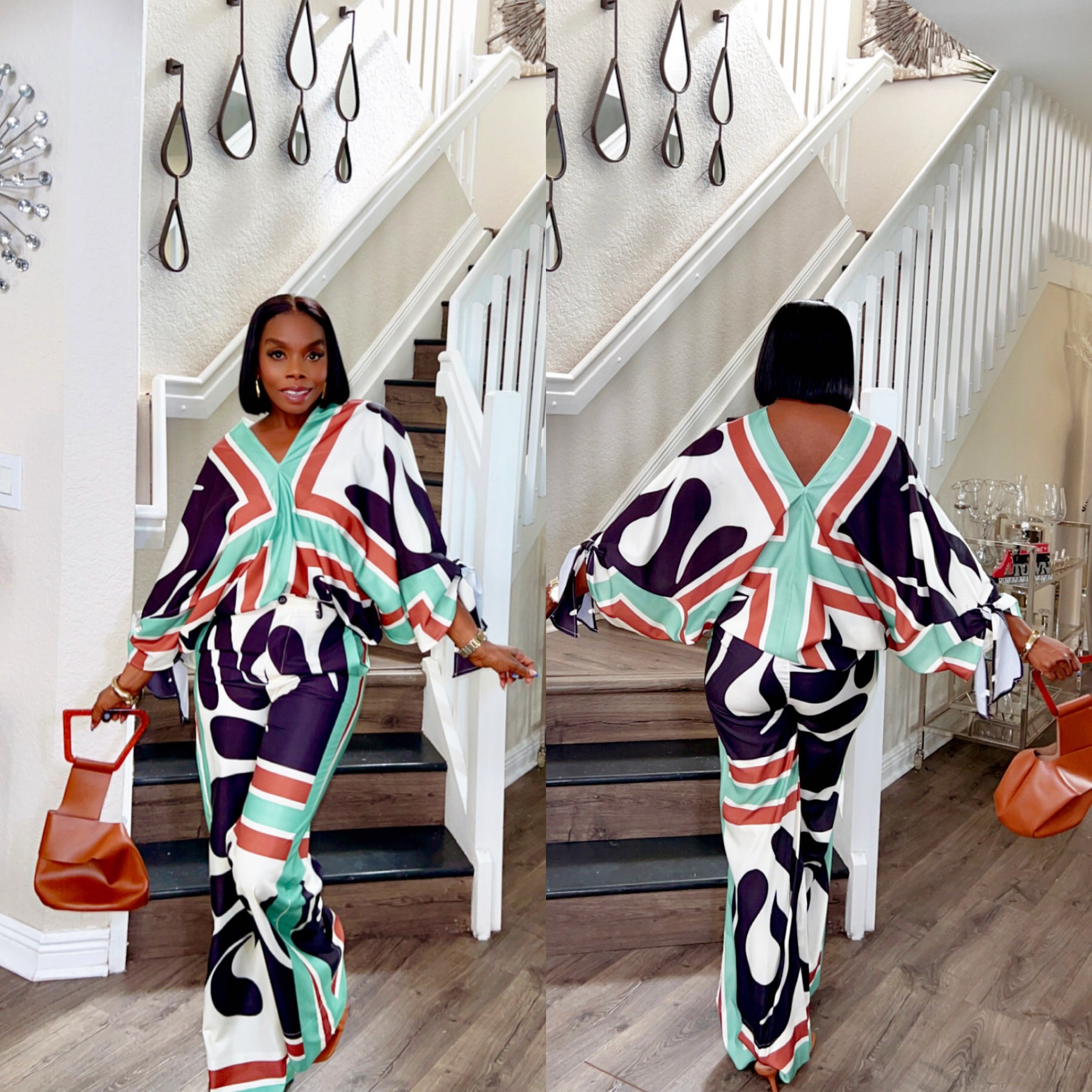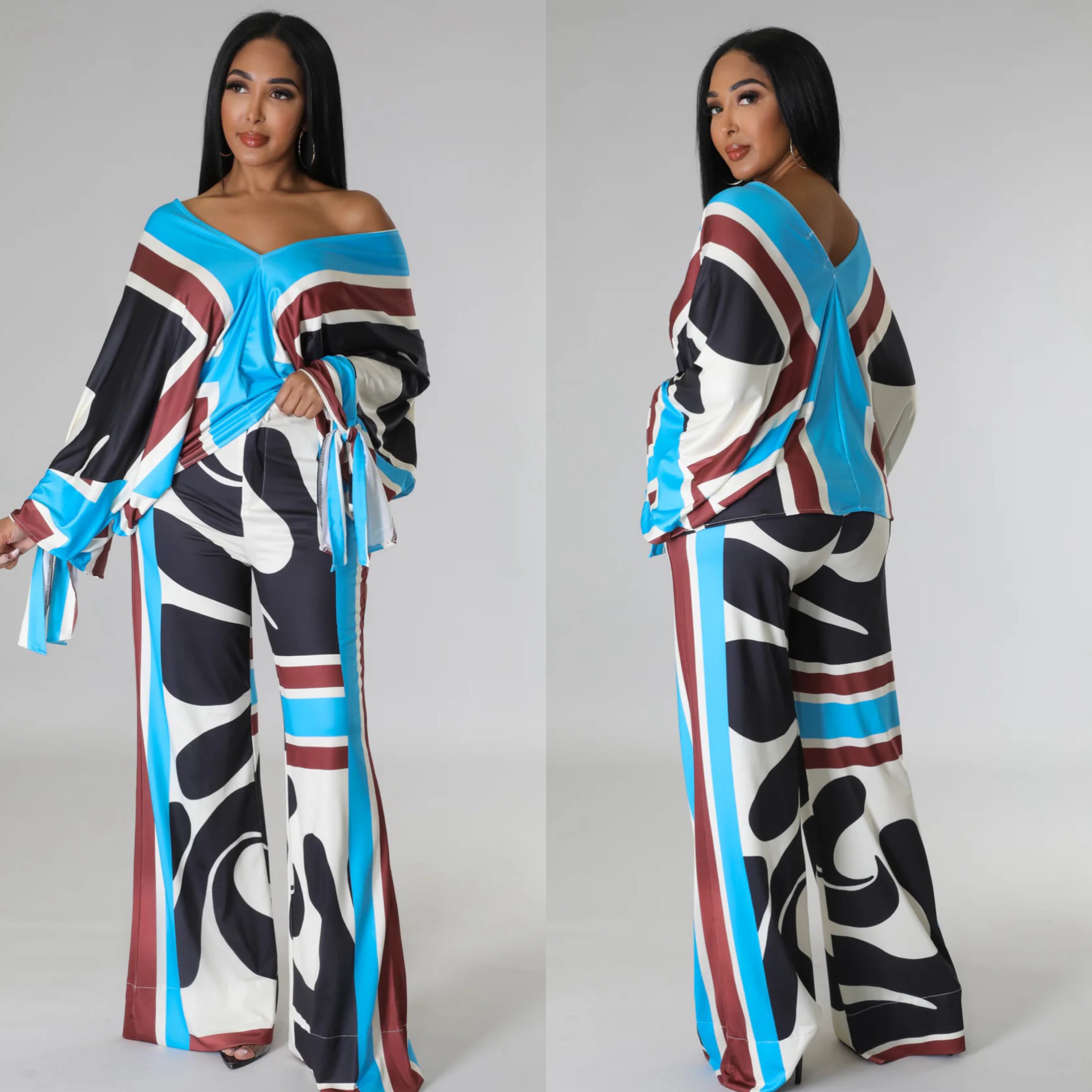 Make a bold statement with our Azure Pants Set, where effortless glam meets retro-chic. This two-piece ensemble features a relaxed, oversized top with dramatic batwing sleeves and playful tie details at the cuffs. The wide-leg pants are high-waisted with a flattering silhouette that elongates the legs, creating a powerful and polished look.