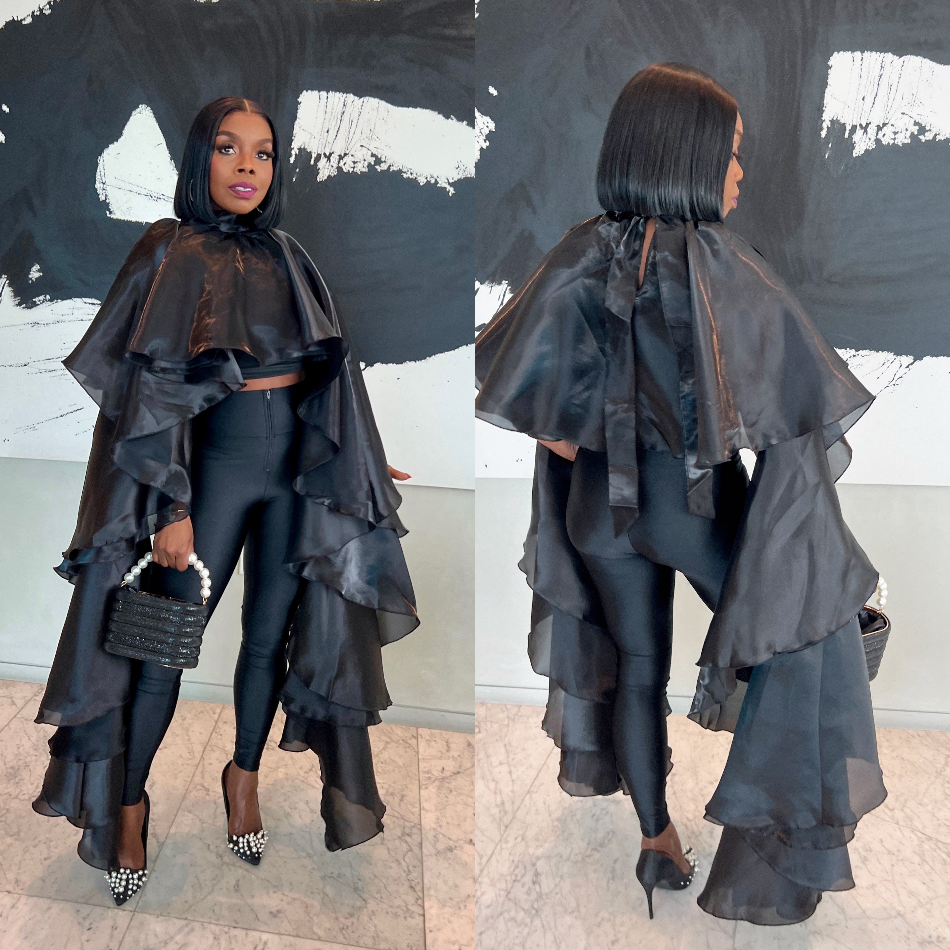 Dramatic , fashion-forward black cape top with a layered and ruffled design. The cape is made of sheer and satin-like fabric that creates a bold, flowing silhouette. It features a high neckline with a tie or clasp closure at the collar, giving it a sophisticated and structured appearance. The cascading ruffles along the sides and back add volume and movement, creating a theatrical and avant-garde vibe.