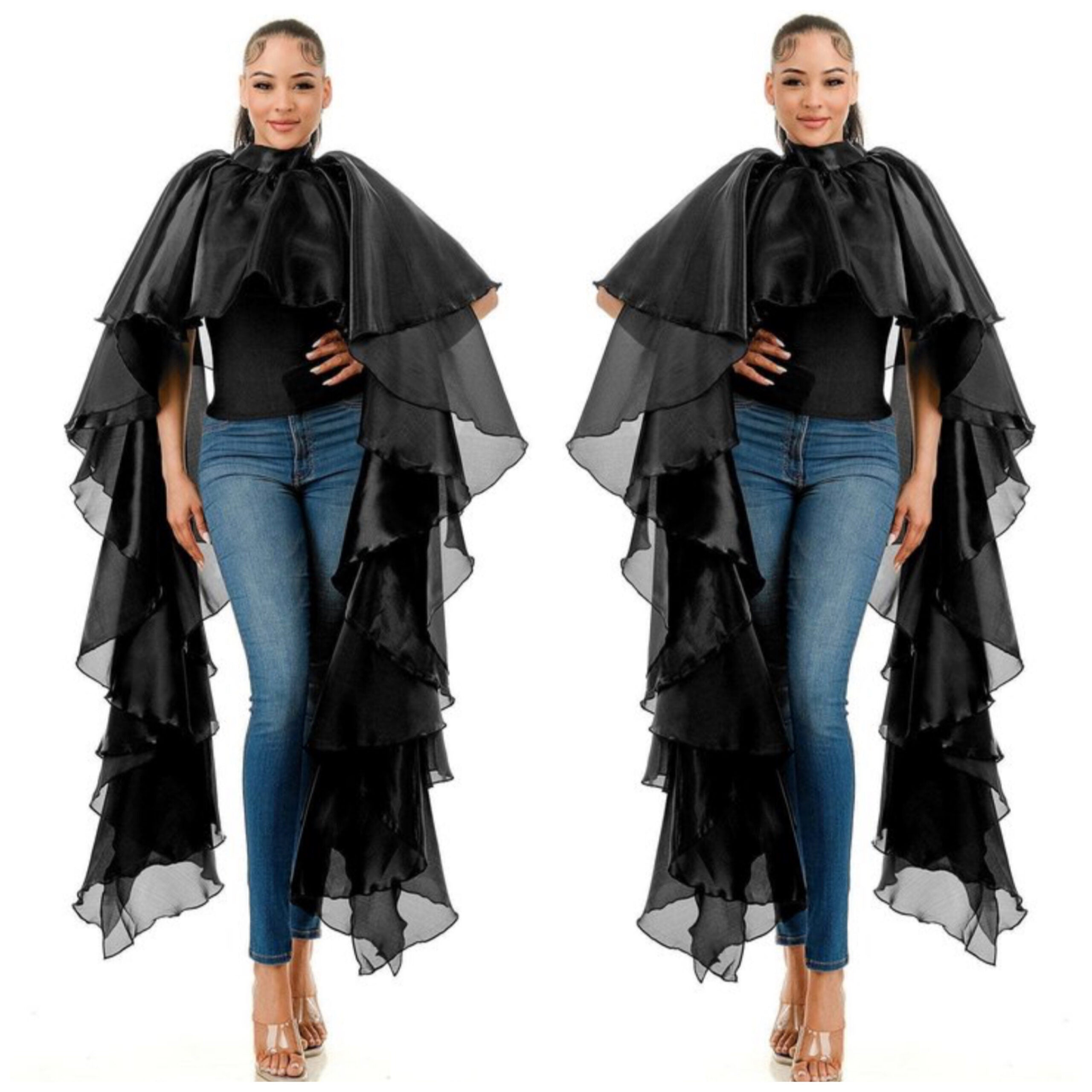 This cape is a statement piece, perfect for layering over a fitted top and jeans as shown, or for elevating a formal or evening outfit. Its dramatic design makes it ideal for special events, photoshoots, or occasions where you want to stand out in style.