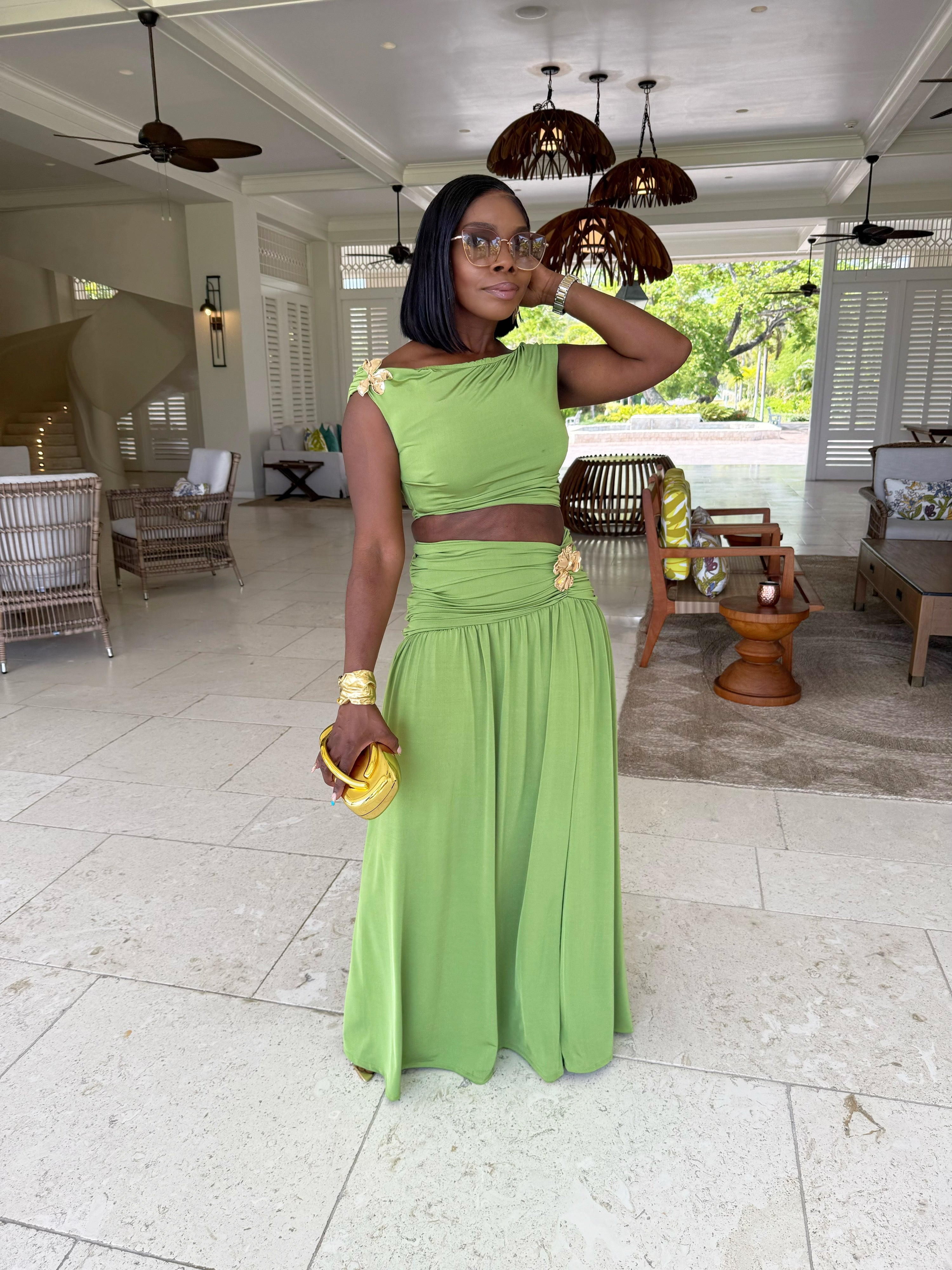 Elevate your resort style with our Beautiful Celestia Two-Piece Maxi Set – the ultimate vacation outfit for tropical getaways, beach weddings, and summer soirées. The off-shoulder crop top features a flattering fit and gold floral accents, while the high-waist maxi skirt flows beautifully with every step. A thigh-high slit adds just the right amount of bold sophistication, making this set versatile for both daytime chic and evening glam.