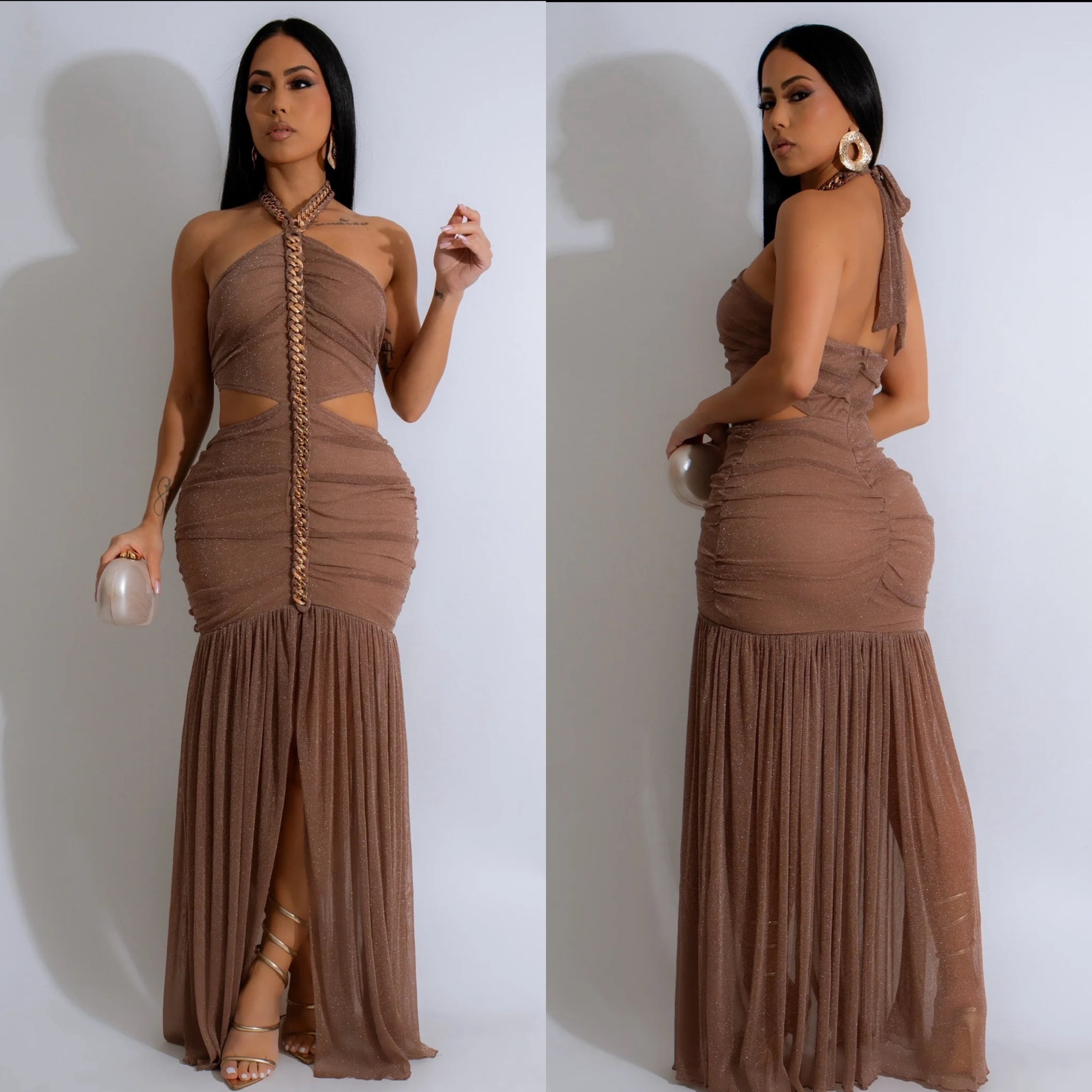 Sophisticated and sultry halter-style gown in a shimmering taupe and bronze hue. It features a high neckline with a chain-like embellishment running down the front, creating a bold focal point. The bodice is fitted with side cutouts, adding a modern and daring touch. The ruching around the hips enhances the silhouette, emphasizing curves, while the skirt flows into a floor-length hemline with a slight flare and a center slit for added movement and allure. The back ties at the neck, leaving the upper back exposed, further elevating its elegance and femininity. Perfect for upscale evening events or special occasions.