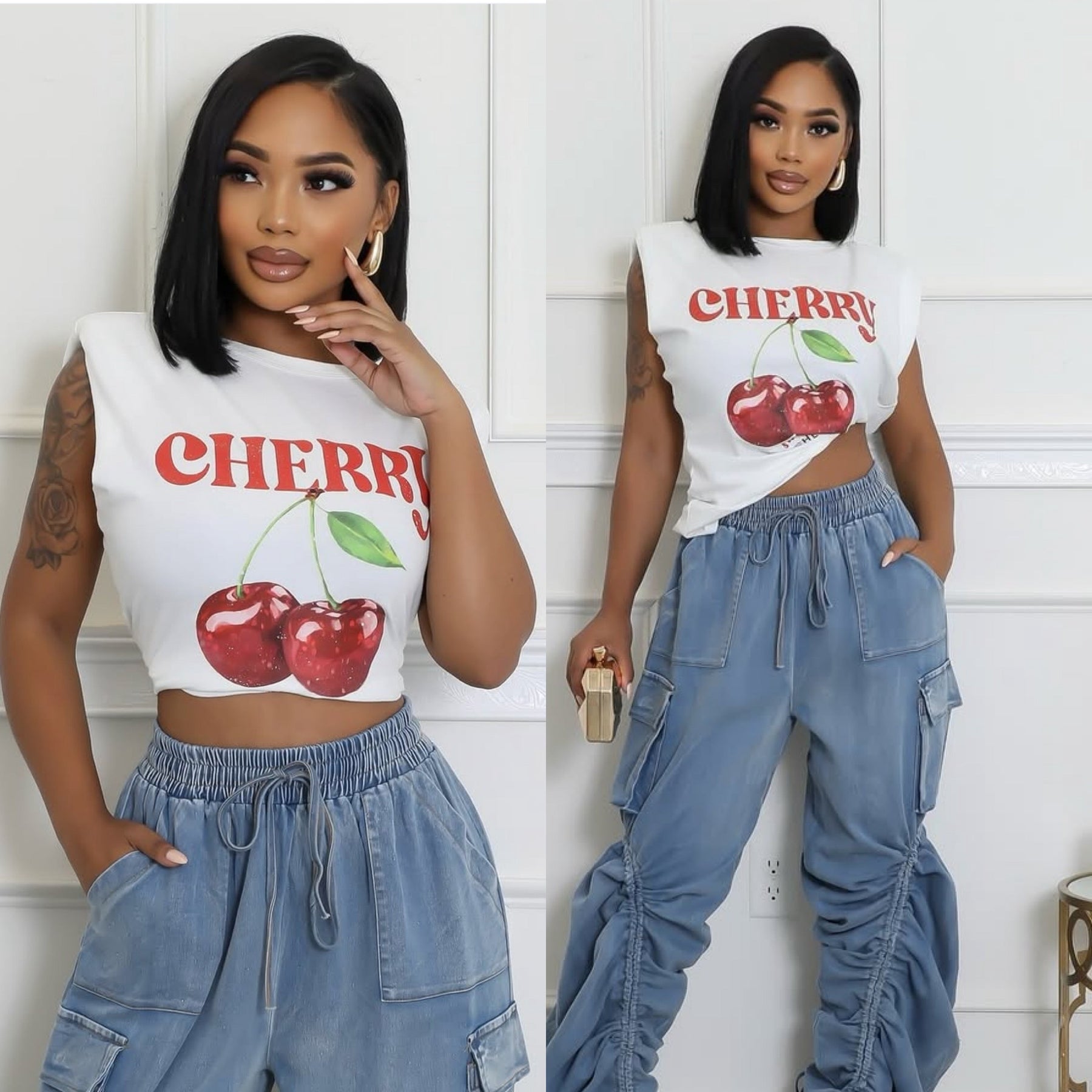 Trendy sleeveless crop tee features a vibrant cherry graphic and eye-catching typography, perfect for adding a fun and playful touch to any outfit. Designed with structured shoulders and a relaxed fit, this top is both comfortable and fashionable. Whether you’re pairing it with high-waisted jeans, cargo pants, or a flirty skirt, it’s the perfect piece to complete your street-style look.