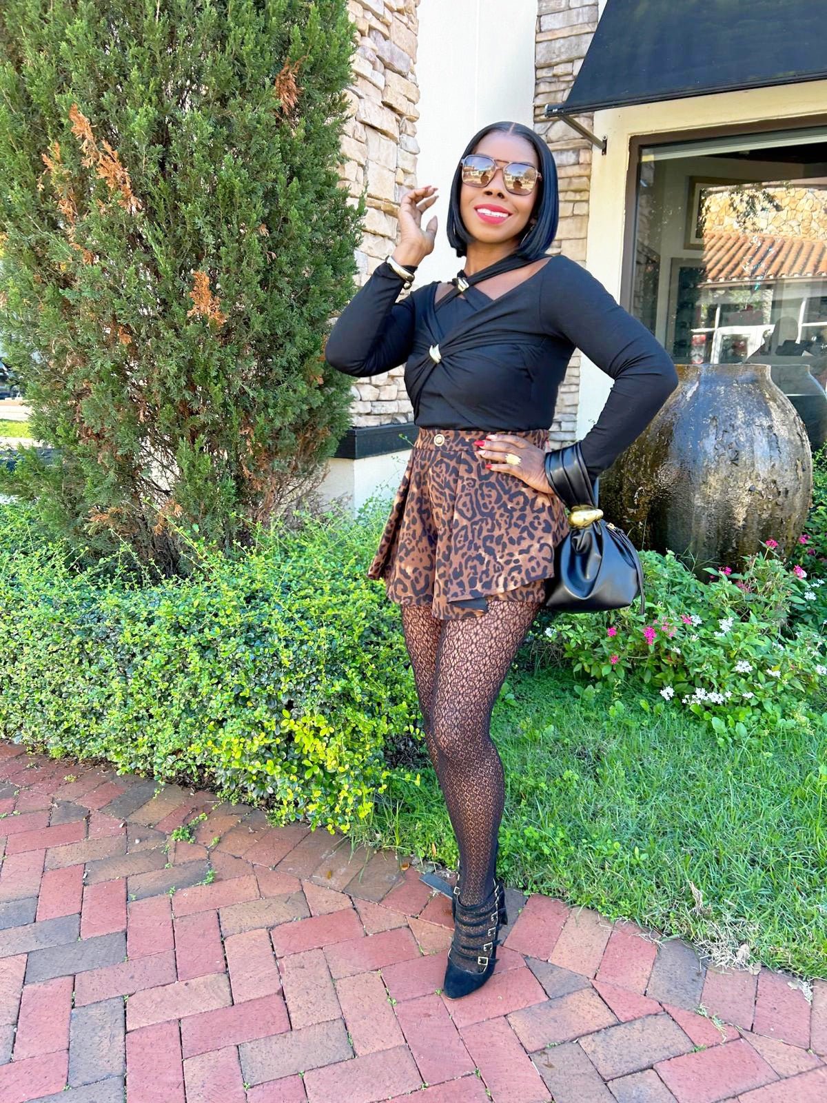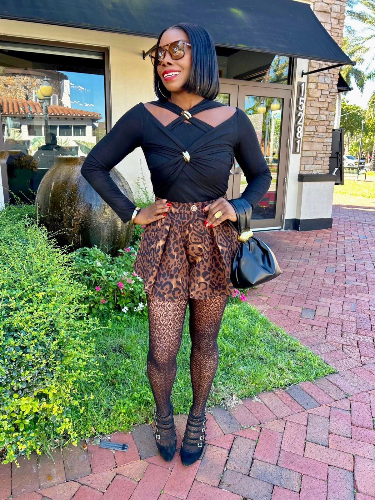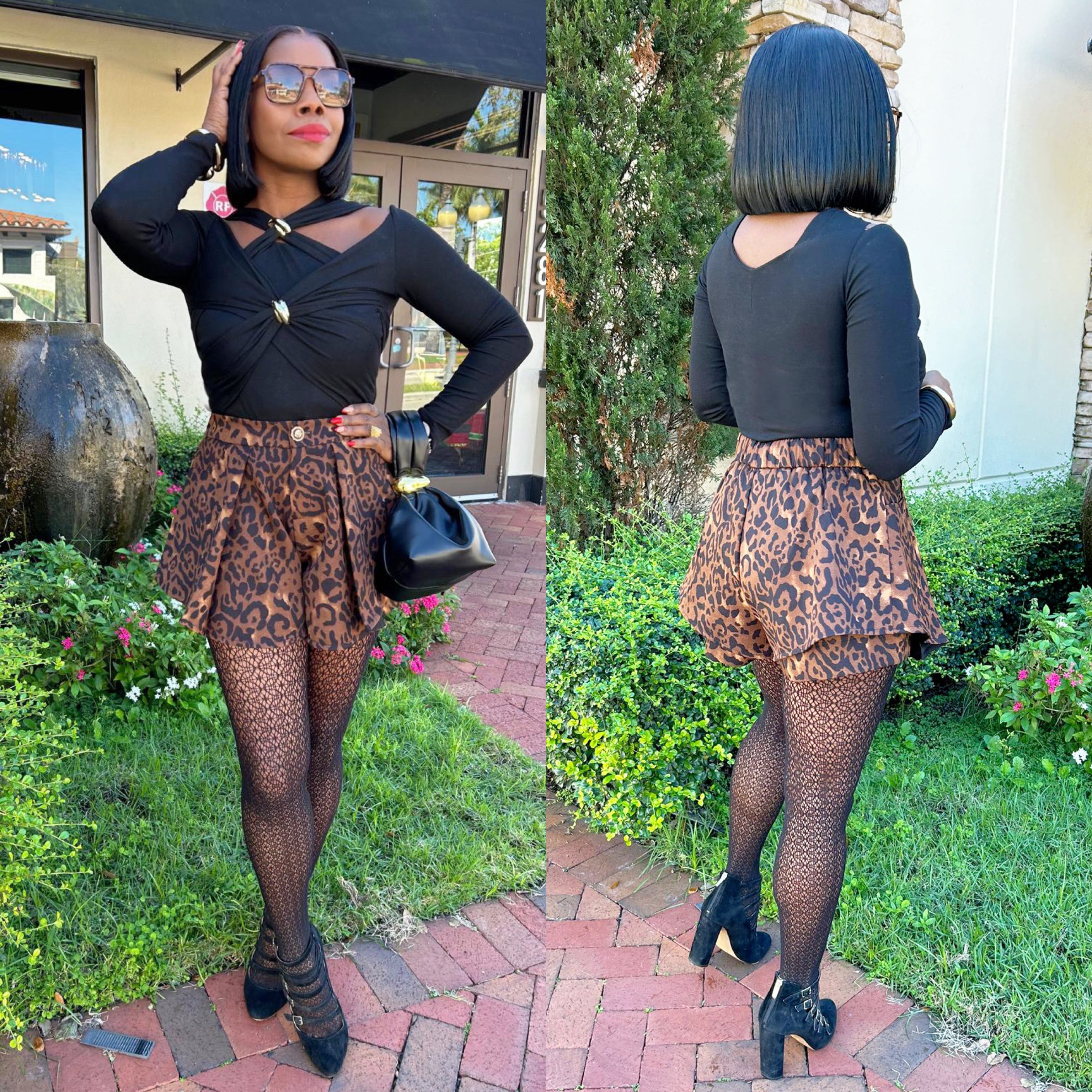 Sophisticated fitted black long-sleeve top featuring a unique design. It has a crisscross detail at the front with gold embellishments holding the fabric together, creating a bold cutout style at the neckline. The back has a clean, solid look, emphasizing its elegant simplicity. This design adds a fashionable and statement-making touch to the outfit.