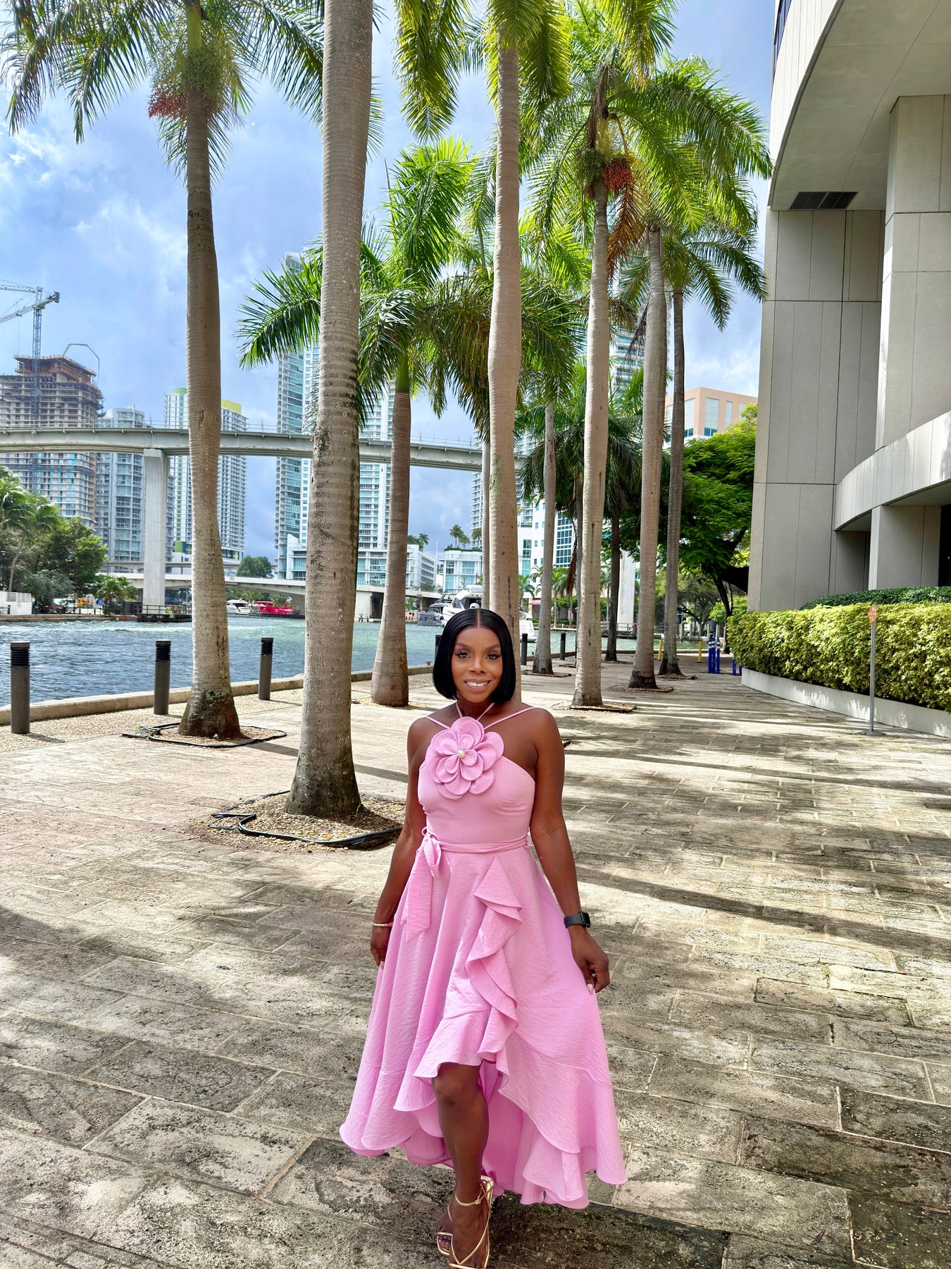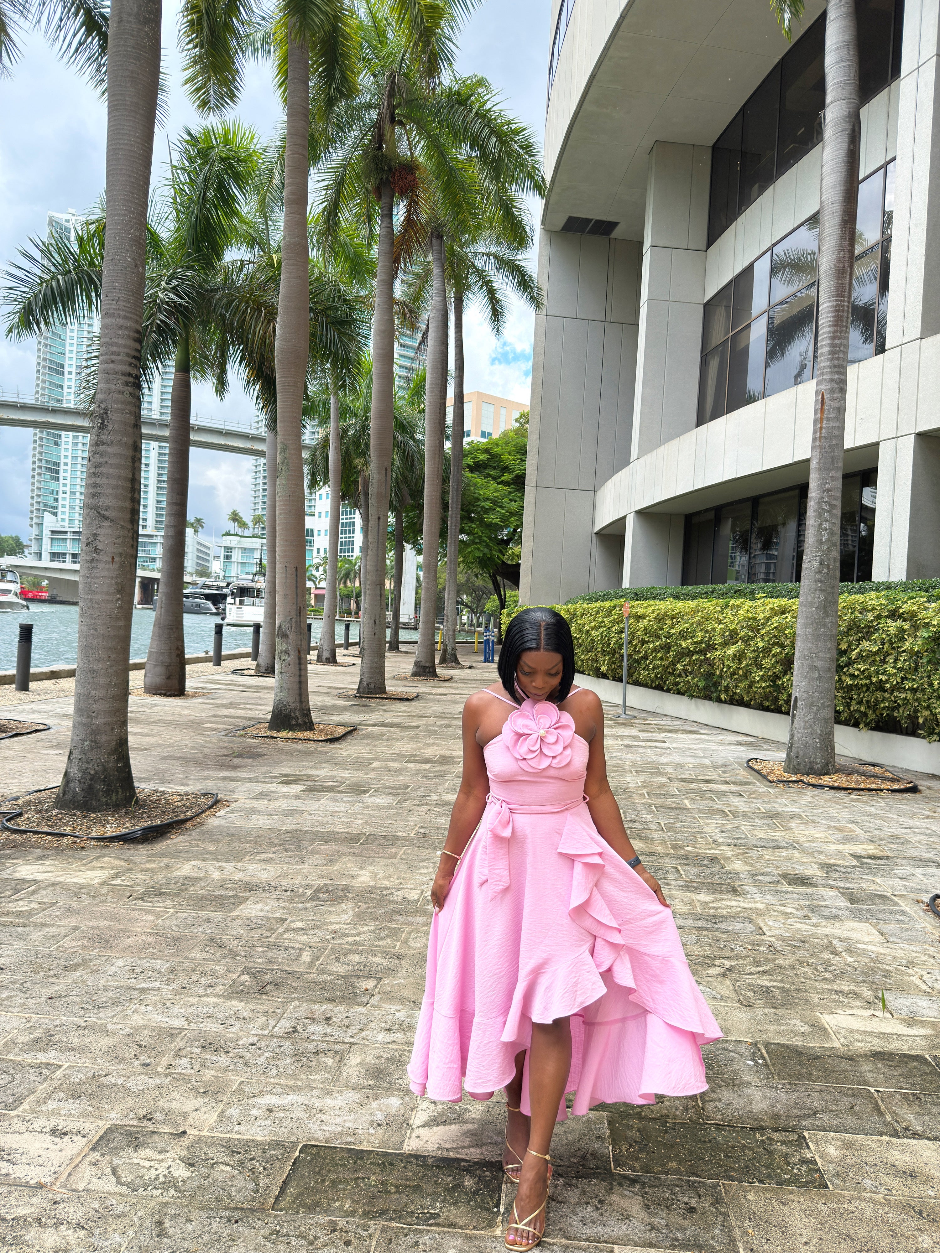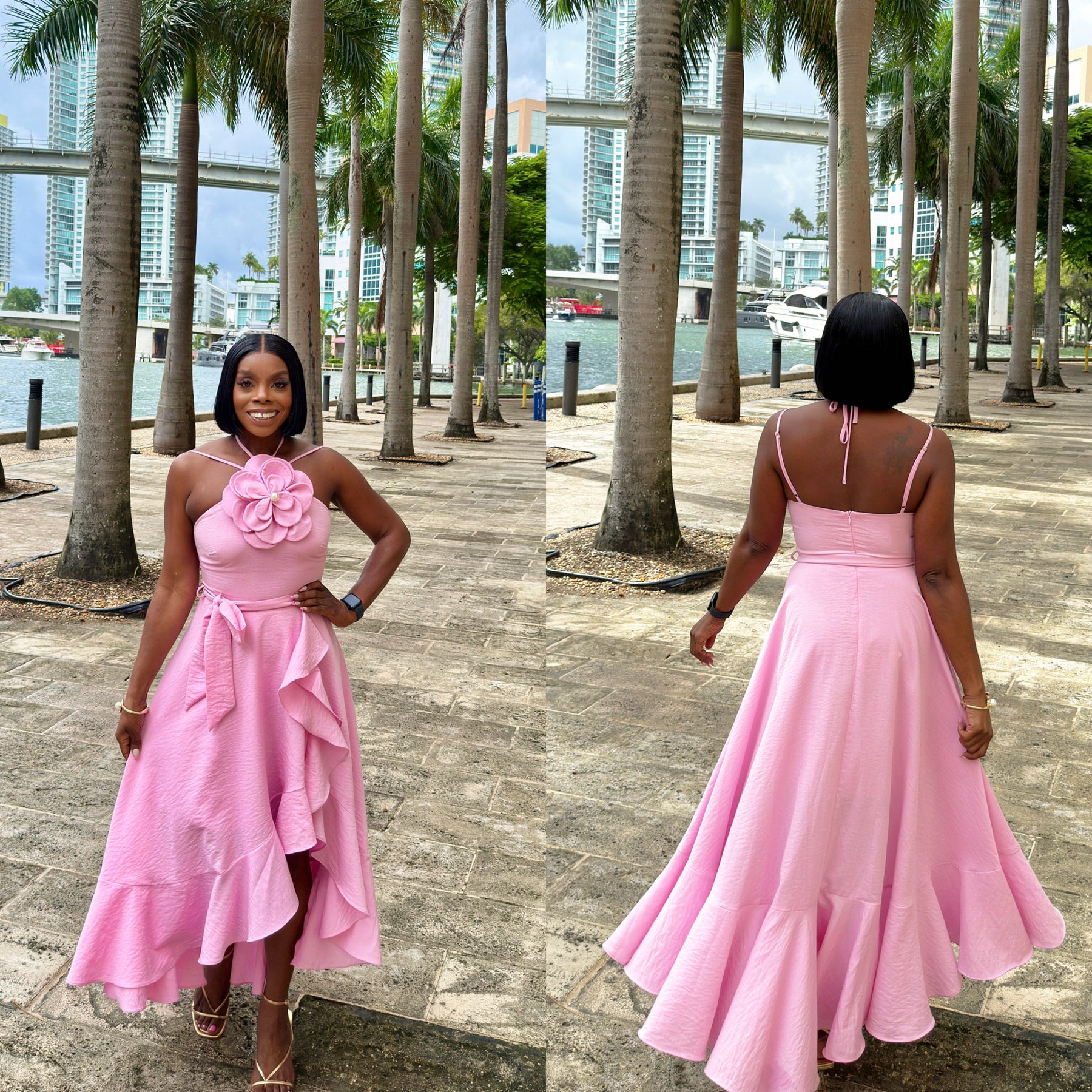 Step into elegance with our Dahlia Ruffle Dress, a statement piece that embodies femininity, grace, and confidence. This soft-pink midi dress features a flattering asymmetrical hemline, delicate spaghetti straps, and a romantic oversized floral appliqué at the neckline — making it a true showstopper from every angle.