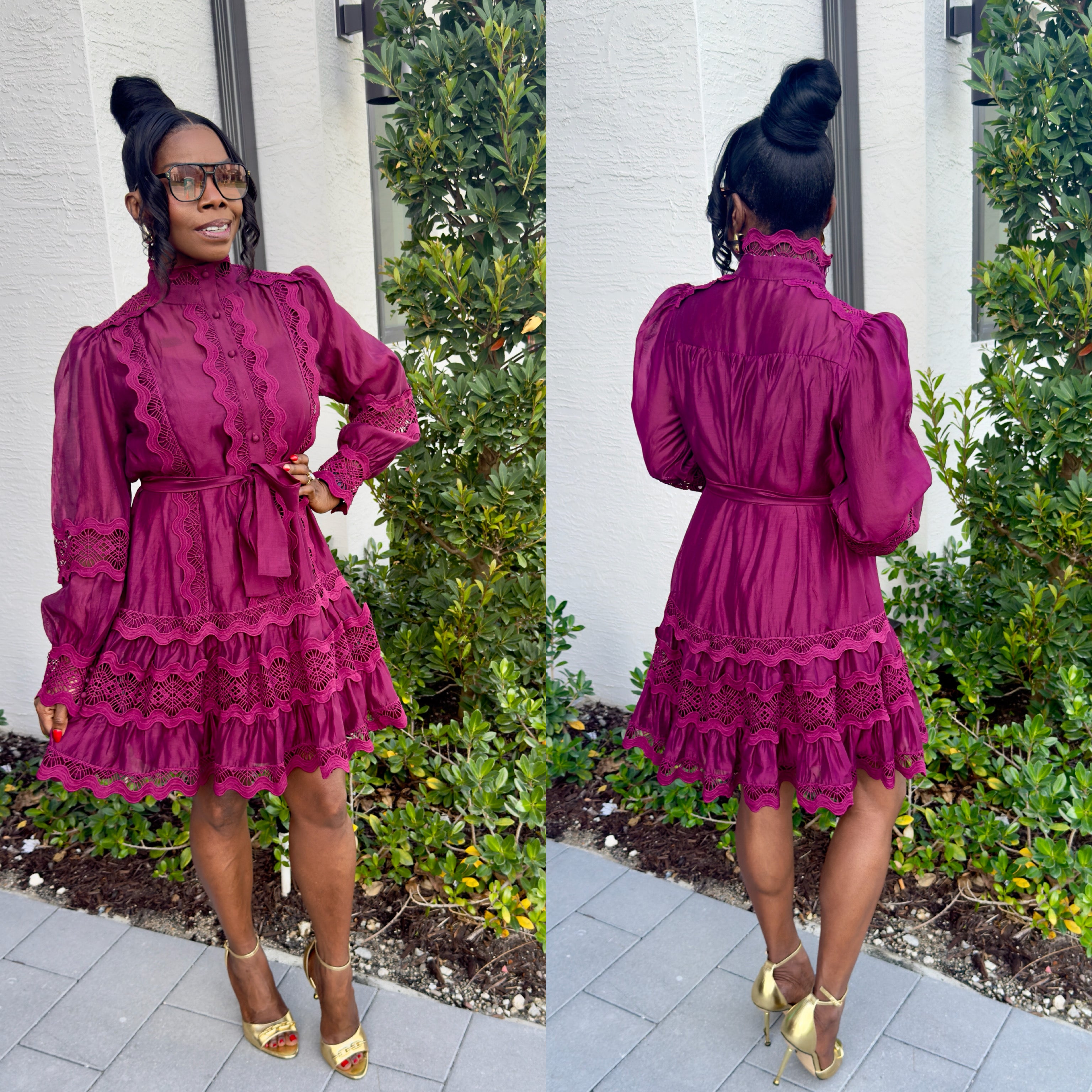 Make an elegant statement in this romantic lace-trimmed dress, designed to turn heads with effortless sophistication. Crafted in a rich jewel-tone hue, this feminine silhouette features a high ruffled neckline, delicate lace detailing throughout, and soft puff sleeves with intricate cutout accents.