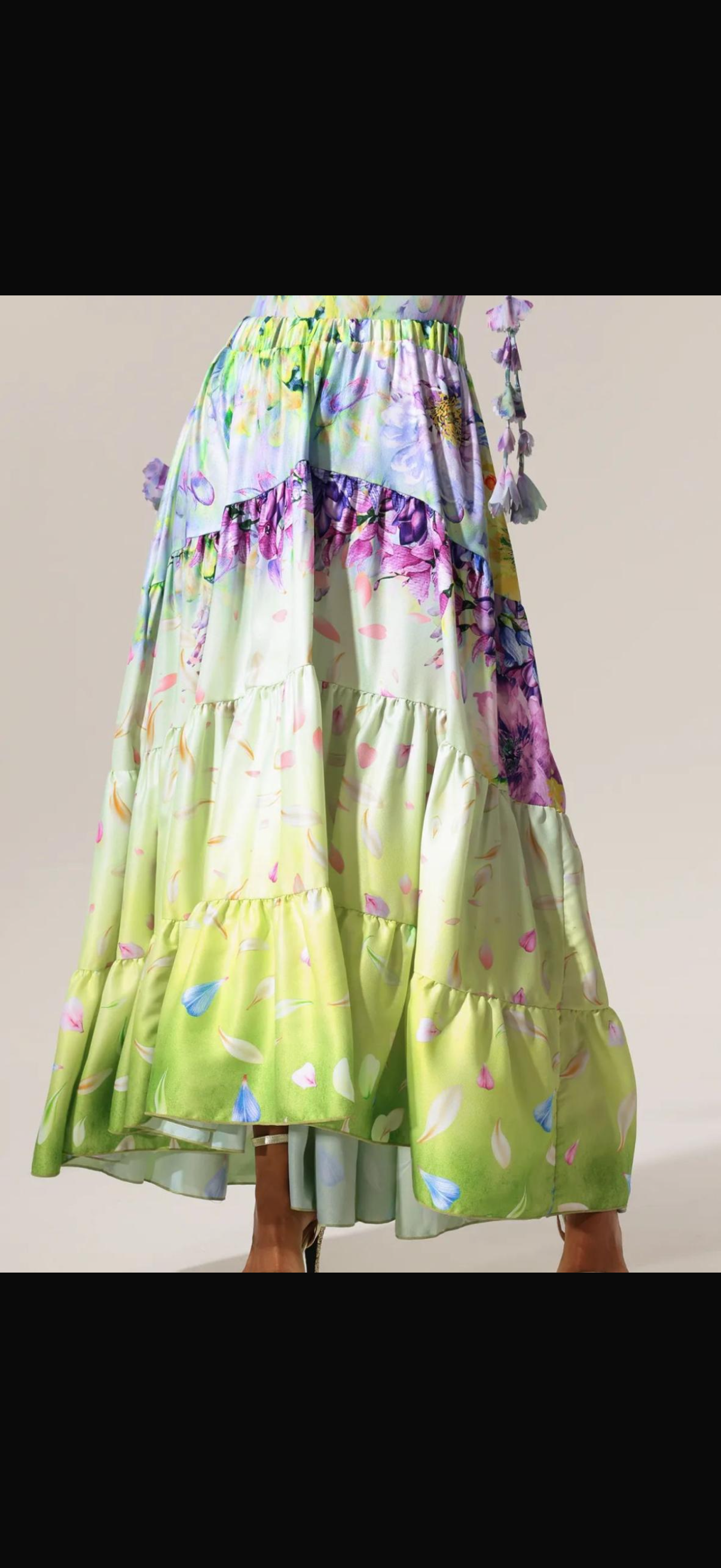 Bloom with elegance in this two-piece floral Swimsuit set, perfect for vacations, garden parties, and resort wear. The ruffle-strap bodysuit features a flattering V-neckline and petal tie accents, while the matching high-waisted tiered maxi skirt flows effortlessly in a pastel gradient of lilac, aqua, and green. Wear together for a statement look or style separately for versatile chic.