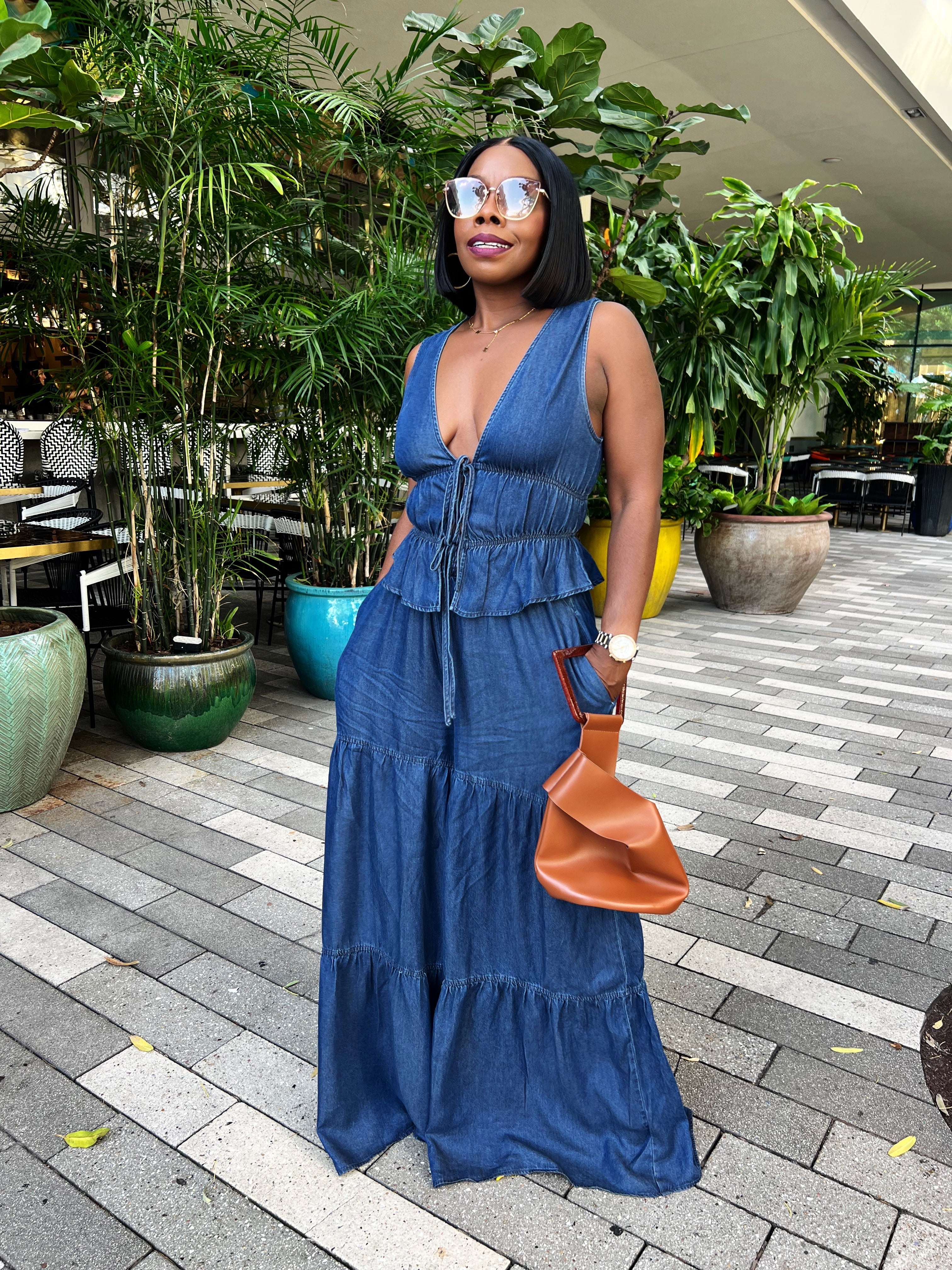Stylish two-piece denim set featuring a sleeveless peplum-style top with a deep V-neckline and a lace-up front detail. The top is cinched at the waist, creating a flattering silhouette. The matching high-waisted, wide-leg tiered pants complement the top, giving the ensemble a flowy and bohemian-inspired look. The lightweight denim fabric adds a casual yet chic feel to the outfit.