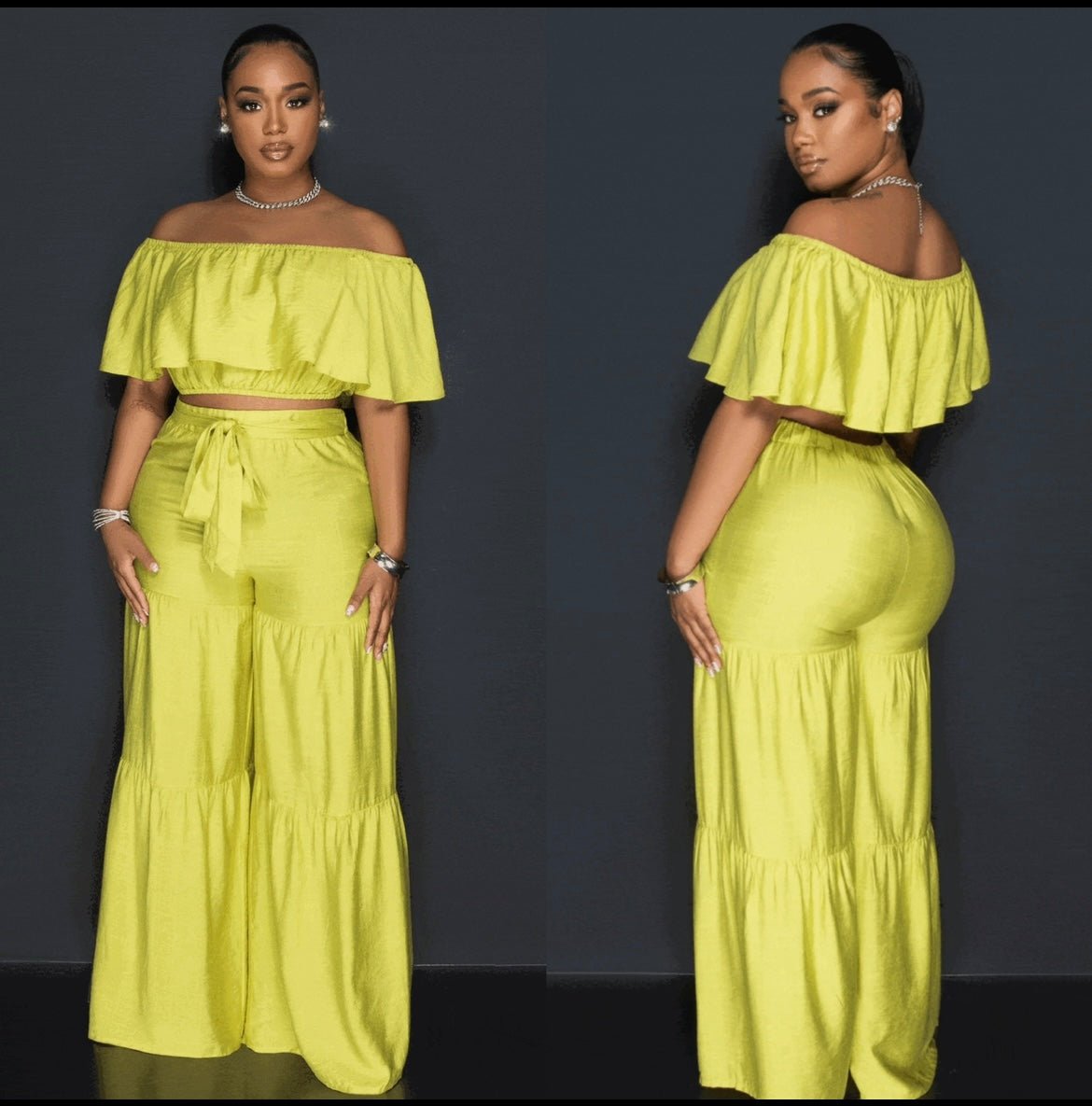Vibrant two-piece set features an off-the-shoulder crop top and matching high-waisted wide-leg pants, perfect for making a bold statement. The top boasts a ruffled design, adding a playful and feminine touch, while the elasticized neckline ensures a comfortable and secure fit. The high-waisted pants are styled with a flowy silhouette and tiered detailing, offering both elegance and ease of movement. The tie-waist belt accentuates the waistline, creating a flattering and defined shape. This set is available in a bright lime-yellow hue and also vibrant orange hue which radiates energy and confidence, making this outfit ideal for spring and summer outings, tropical vacations, or chic casual events.