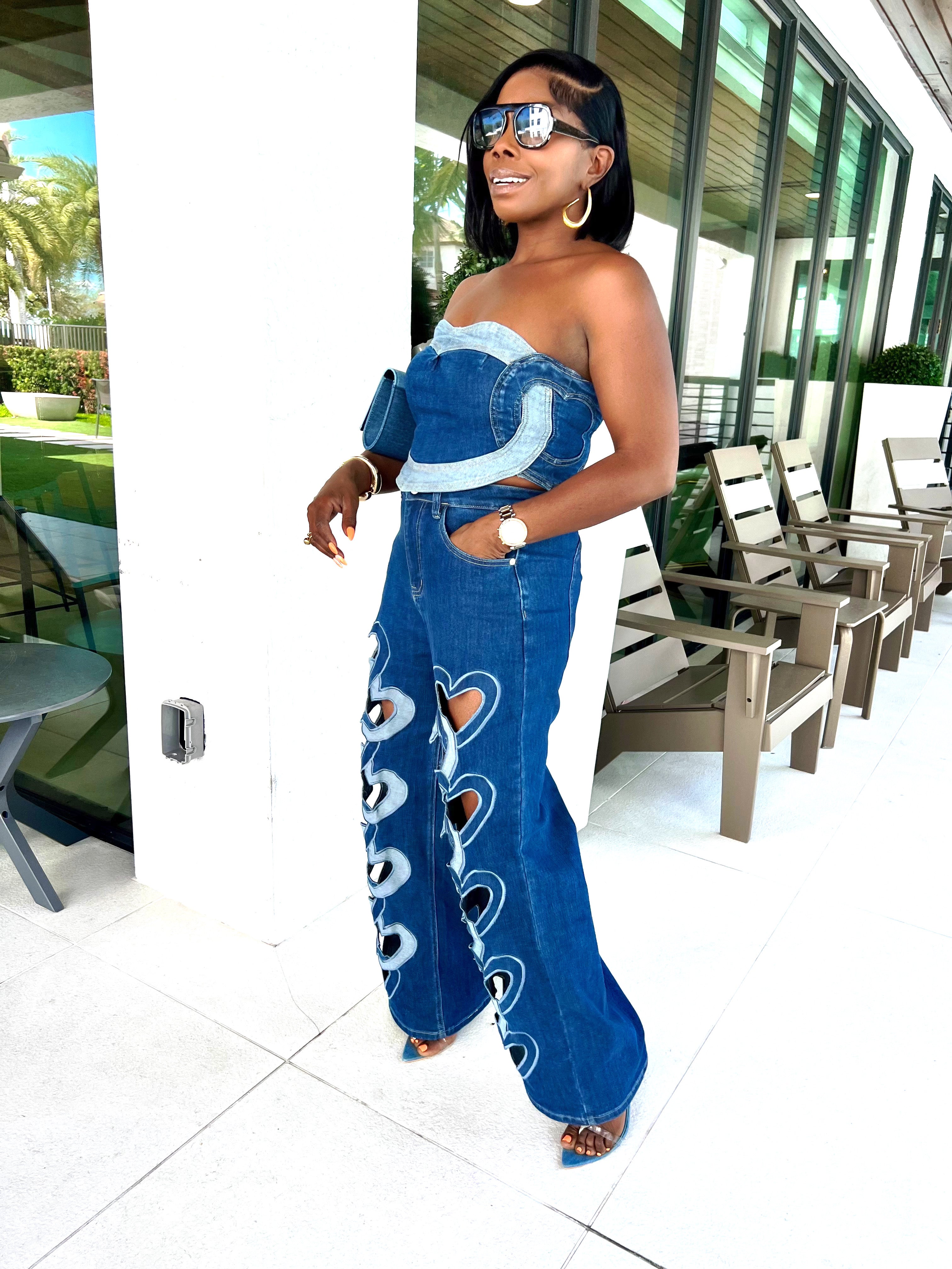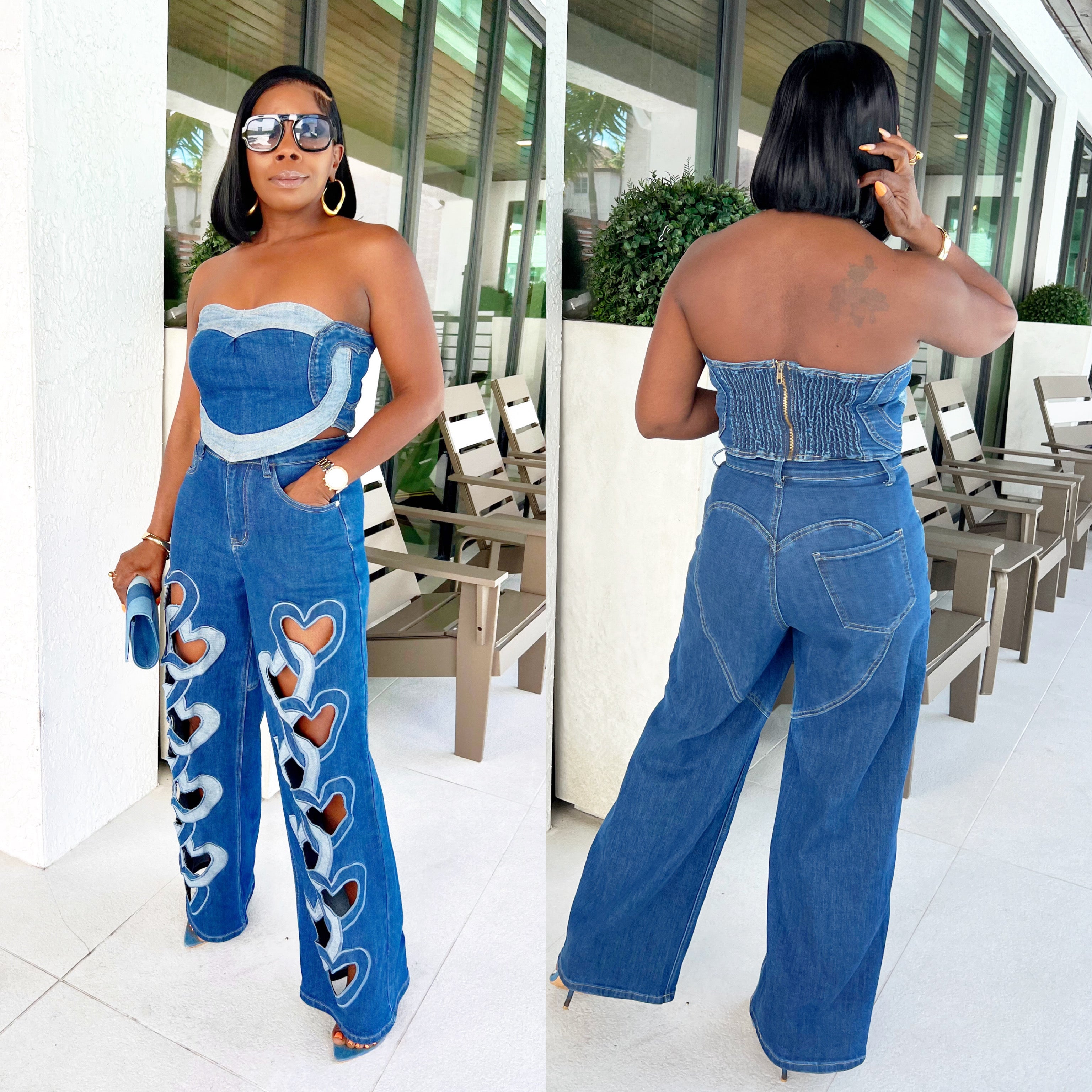 Denim two-piece set is a bold and fashion-forward statement outfit. It consists of a strapless corset top with a structured design, featuring lighter denim paneling and a smocked back with a zipper closure for a snug fit. The matching high-waisted, wide-leg jeans stand out with heart-shaped cutouts along the outer legs, framed by contrasting denim trim, adding a playful yet edgy touch. The back pockets also feature a heart-shaped stitching detail, tying the look together.