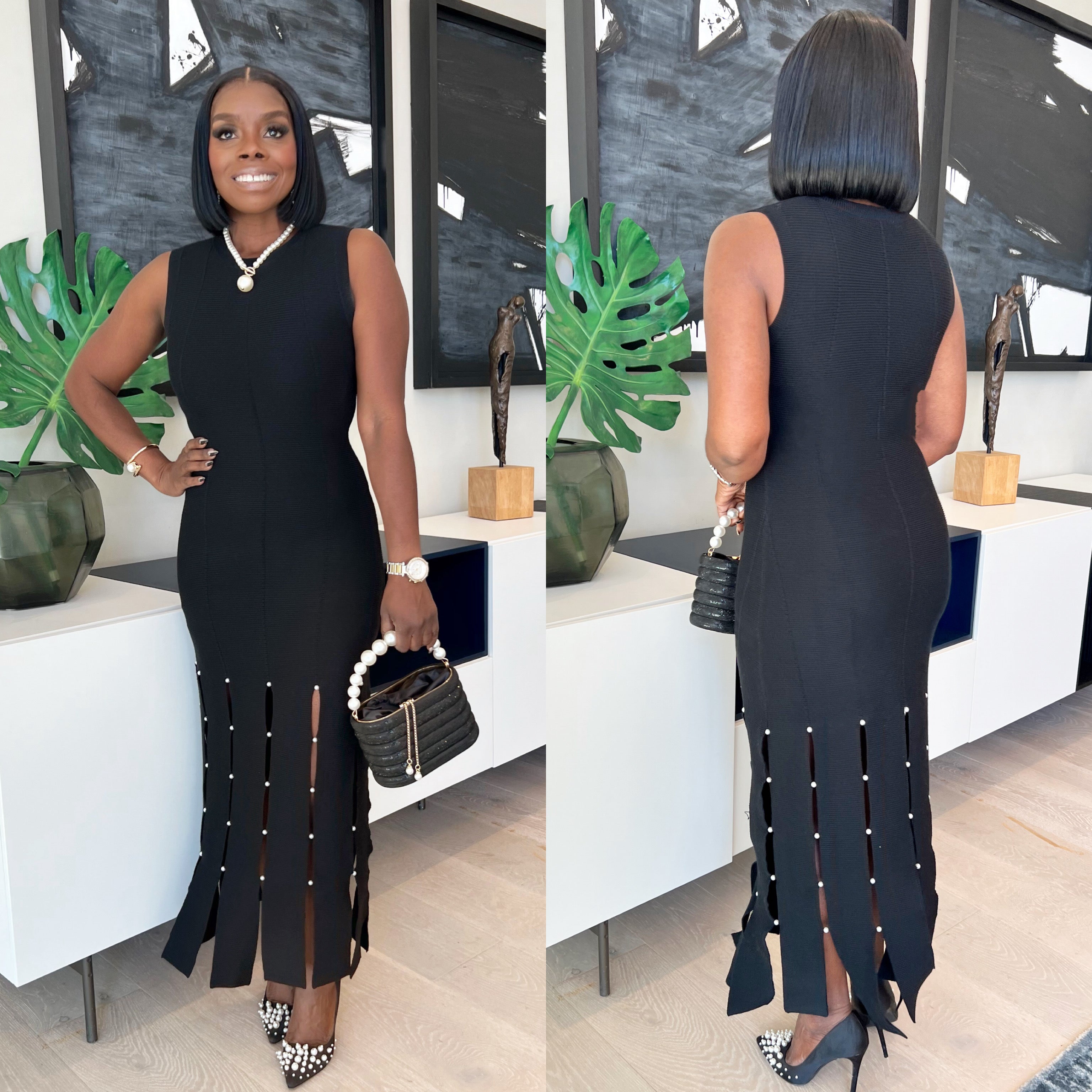 Elegant, form-fitting sleeveless midi dress that exudes sophistication and style. The design features a high neckline, a sleek silhouette, and a striking skirt adorned with vertical slit details accented by pearls. The slits add a touch of modern flair and movement to the look, while maintaining a refined aesthetic. This dress is a standout piece, perfect for formal events or occasions.