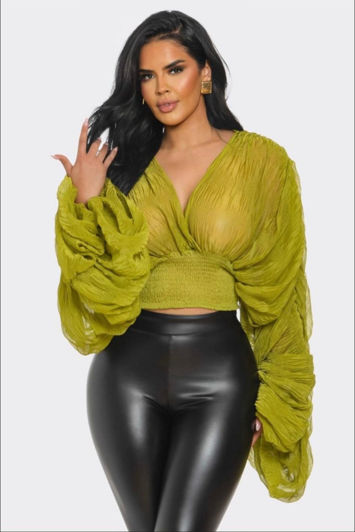 This bold, vibrant top is a statement piece that adds a dramatic flair to any outfit. It features a deep V-neckline with a ruched design that creates an alluring, flattering silhouette. The standout element is the voluminous, textured sleeves that are beautifully draped, adding a touch of elegance and movement. The smocked waist cinches at the midriff, enhancing the figure and providing a secure fit. This top pairs perfectly with high-waisted bottoms like leather pants or skirts, making it ideal for nights out, events, or any occasion where you want to turn heads.