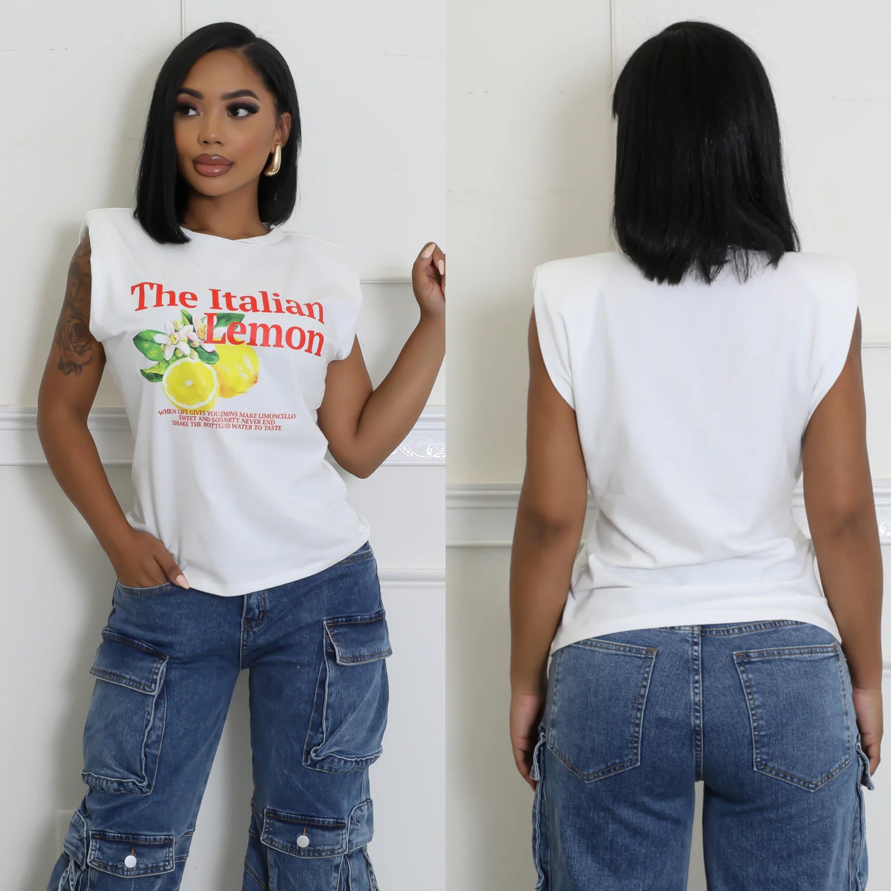 Fresh and trendy Italian Lemon Graphic Muscle Tee, Featuring a bold and vibrant lemon graphic with stylish typography, this sleeveless top offers a relaxed fit with structured shoulders for a modern twist. Made from soft, breathable fabric, it’s perfect for casual days, pairing effortlessly with jeans, cargo pants, or shorts. Whether you’re heading out for brunch or a laid-back day, this top is a must-have statement piece!