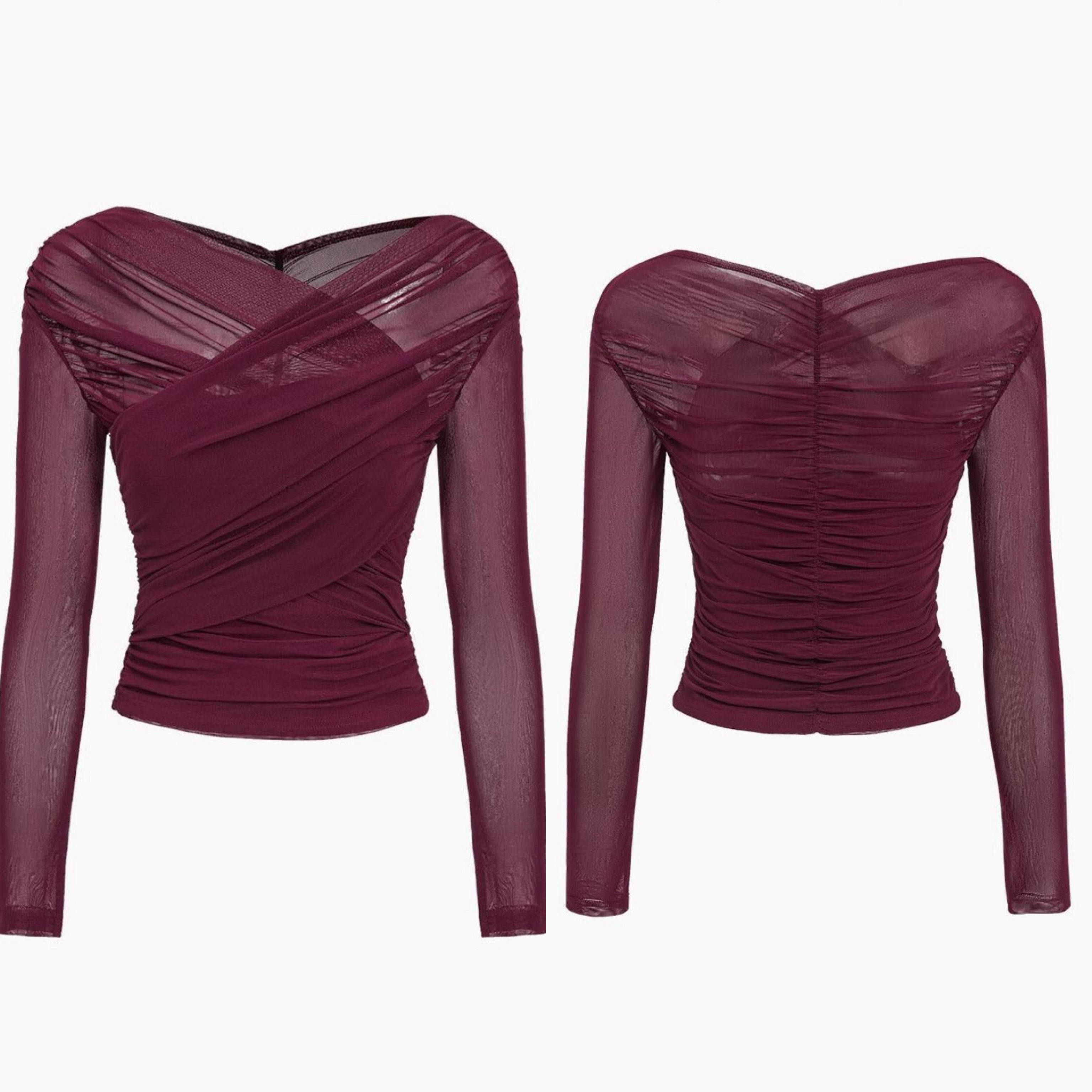 Long-sleeved top made of sheer mesh fabric in featuring a wrap-style design with draped layers across the front, creating a flattering ruched effect. The neckline is off-the-shoulder or a wide sweetheart shape, and the back has a ruched seam, adding more structure and elegance to the design. The overall look is feminine and fitted, suitable for evening or formal occasion