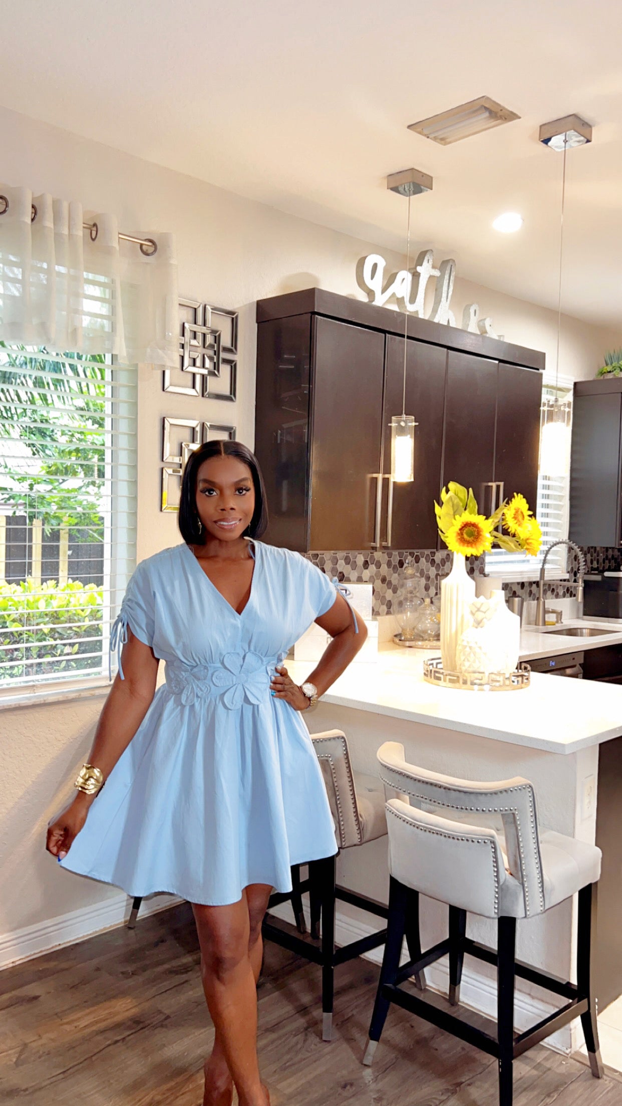 Step into sweet sophistication with our Liana Baby Blue Mini Dress — where charm meets effortless elegance. Designed in a dreamy soft blue hue, this dress features a flattering V-neckline, short ruched sleeves, and a cinched waist adorned with 3D floral appliqués for a playful yet polished touch. The full skater skirt adds movement and volume, making it perfect for daytime brunches, garden parties, or casual-chic outings.