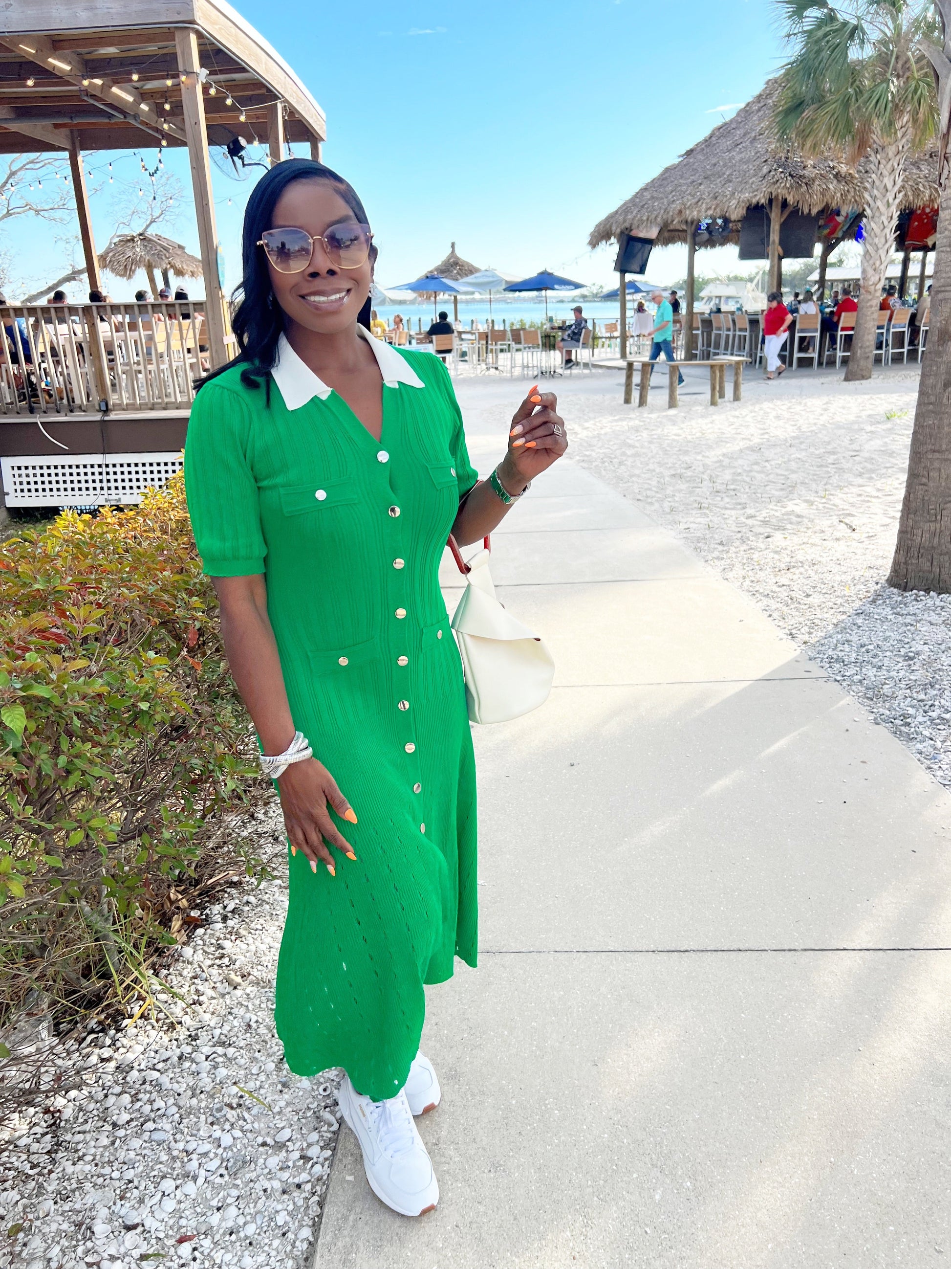 Vibrant Kelly green, short-sleeved, button-up midi dress with a structured yet relaxed fit. It features a contrasting white collar and silver buttons running down the front, adding a classic and sophisticated touch. The fabric has a ribbed or textured pattern, giving it some depth. The skirt portion of the dress has a slightly pleated or perforated design, adding a breezy, elegant flair.