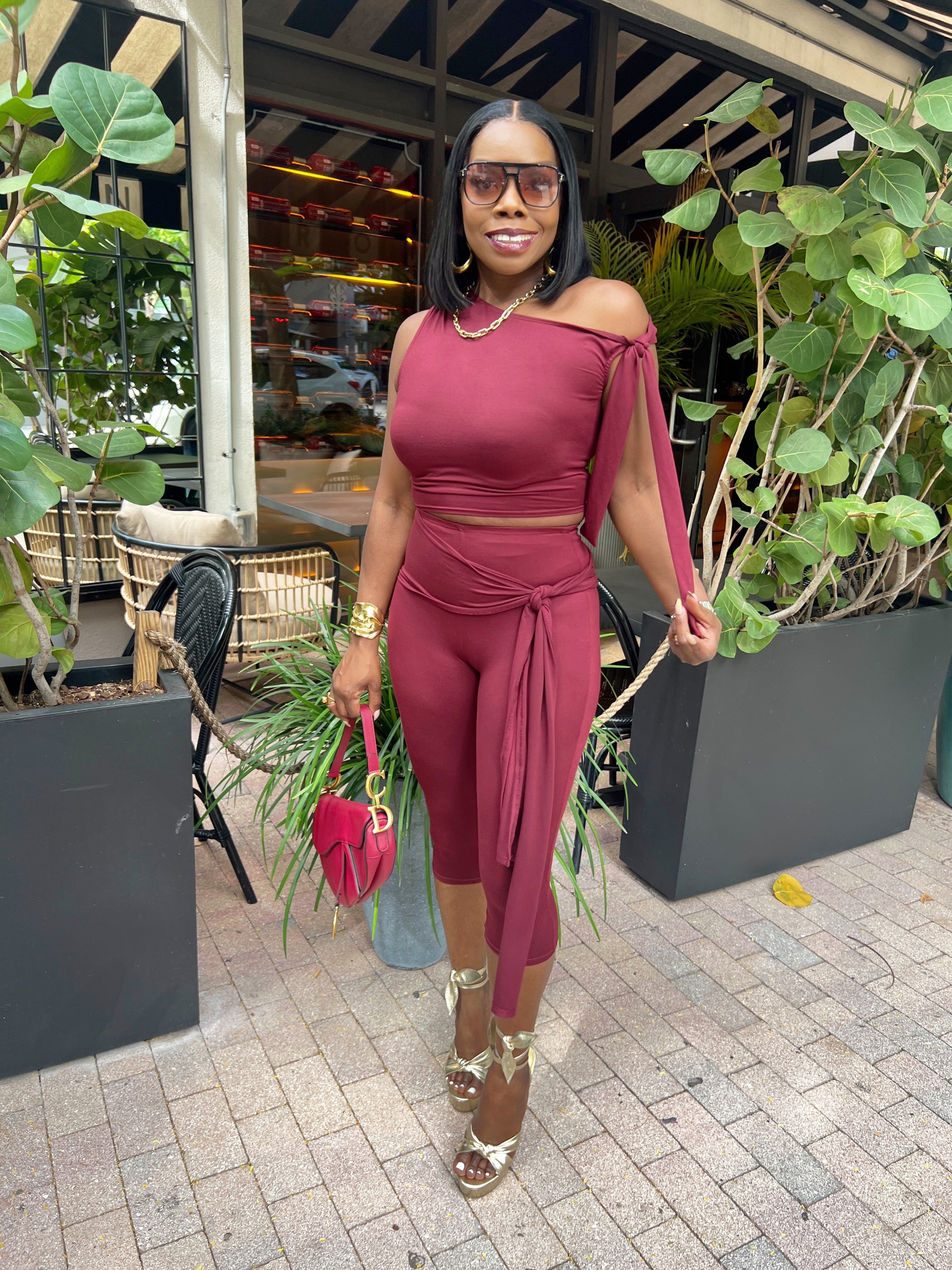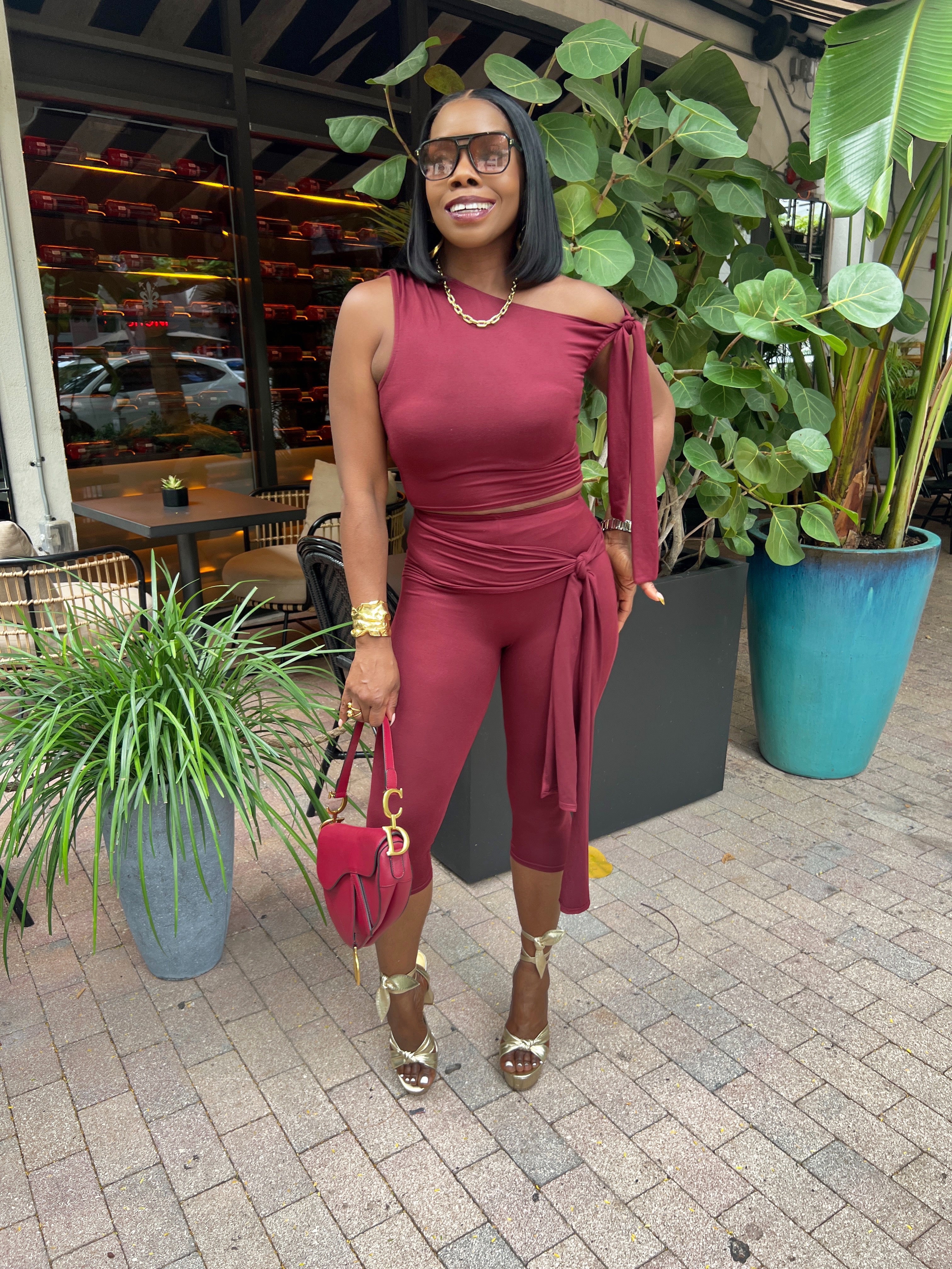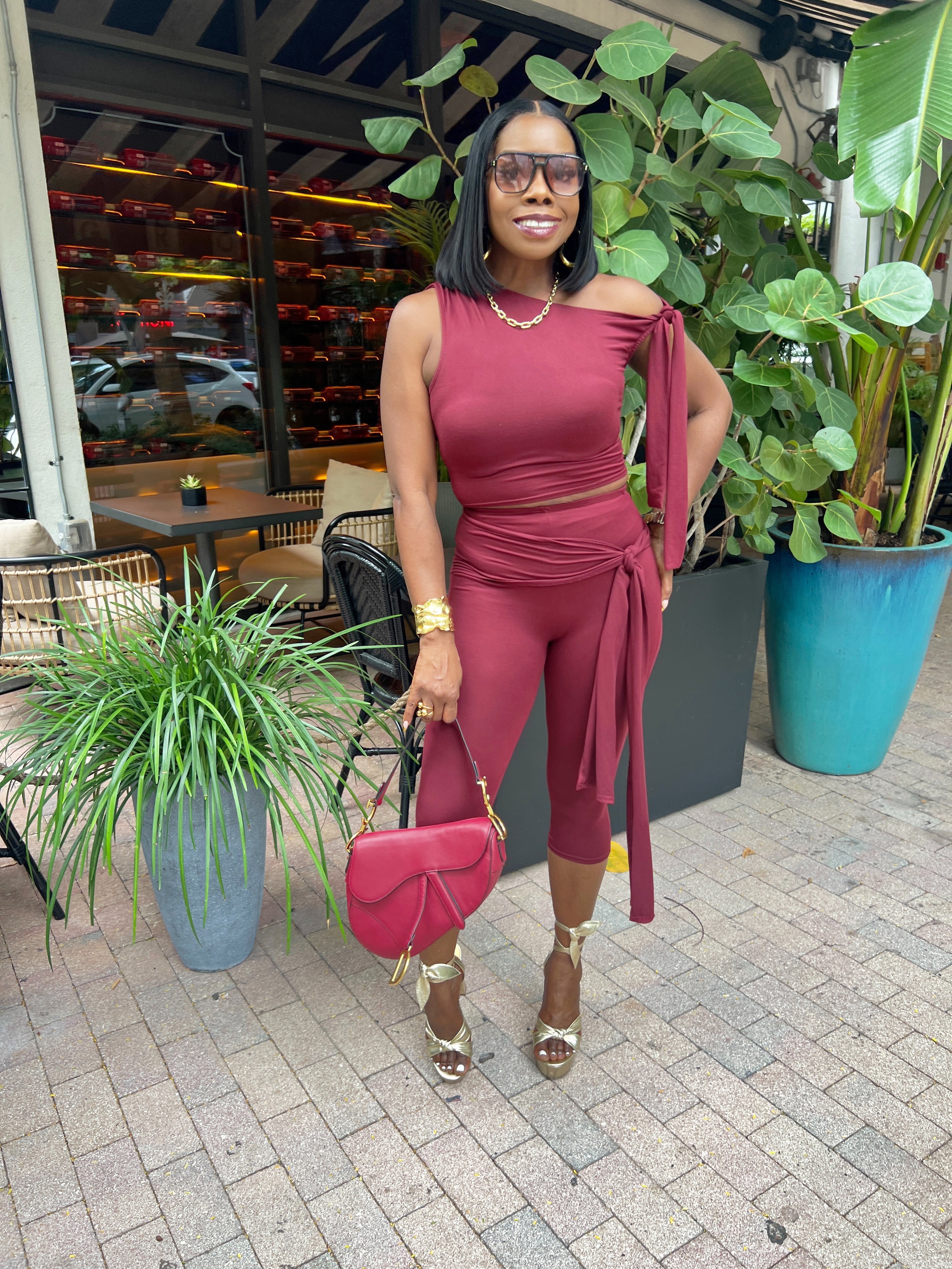 Cutesy two-piece set in a rich burgundy color exudes modern elegance and versatility. The top features an asymmetric one-shoulder design with a draped sleeve detail that adds a dramatic flair. It is form-fitting with subtle ruching at the waist, creating a flattering silhouette.