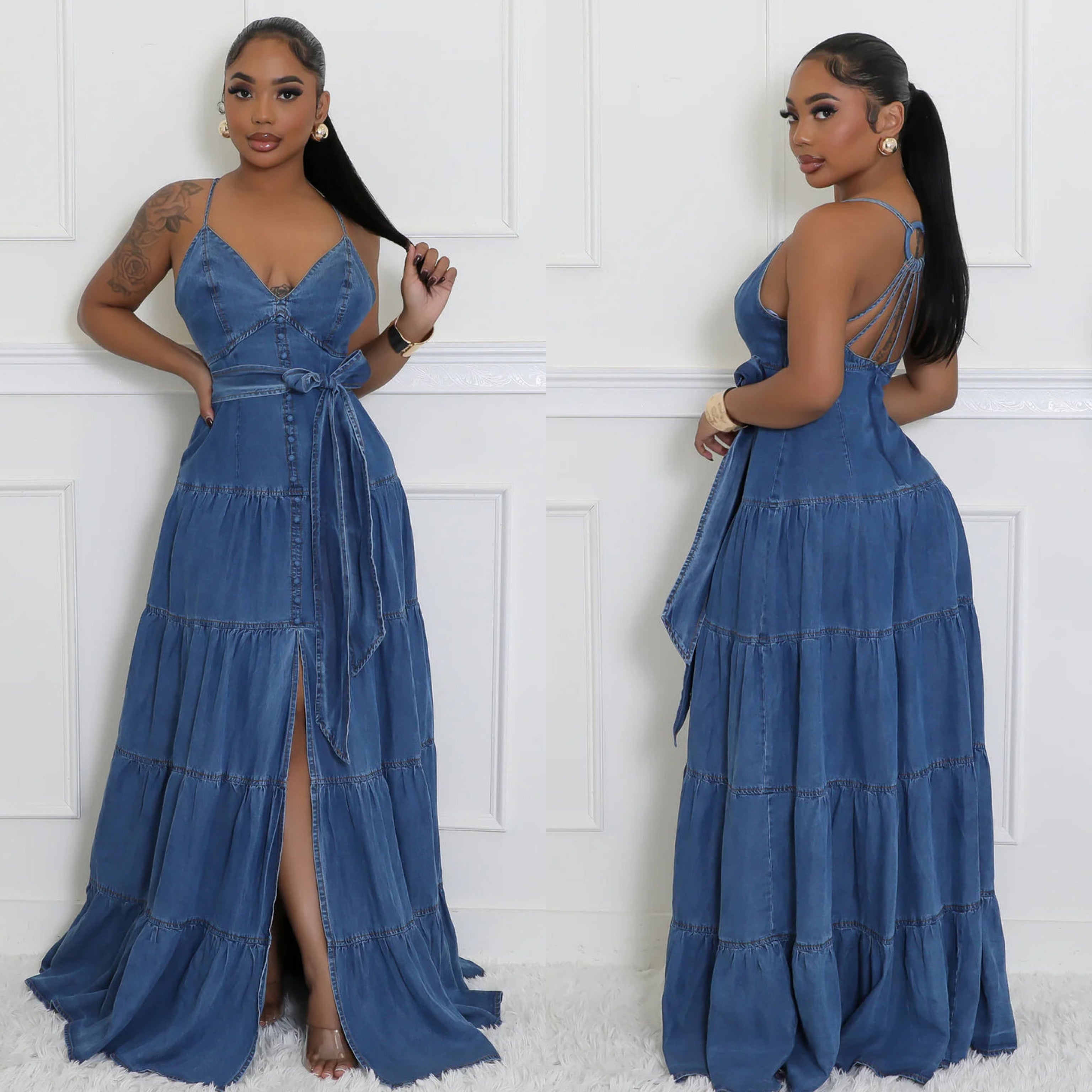 Gorgeous Full Length Denim Dress. This dress is effortlessly chic and infinitely versatile.. The O-ring design in the back detail adds a unique, luxurious touch, while the tiered design and maxi length create a flowing silhouette. The Straps are also adjustable
