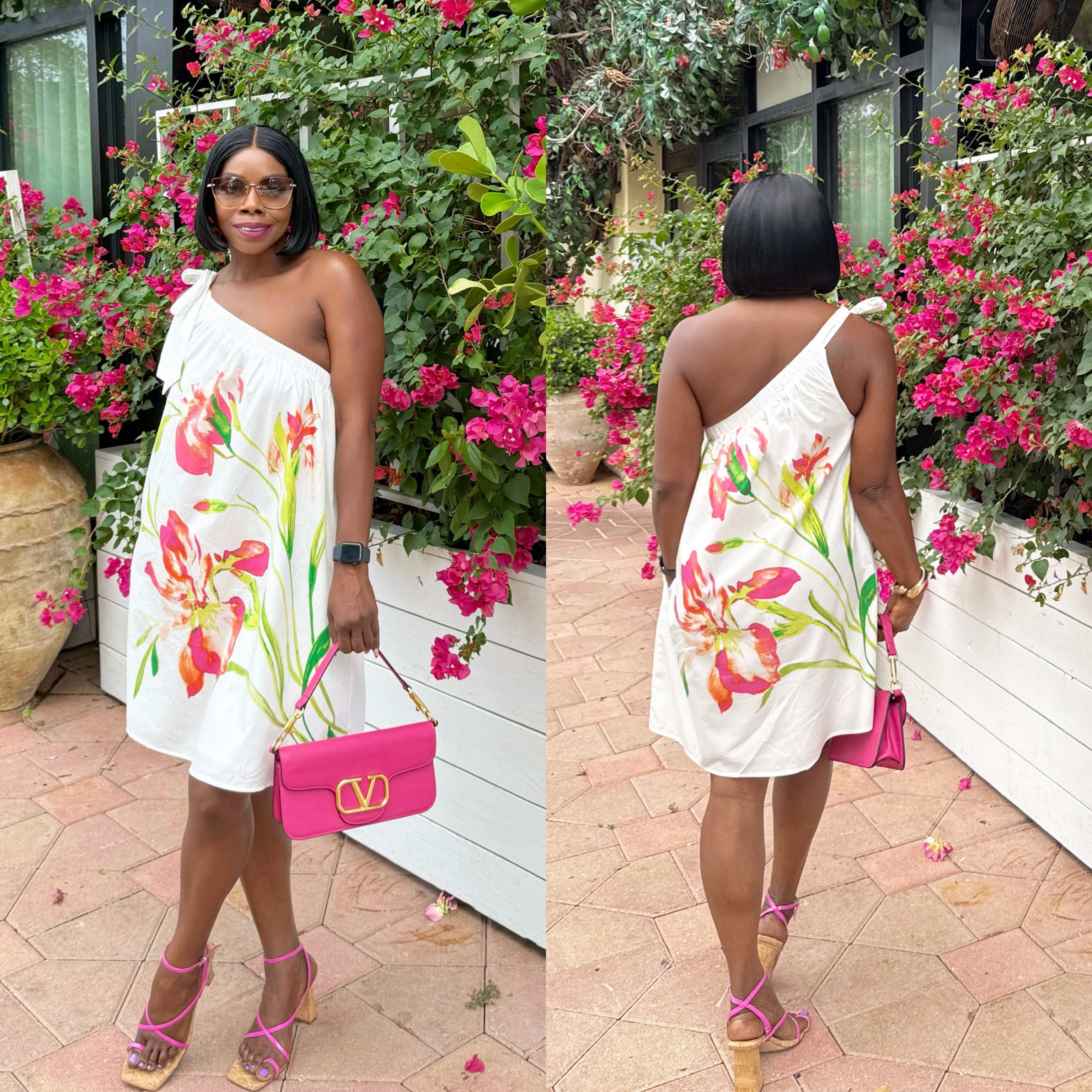 Turn heads in our One-Shoulder Mariposa Floral Dress, featuring a crisp white backdrop with bold watercolor blooms in pink, orange, and green. This flowy A-line silhouette offers a breezy, relaxed fit with an elegant one-shoulder neckline—perfect for brunch, vacation, or a summer soirée.
