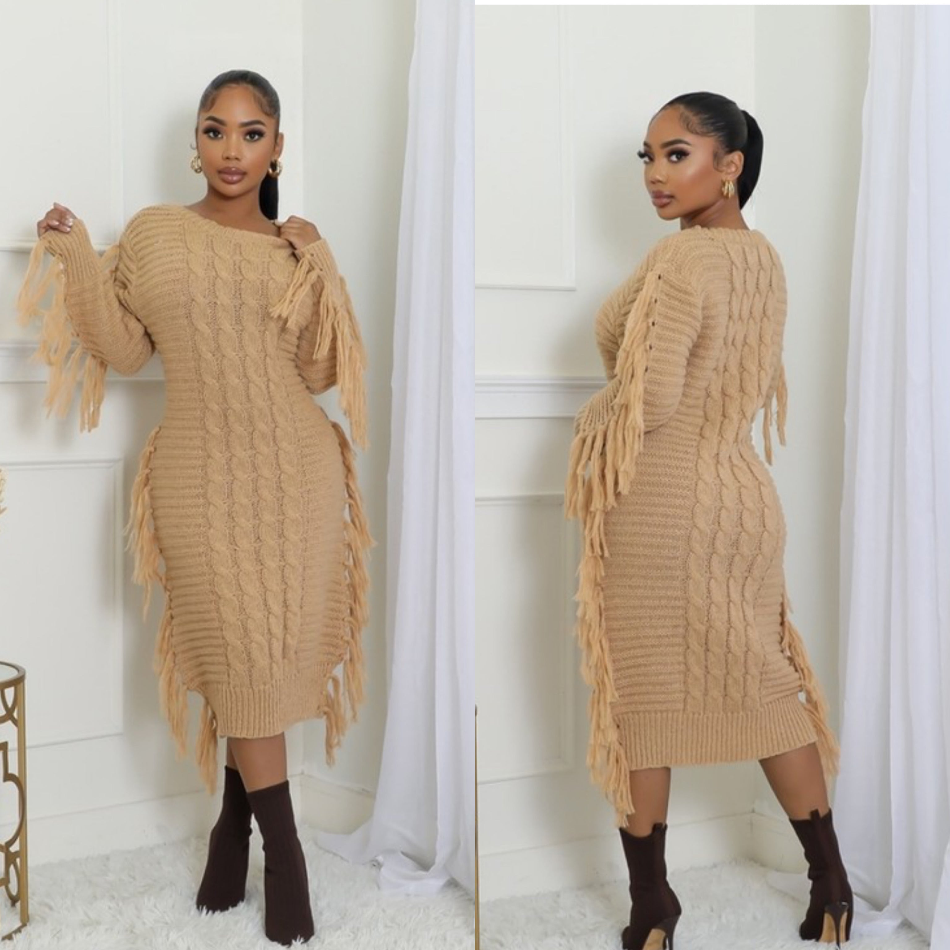 This sweater dress is a cozy, stylish, and bold piece in a beautiful rich orange color and a warm beige color. The dress features a cable-knit design down the front and back, giving it a textured and classic appearance. The standout detail of this dress is the long fringe that runs down the sleeves and sides, adding a playful and bohemian touch to the look. The dress is midi-length, fitting close to the body to accentuate the figure, while the thick knit fabric suggests warmth and comfort, making it ideal for cooler weather. Paired with ankle boots or heels, this dress would be perfect for a chic fall or winter outfit.