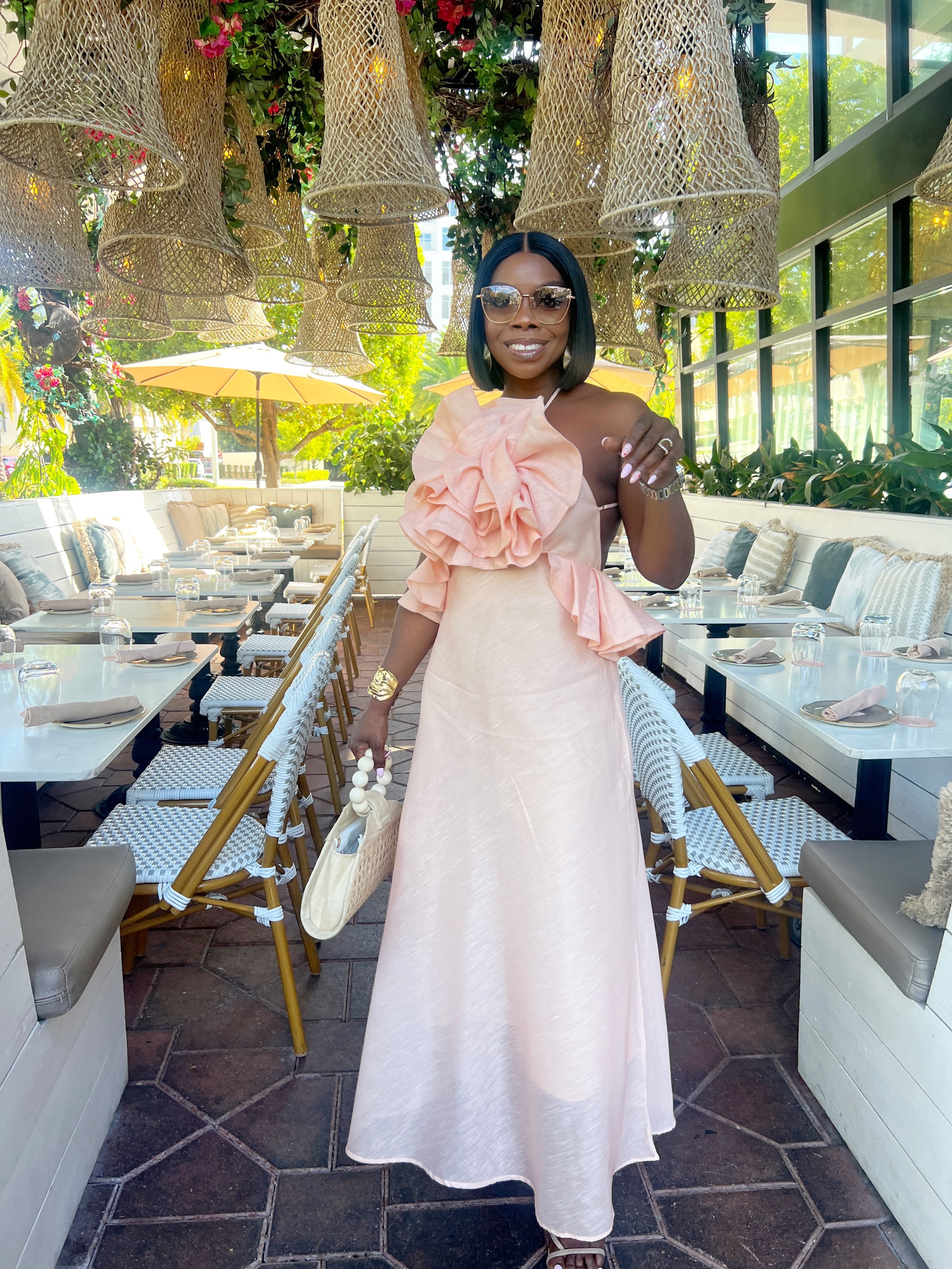 Soft blush pink maxi dress with a flowing, elegant silhouette. It features a halter neckline adorned with a dramatic layered ruffle detail that extends to the sides, adding a voluminous and sophisticated touch. The front of the dress is structured and modest, while the back is open with delicate crisscross straps, creating a striking contrast. The ruffle detailing continues at the back, just above the waistline, giving it a playful yet refined aesthetic. The skirt of the dress flows effortlessly to the floor, making it perfect for a chic, summery, and formal occasion. The lightweight fabric gives it an airy, ethereal feel.