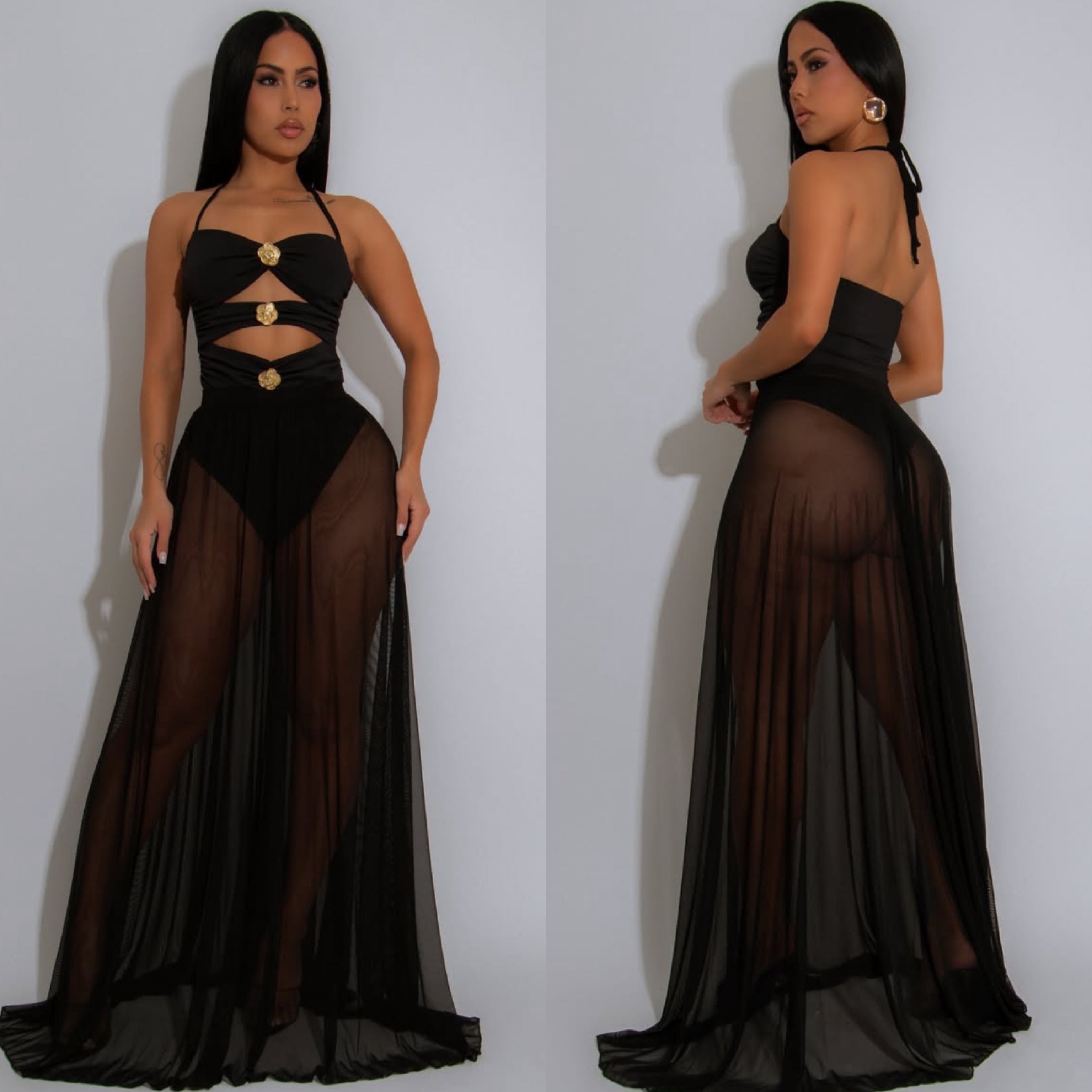 Bring the heat in this show-stopping black mesh halter maxi set, made to turn every head on vacation or poolside. This sultry two-piece features a strappy halter top with gold statement medallions and matching high-waisted bottoms, all draped with a sheer, floor-length mesh overlay that adds just the right touch of drama. Whether you’re headed to a resort, beach party, or rooftop soirée, this look is your ultimate power move.