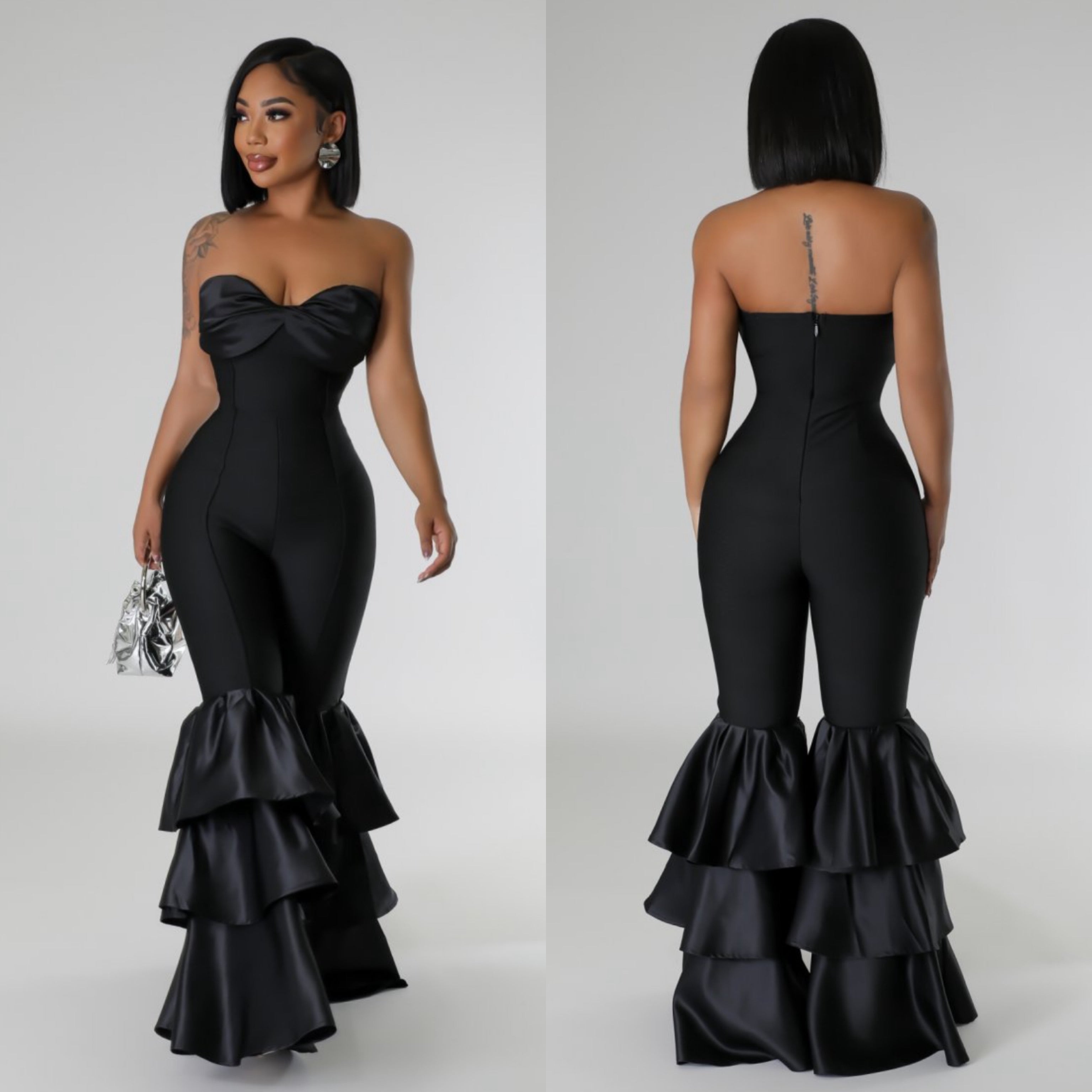 Bold and dramatic statement jumpsuit in sleek black. It features a strapless, sweetheart neckline with a knotted or ruched design at the bust, adding a touch of elegance and femininity. The bodice is fitted, accentuating the figure and creating a sleek silhouette. The standout detail is the tiered, flared ruffles at the lower legs, which add volume and a playful, avant-garde touch to the design. The jumpsuit closes with a hidden back zipper for a seamless finish. This outfit is perfect for upscale parties, fashion-forward events, or occasions where a striking and unique look is desired.