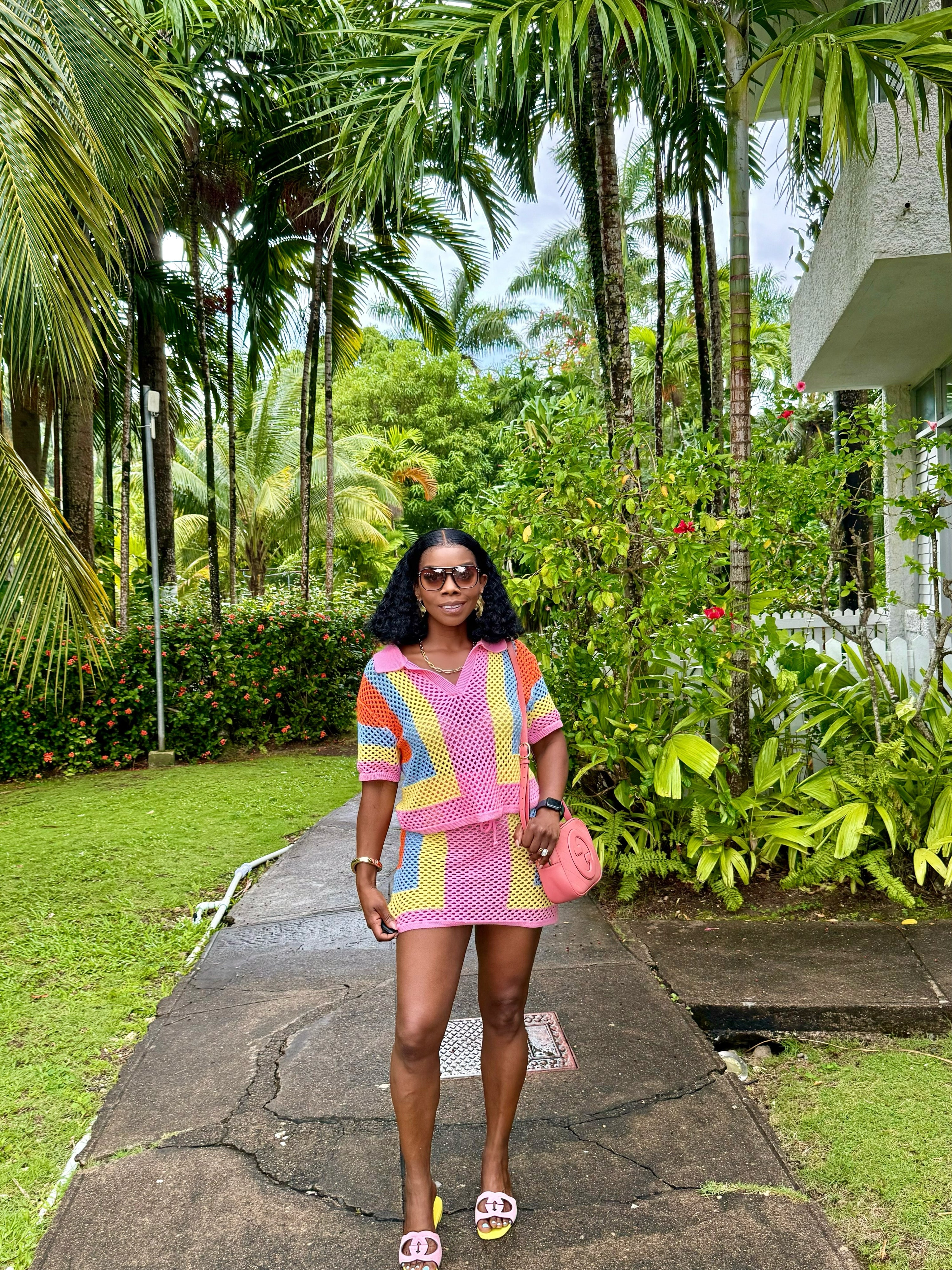 Brighten up your wardrobe with the Zariah Crochet Knit Skirt Set! Featuring a colorful open-knit design, this two-piece set includes a collared short-sleeve top and a matching mini skirt. The breathable crochet fabric makes it the perfect choice for vacation, beach days, or summer outings.