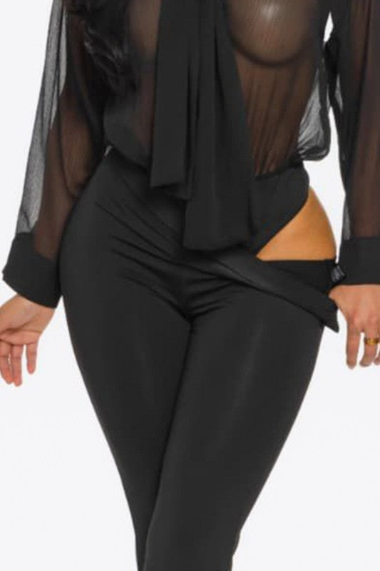 Command attention in this ultra-sophisticated two-piece set featuring a sheer tie-neck bodysuit paired with sleek, high-waisted pants. The long-sleeve bodysuit offers a smooth, tucked-in fit that flatters the waist while delivering a bold yet elegant look. Designed with lightweight, semi-sheer fabric and a feminine neck-tie detail, it adds just the right amount of allure.