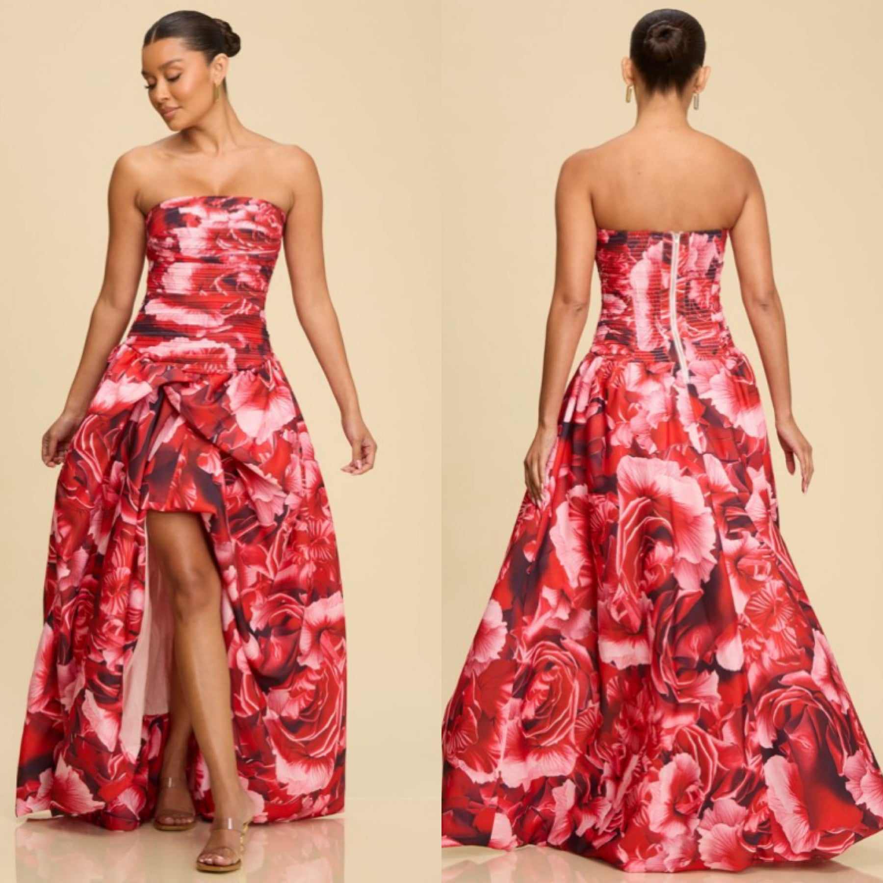 Turn heads in this show-stopping strapless maxi dress designed to flatter from every angle. Featuring a beautifully structured, smocked bodice that hugs the waist and enhances your silhouette, this dress flows effortlessly into a dramatic high-low skirt. The bold red floral print adds a romantic, luxe touch, while the front slit reveals just the right amount of leg for a confident, feminine finish. A concealed back zipper ensures a secure and comfortable fit.