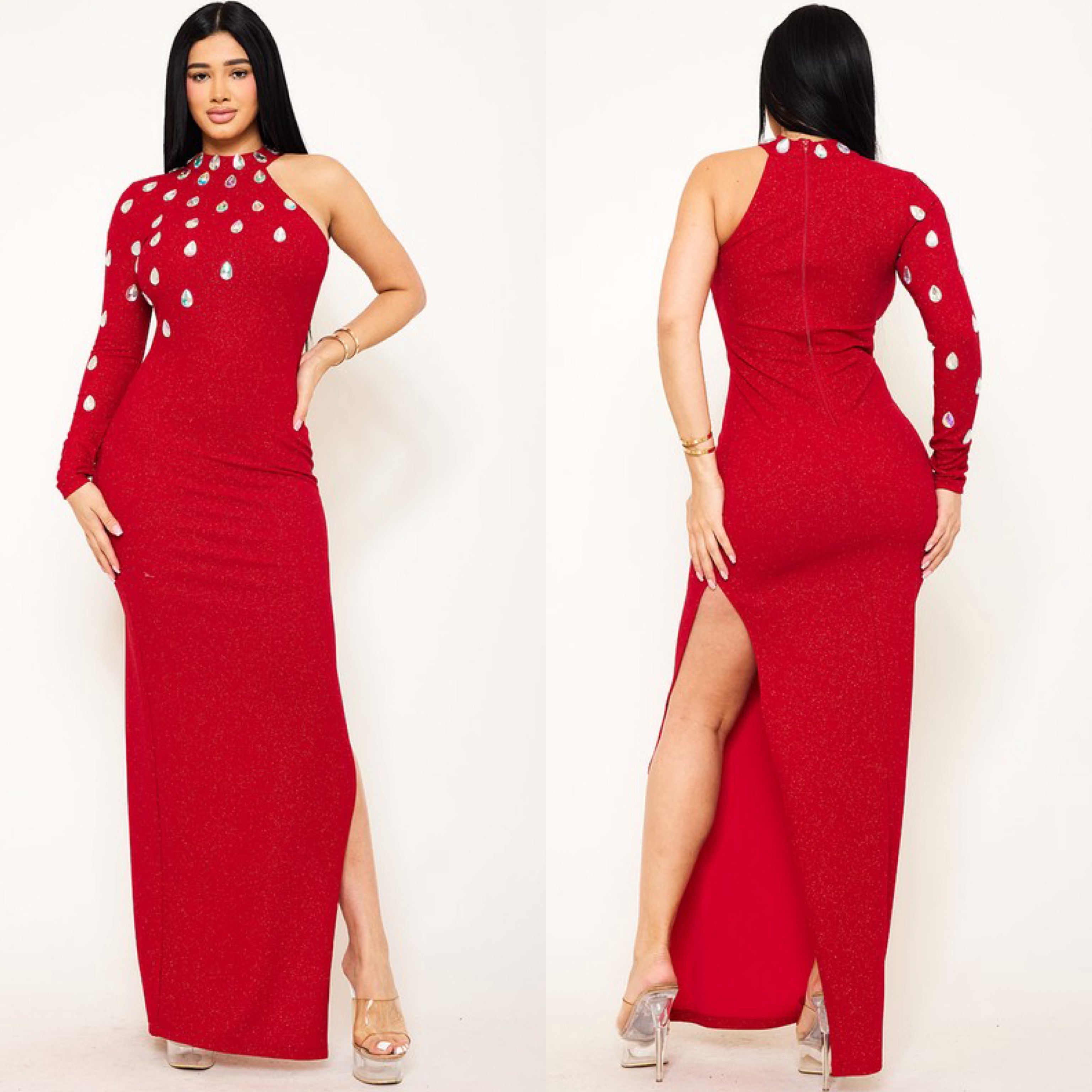 Striking and bold evening gown with a modern and glamorous design. The dress features an asymmetrical one-shoulder neckline, with a single long sleeve adorned with eye-catching teardrop-shaped embellishments, adding sparkle and dimension. The body-hugging silhouette accentuates the figure, and the fabric appears to have a subtle shimmer, enhancing its luxurious appeal.