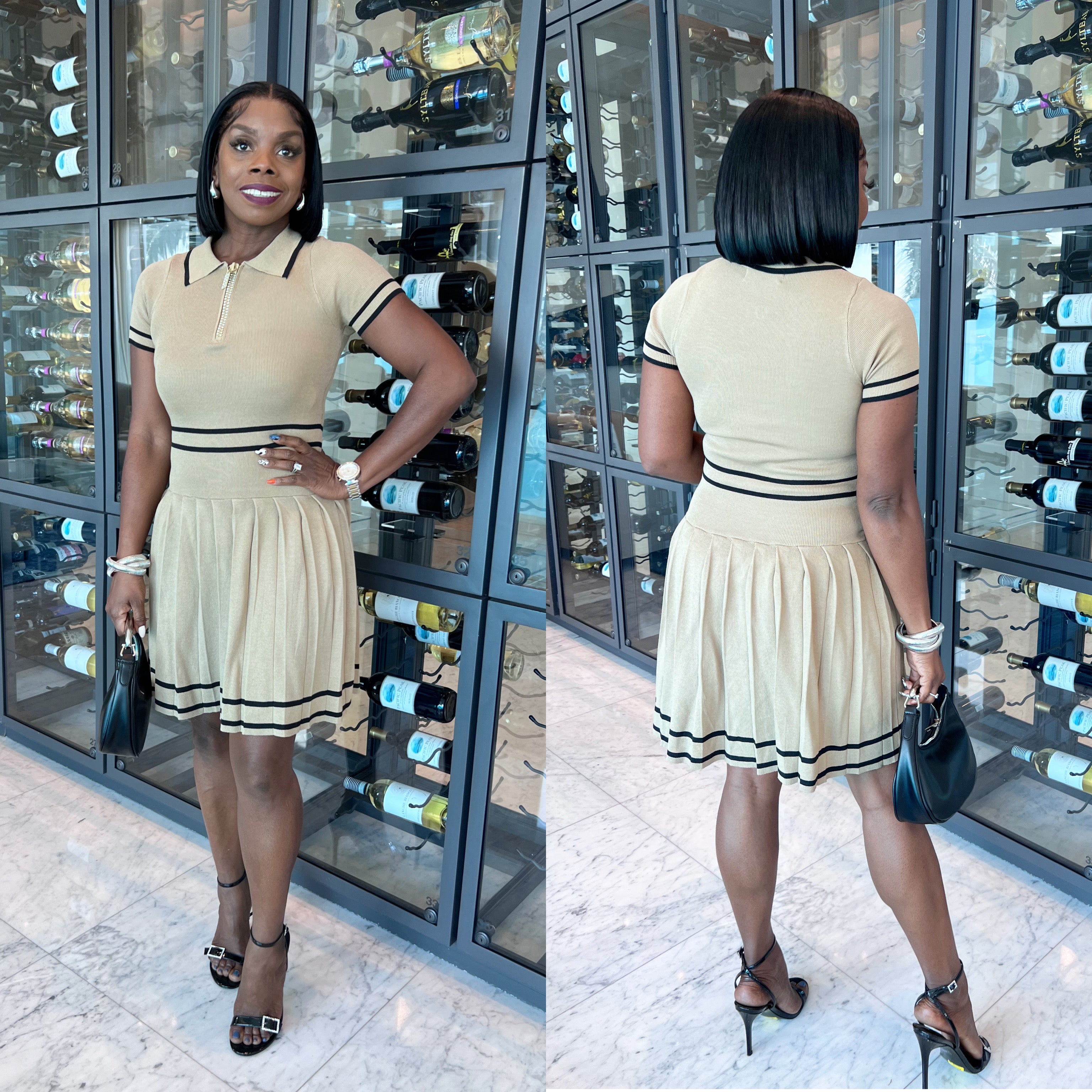 Very stylish short sleeved knit dress combining a preppy, sporty vibe with a touch of elegance, making it versatile for various occasions. The monochrome color scheme and clean lines keep it classic and sophisticated.