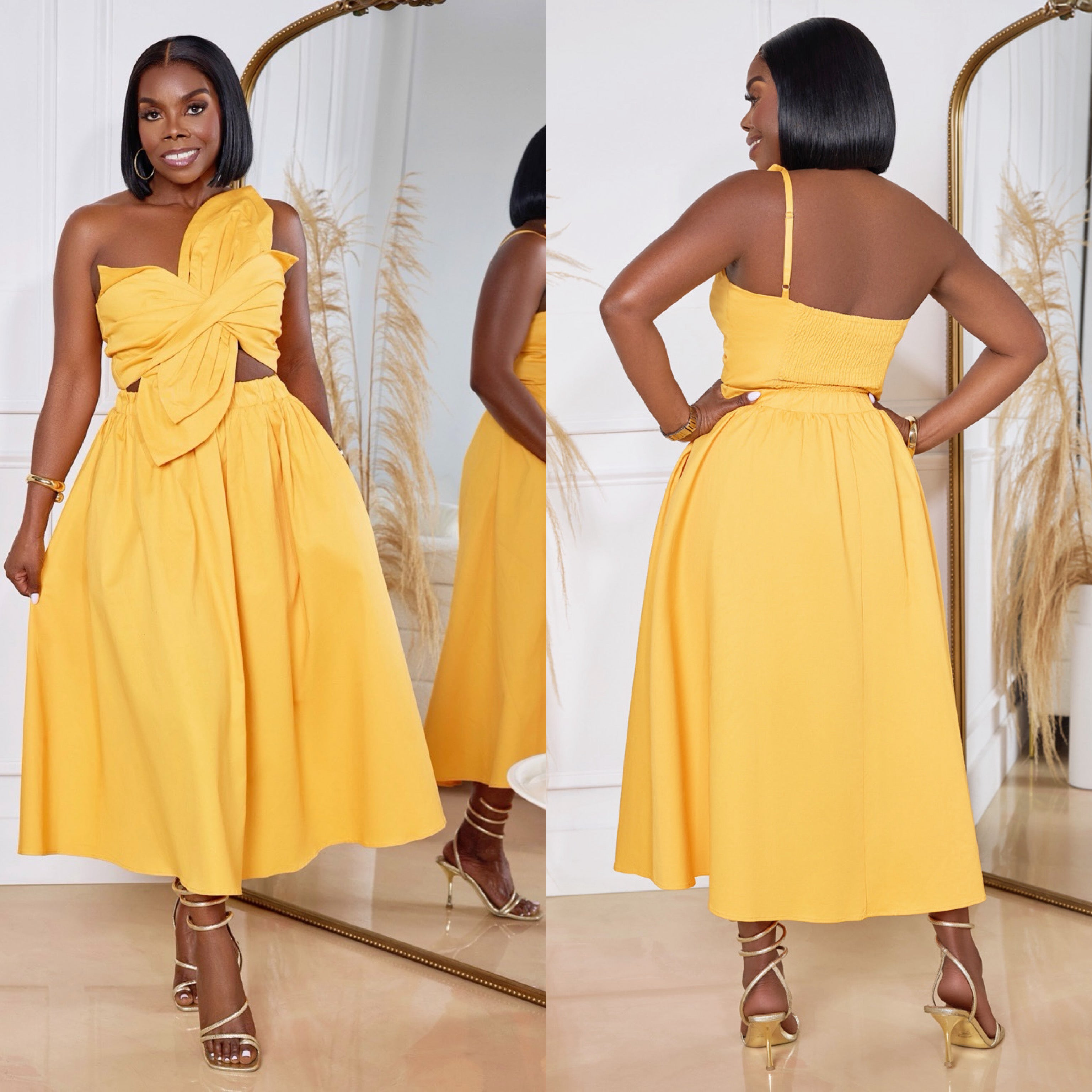 Knot twisted dress in stretch twill fabric. This midi dress features an unique twisted and pleated bow at front, bodice with one shoulder construction with adjustable strap, smocking at back, midi A line skirt with elasticated waist at back, side pockets, and cut out at front.