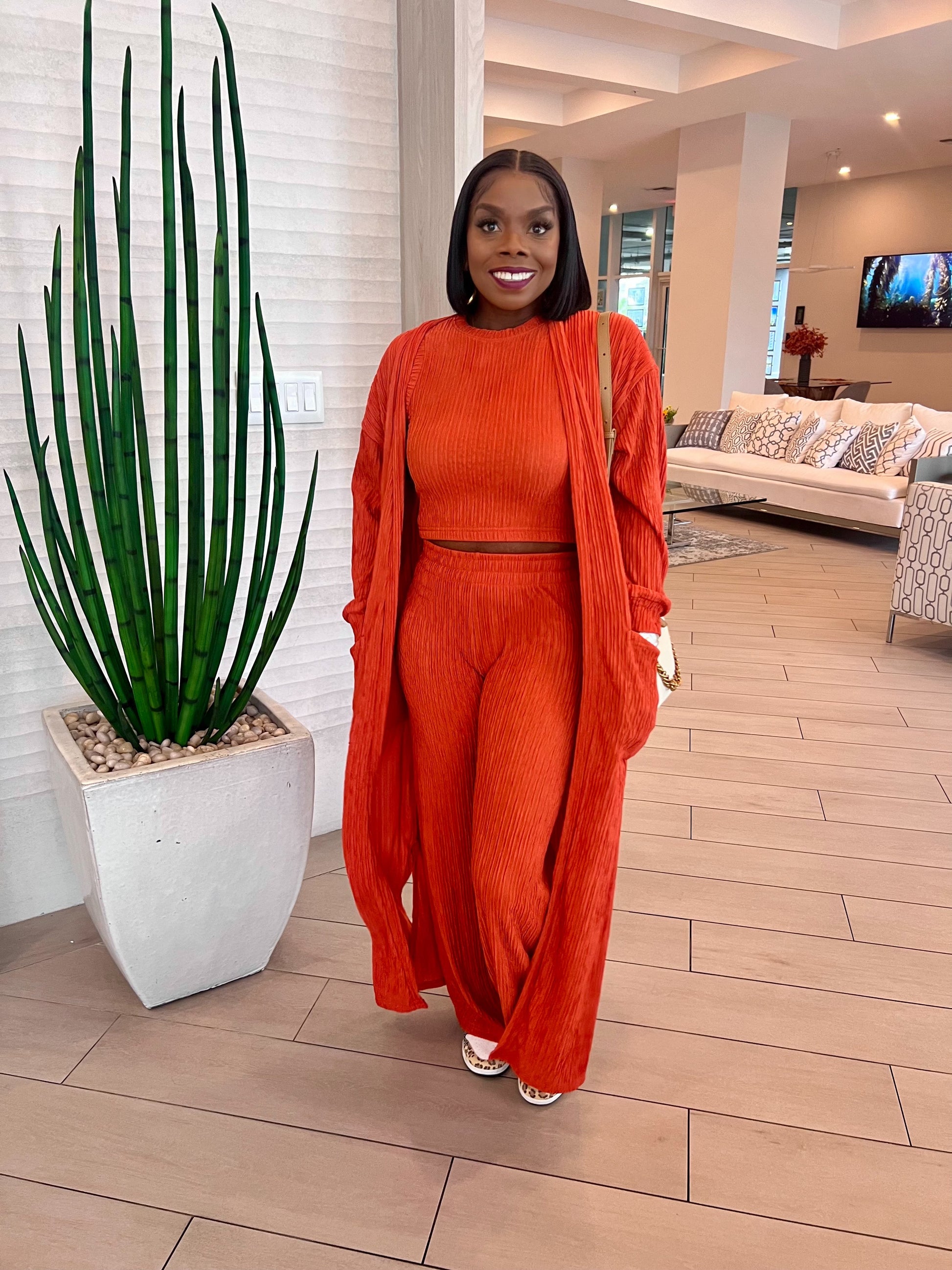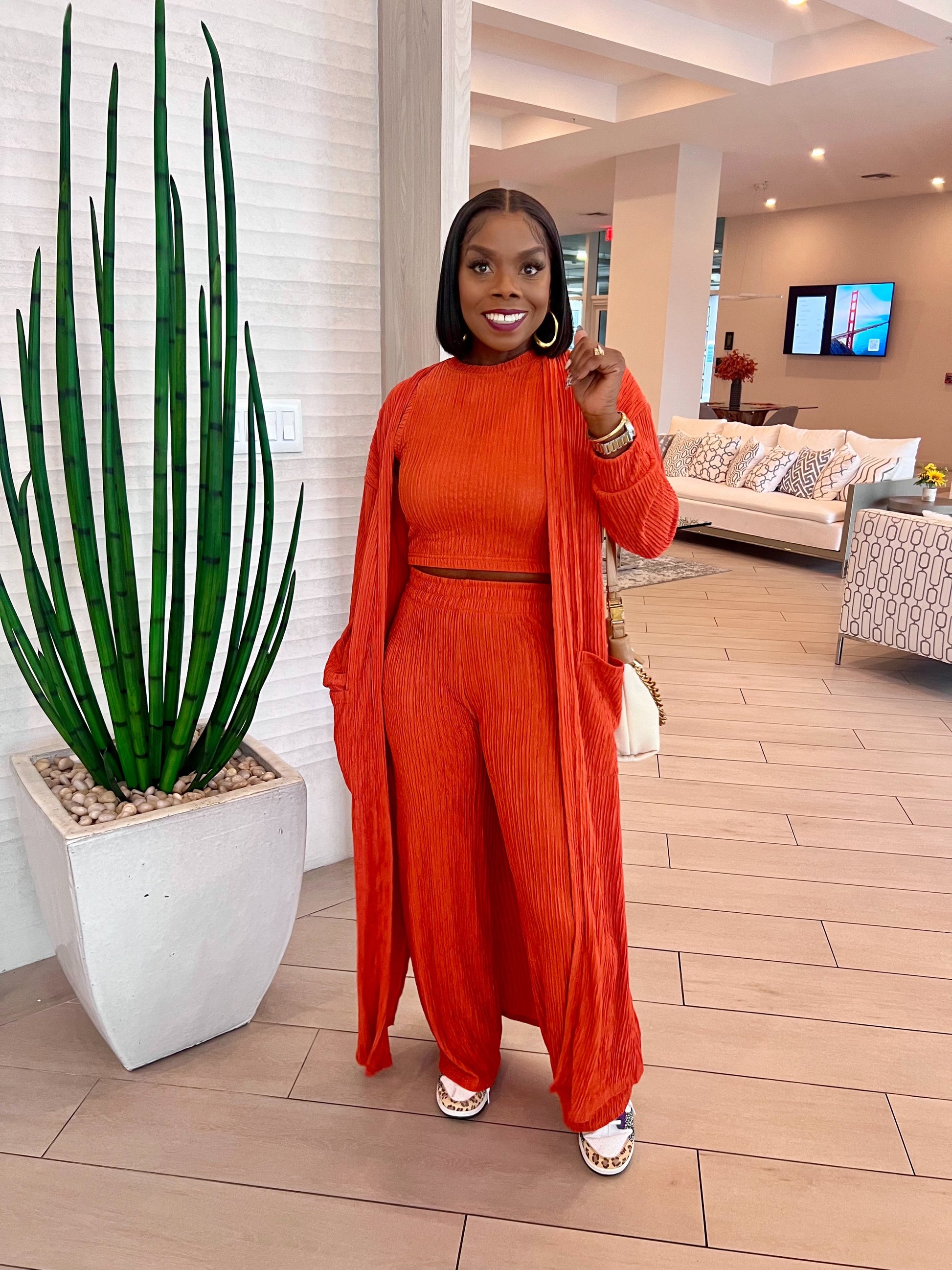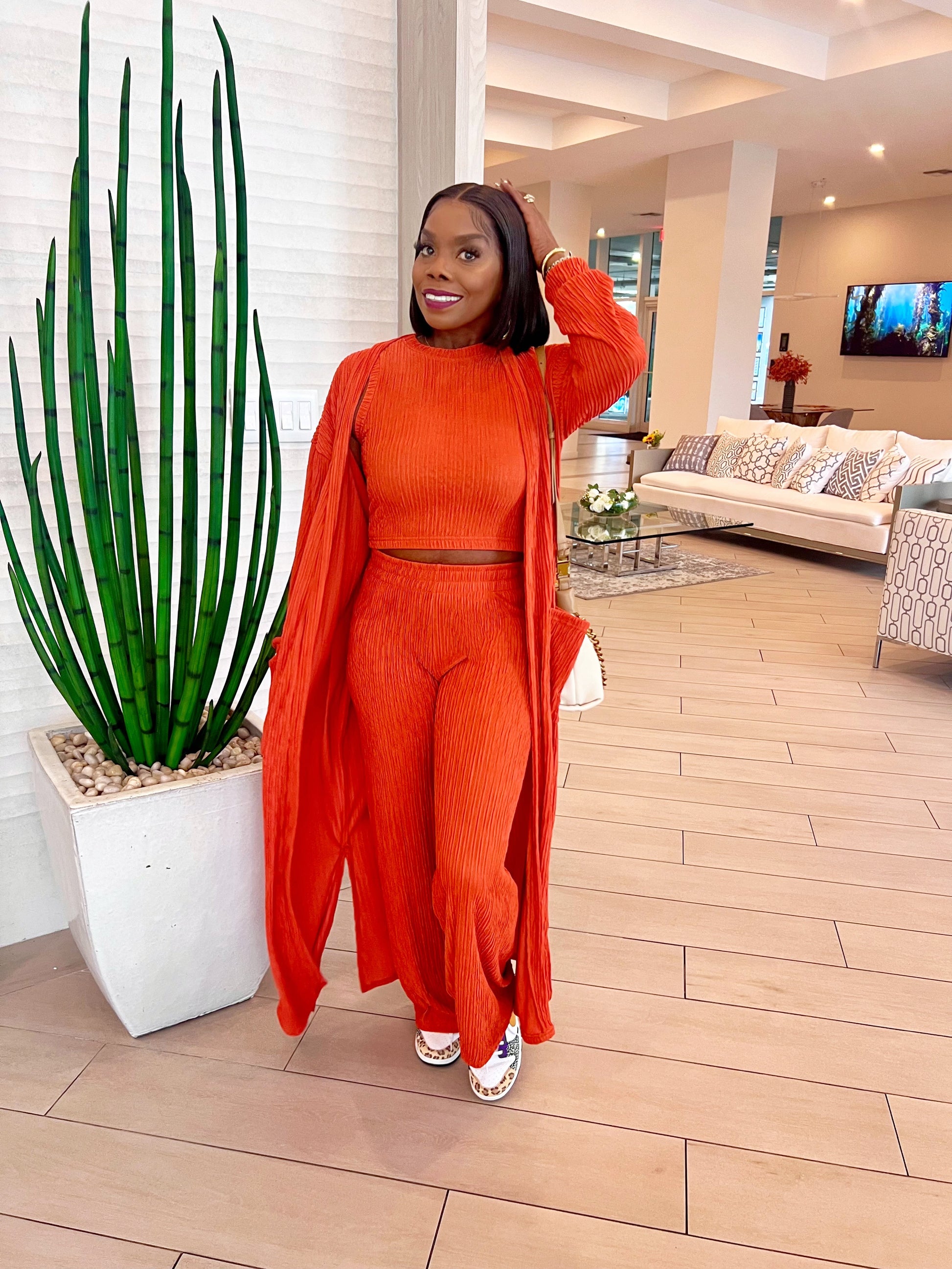 This gorgeous outfit is a bold and chic coordinated set in a bright, vibrant orange hue. The ensemble features: