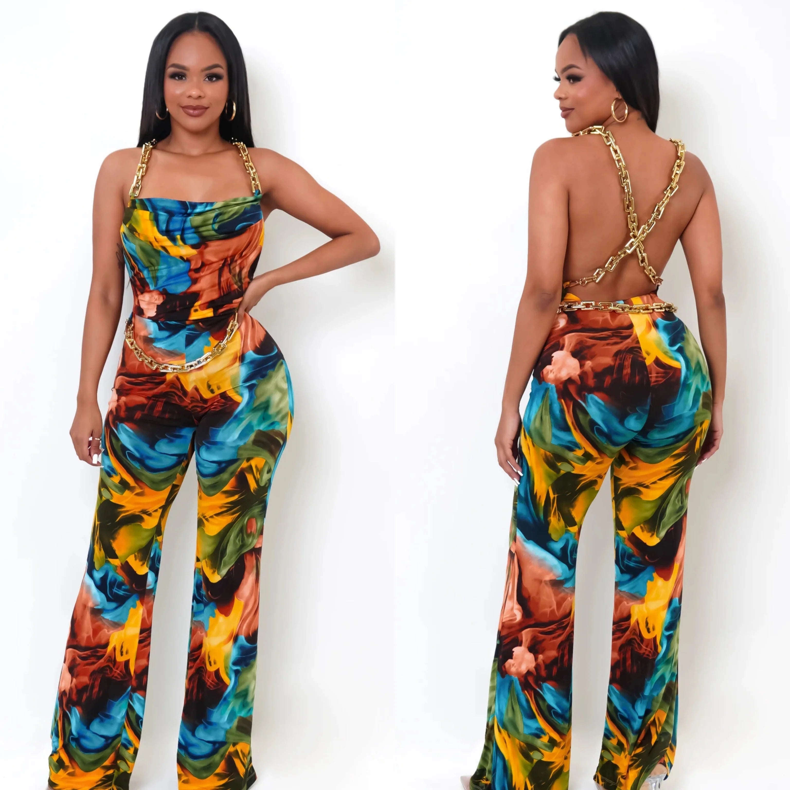 Vibrant and eye-catching jumpsuit features a bold multicolor abstract print in shades of blue, yellow, orange, and green. The sleeveless design is highlighted by thick gold chain straps that add a touch of luxe, with a matching gold chain belt that wraps around the waist, accentuating the silhouette. The back is dramatically open, with the chains crossing for added detail, giving it a sultry yet stylish vibe. The wide-leg fit adds a retro touch, creating an effortlessly chic and bold look, perfect for making a statement!